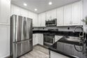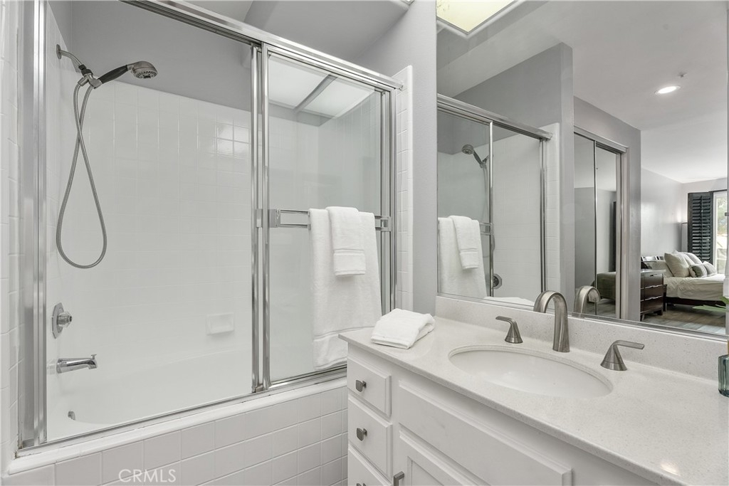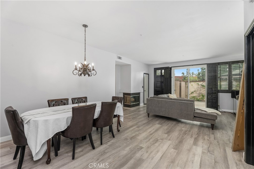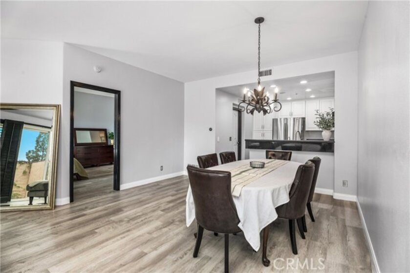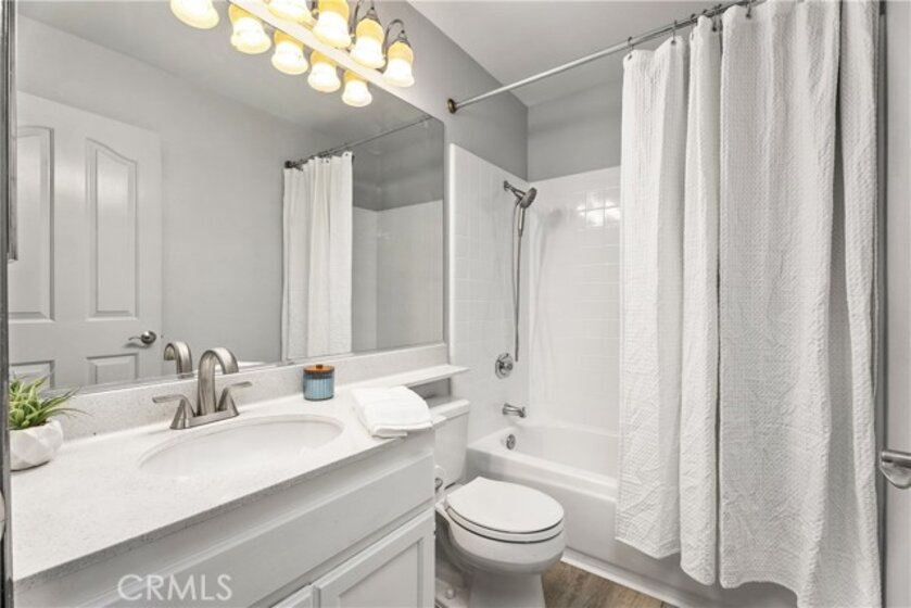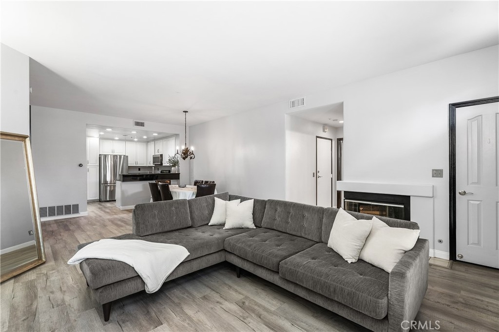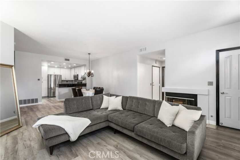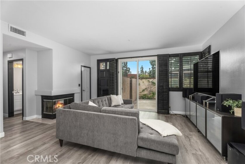 This handsome single-level condo offers the perfect “2-2-2”: 2 Bedrooms, 2 Bathrooms and a 2-Car Attached Garage. Enter through a private walkway into an updated, open-concept home featuring gray-tone wood-style flooring throughout, dual paned windows & sliders, custom shutters, a cozy fireplace and newer HVAC system. The kitchen showcases sleek black granite countertops with breakfast bar, bright white cabinetry, stainless steel appliances, and an indoor laundry room with ample storage. The oversized primary suite includes dual closets and an en-suite bath with a refreshed vanity and tub/shower combo plus a privacy door to the toilet. The secondary bedroom is located on the opposite side of the home for maximum privacy and is adjacent to a refreshed full bathroom. Enjoy a generously sized private patio off the living room—perfect for BBQs and entertaining. Ideally situated in the desirable Arcada tract near parks, community pool, Irvine & Tustin Marketplace, dining, theaters, and easy freeway access.