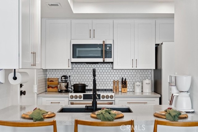 Welcome to this stunning, upgraded 2-bedroom, 1.5-bath condo that exudes modern style and comfort. Step inside to find gorgeous wood-like luxury vinyl flooring flowing seamlessly throughout the home, complemented by fresh, contemporary paint and recessed lighting. The upgraded kitchen features sleek quartz countertops, newer GE Café appliances, and newer cabinetry—perfect for anyone who loves to cook or entertain. Both bathrooms have been tastefully remodeled with stylish finishes and modern fixtures. This meticulously maintained home also includes a whole house fan installed in 2023 for year-round comfort and energy efficiency. The extra-long single-car garage provides plenty of storage space, complete with built-in cabinets. Residents enjoy access to a community pool and well-maintained common areas, all within a secure gated setting. Conveniently located near shopping, dining, freeway access, parks, and top-rated schools, this move-in-ready condo offers the best of Tustin living.