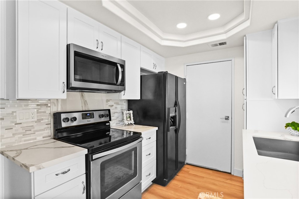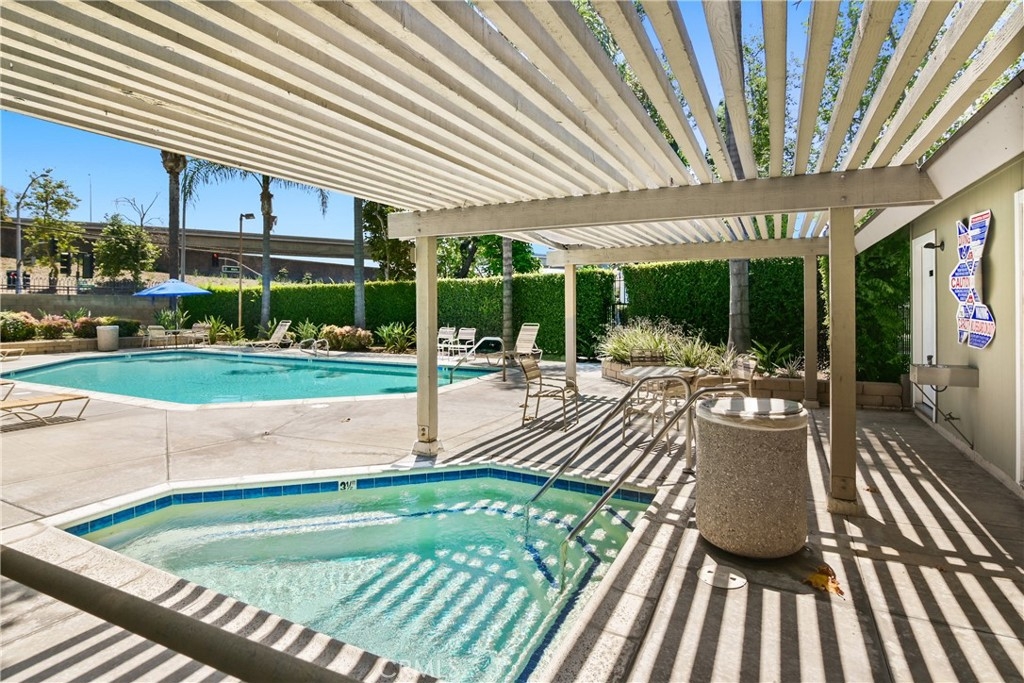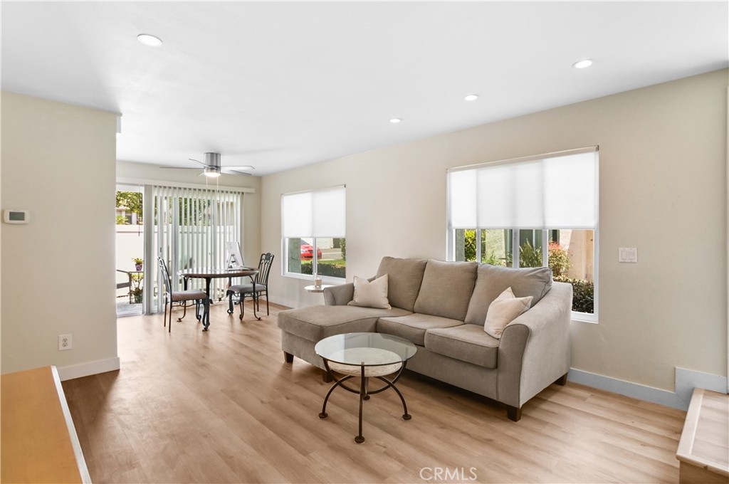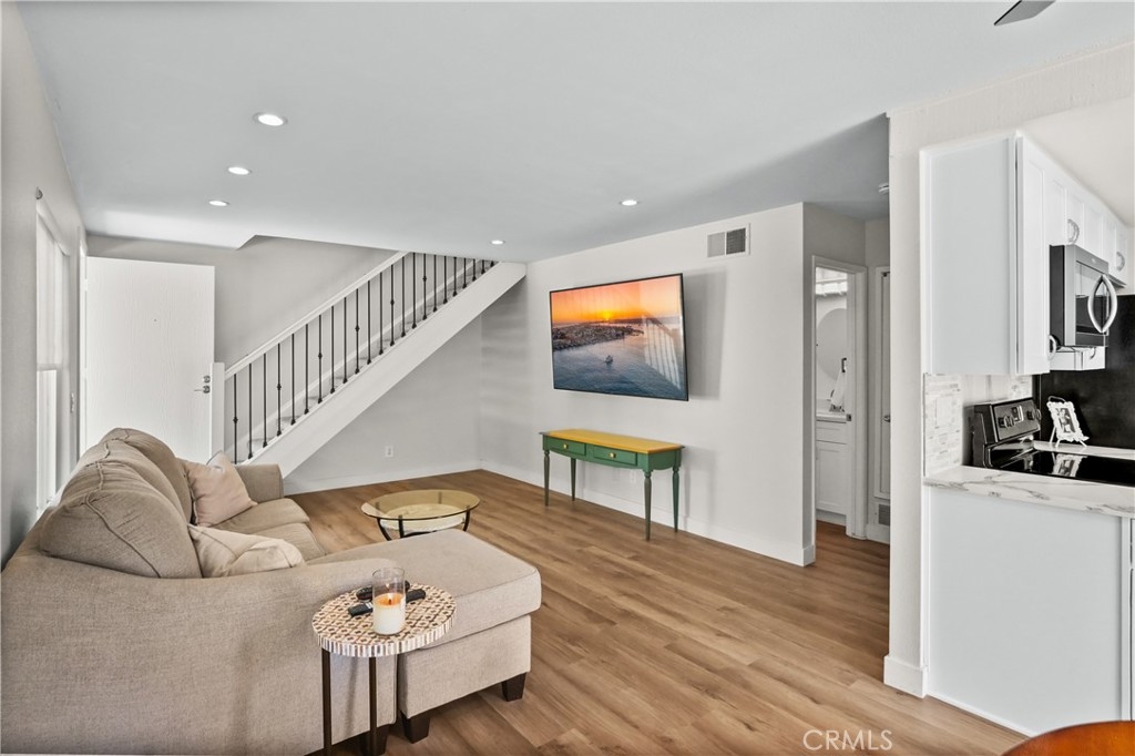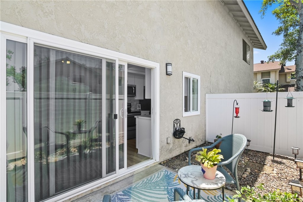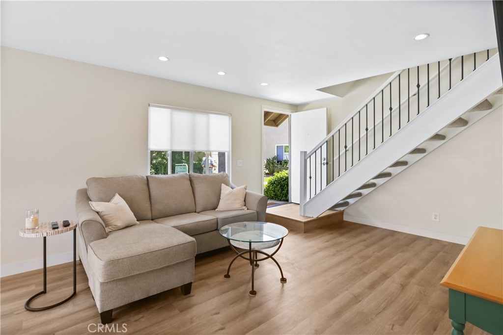 Beautiful two-Story Condo end unit. Beautifully upgraded including new Kitchen Cabinets and Quartz Counter tops. Waterproof Luxury Vinyl Floors, and low profile baseboards, Remodeled baths including walk in shower with new designer marble and Glass barn style shower doors. Dual Payne energy saving windows new paint and ceiling fans throughout, walk in closet in Master bedroom, Sunny patio end unit. Gated community with large pool and spa plenty of parking. Excellent location just blocks from Old Town Tustin, shopping, dining and schools.
