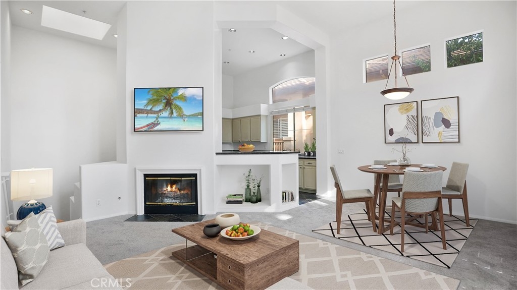 This is your opportunity to live the Tustin Ranch lifestyle! Enjoy the quiet, interior location in the quaint and highly desirable community of Cantada. Freshly painted and new carpet, make it ready for you to move in! Enter the home into the downstairs foyer, accented with slate floors, and you'll find a closet, direct access to your single-car garage, and a separate laundry room with storage. A large skylight over the stairs makes the entry light and bright. At the top of the stairway is an open-concept living space with soaring ceilings and a second set of windows flooding the space with sunlight. The living area opens to the dining room and kitchen, ideal for entertaining family and friends or simply everyday living. The fireplace with a slate hearth is the centerpiece of this open floorplan and can be enjoyed from either the living or dining area. An oversized slider off the living space leads to your private balcony, perfect for unwinding at the end of the day. The dining room also opens to the kitchen, which features granite counters, slate floors, stainless-steel range and microwave, and updated cabinets with tons of storage. The breakfast bar offers additional seating, creating the perfect spot for casual dining. Down the hallway on your left is the secondary bedroom, which offers mirrored wardrobes and vaulted ceilings. Across the hall, the remodeled bath features a newer, rich, dark vanity accented with a white surface. The spacious primary suite features vaulted ceilings and the updated ensuite bath offers white cabinets, dual sinks and a skylight, as well as newer lighting & fixtures. The primary suite includes a large walk-in closet with built-in shelving and mirrored wardrobes. Newer HVAC and water heater. In addition to your single-car, extra-long garage, your assigned carport is just steps away. Enjoy association amenities, including a resort-style pool/spa and BBQ area conveniently located close by. This perfect location is within walking distance to both Peters Canyon Elementary and Pioneer Middle School. Attend top-rated Beckman High. Welcome Home!