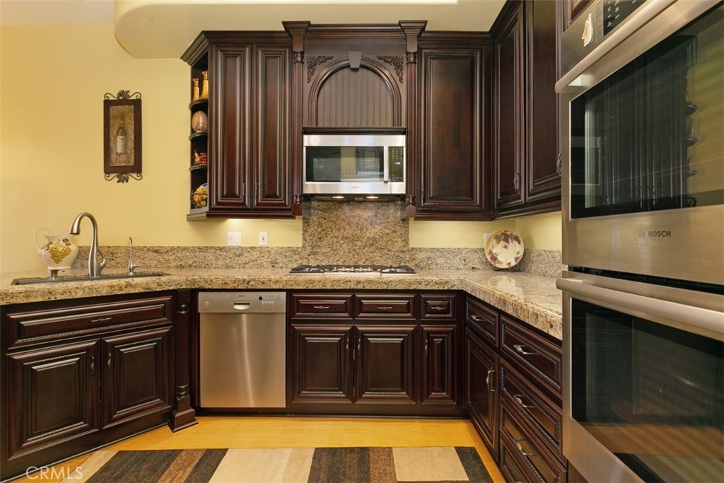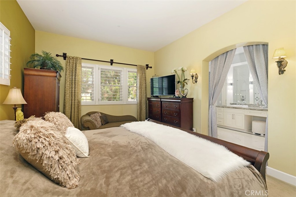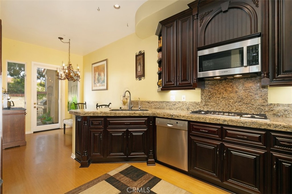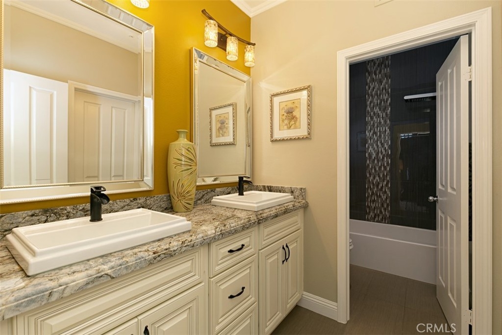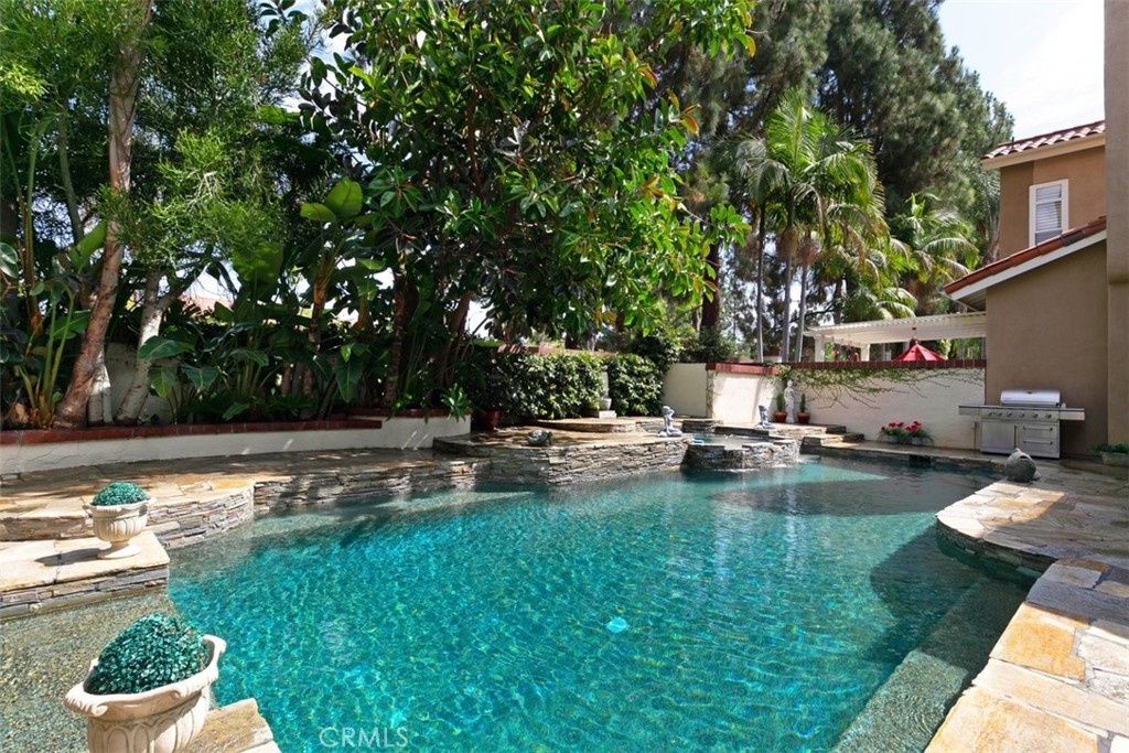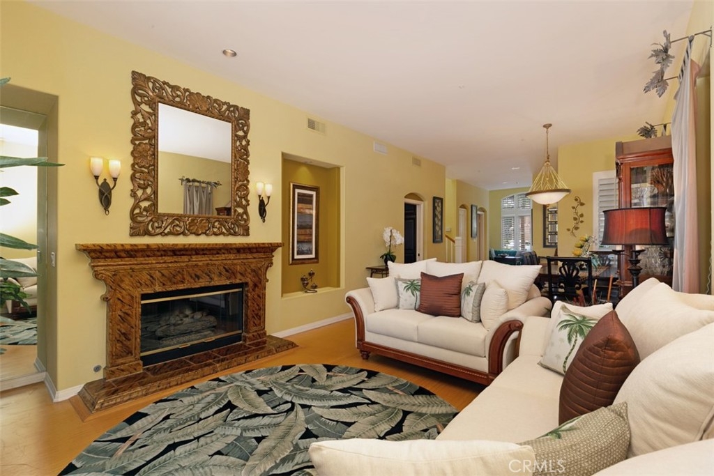 Located in the gated community of Corte Villa in the Tustin Ranch, this turnkey townhome is situated on a large corner lot with a large sparkling pool and spa,. This sun filled home has over $200,000 in upgrades and features high ceilings along with 3 upstairs bedrooms, 2.5 baths, and 2,420sf of living space. As you enter the home, its high vaulted ceilings and large skylight offer lots of natural light. The home flows well from room to room with custom plantation shutters, birch cabinetry, downstairs bamboo wood floors, and custom paint. Cozy up by one of the two gas fireplaces in the living and family rooms. Between your large family room and bright living room there is a half bath/powder room with upgraded granite countertops and touches matching birch cabinets with pull out drawers. The kitchen starts with completely customized floor to the ceiling birch cabinets, stainless steel high-quality Bosch appliances including a 5-burner gas stove top blended into the granite countertops and stainless steel double oven, and a double sink. Master suite with high ceilings to enjoy views of spectacular private yard. As you enter the master bath, you will be stunned by the spa like comfort of the entire upgraded bathroom. The master bath provides the ultimate in spa luxury and comfort featuring virtual single slab quartz floor from floor to ceiling with a gorgeous gray cut-in border, a standalone bath tub with jacuzzi jets, double sink vanity, and custom closet built-ins. The additional 2 bedrooms feature an upgraded Jack-and-Jill bath with custom tiled shower/tub that is adorned with a luxurious shower panel with multiple shower heads & European style accessories. The outdoor area is your luxurious nearly 25,000 gallon Pebbletech saltwater pool/spa and hardscape ground. You are surrounded by the luxury of tropical tropical plants, shrubbery, palms and bird of paradise providing you the privacy from neighbors. Your luxuriously large pool provides you a separate spa/waterfall and a Baja pool for relaxing in a pool chair or perfect for toddlers swimming. Part of the Tustin Ranch HOA with full access to all amenities including Gallery park, pool/spa, tennis courts, playground, and more. Zoned to award-winning schools including the Beckman High School, Ladera Elementary, and Pioneer Middle School. This peaceful retreat is centrally located within a short drive to Tustin Marketplace, Sports park, The District, 5 Freeway, and a short walk over to Tustin Ranch Golf Club.