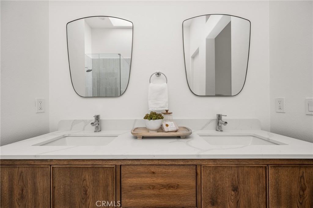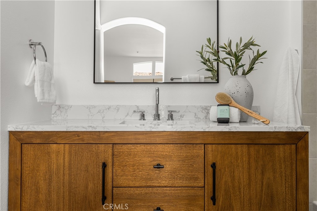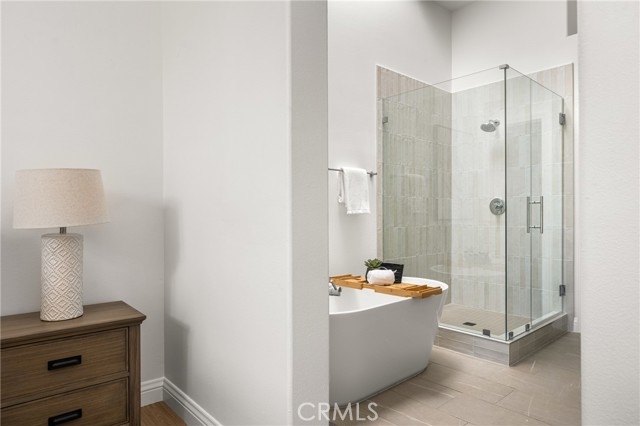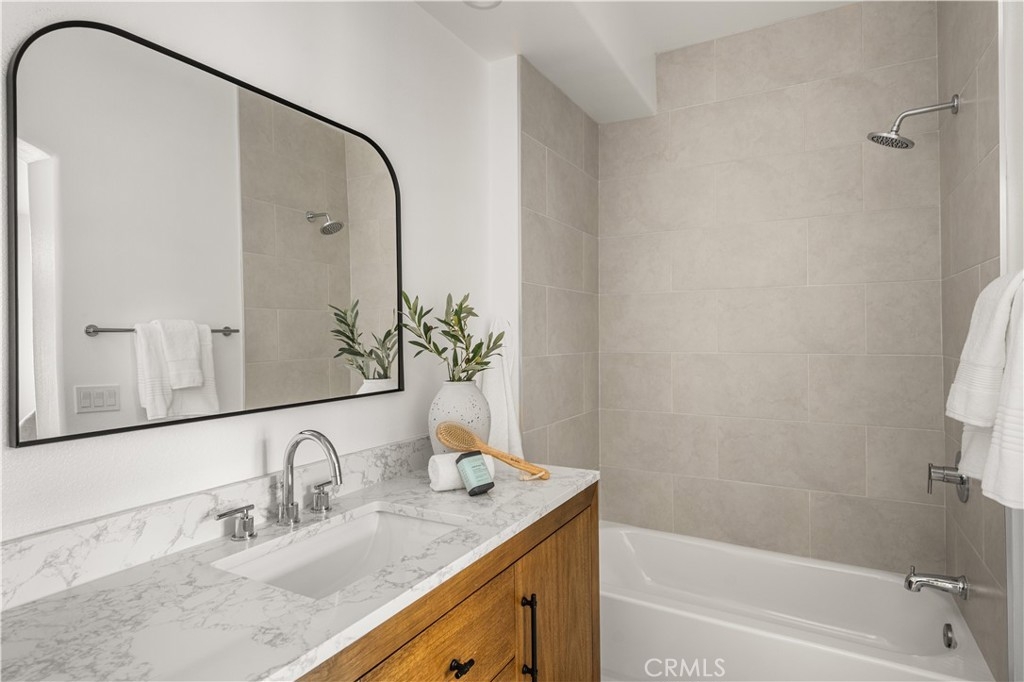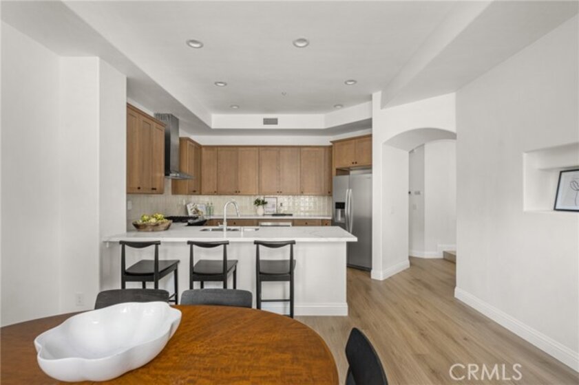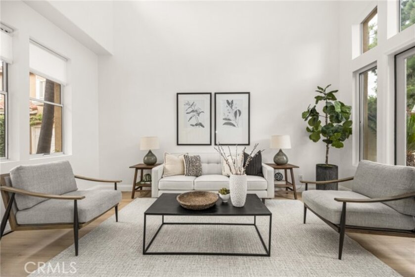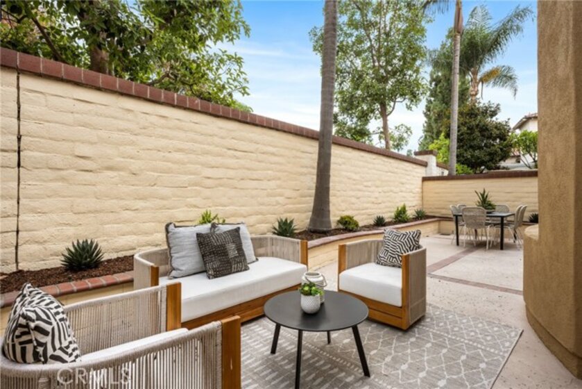 Nestled in a secure gated community within walking distance to the renowned Tustin Ranch Golf Course, this stunning property combines modern elegance with everyday convenience. Shopping, dining, and entertainment are just moments away, making this an ideal place to call home. Step inside to find a fully renovated interior featuring luxury vinyl plank flooring, fresh interior paint, recessed lighting, and designer fixtures throughout. The chef-inspired kitchen boasts sleek quartz countertops, brand-new stainless steel appliances, and custom cabinetry. The home offers spacious bedrooms, including a luxurious primary suite with a beautifully remodeled bathroom showcasing a walk-in shower, soaking tub, and dual-sink vanity. The secondary bedroom is a private en-suite with its own fully updated bathroom—perfect for guests or extended family. Additional highlights include a dedicated laundry room and an attached garage finished with epoxy flooring and drywall for a clean, polished look. Surrounded by Award Winning Schools.