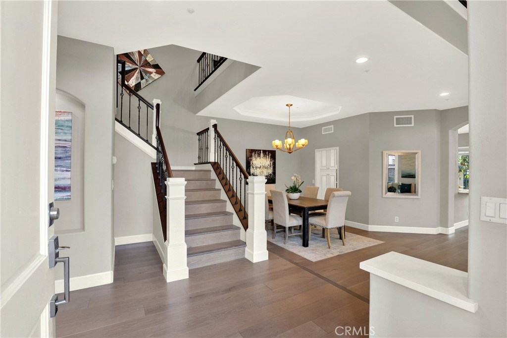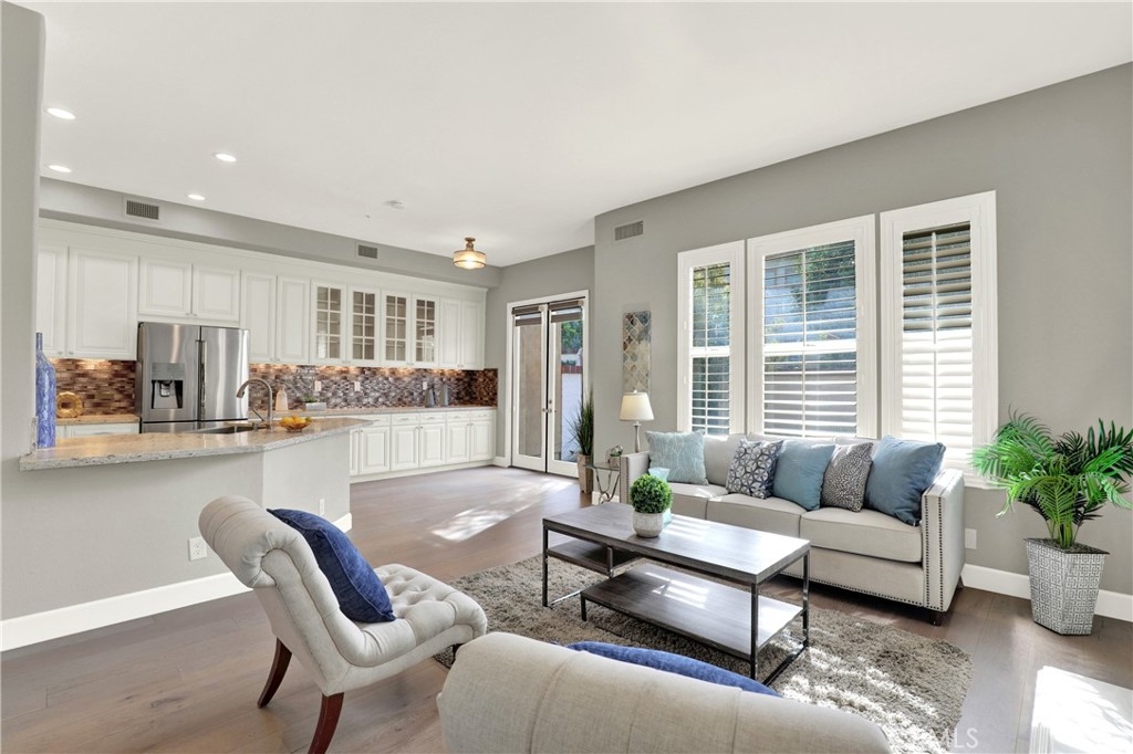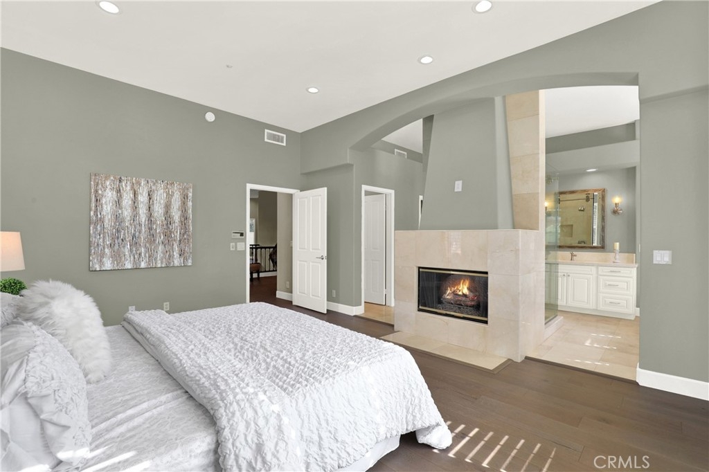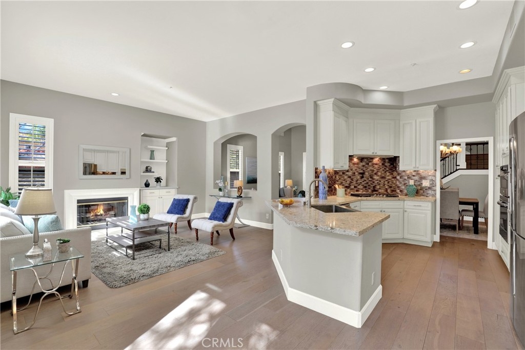 Beautiful Quiet interior end unit within the gated community of Corte Villa. This open-concept design is the largest model in the community. The residence has one bedroom and a full bathroom downstairs. Two secondary rooms a shared bathroom and the Primary Ensuite all located upstairs. All rooms are a generous size. This beautifully upgraded unit boasts natural sunlight throughout. The upgraded kitchen has stainless steel appliances, gas cooktop, quartz countertops, and plenty of storage space. The second floor has a large loft with built-in cabinets and floating shelves that can be used as an office or study area. The unit boasts a separate dining room, living room, and family room with a fireplace. The Primary ensuite has a beautiful fireplace that can be enjoyed as well as a large closet, double showerheads in the Primary bathroom and much much more. Downstairs inside laundry with sink and more storage cabinets. The gated front courtyard area provides added privacy in addition to the beautiful rear patio which is tranquil and beautifully landscaped. Two car attached garage with direct access. Nearby you have the Association amenities which include pools, tennis courts, tot lots, picnic tables and much more. You are also part of the award-winning Tustin school district. Within short distance of Tustin market place and Irvine Spectrum.