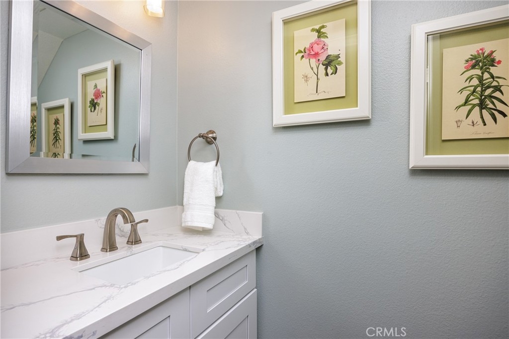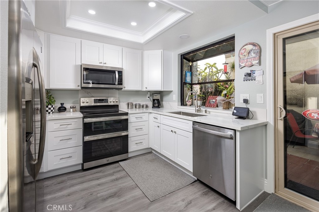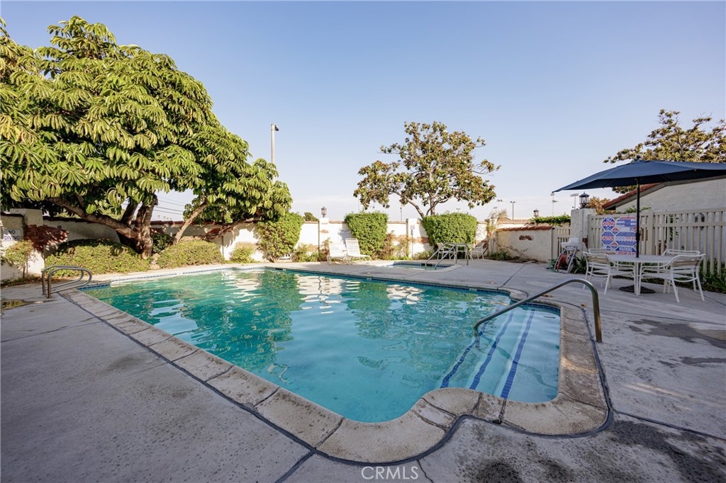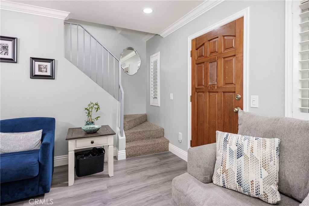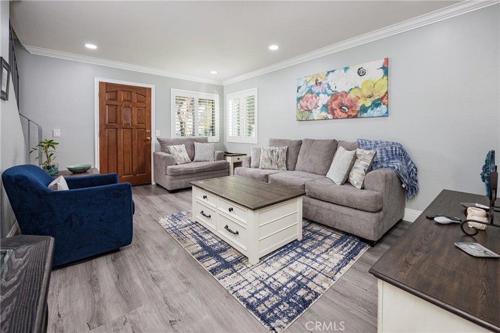 Beautifully upgraded end unit. The lower level has been recently remodeled with plush upgrades. Upgrades include a neutral color palette, vinyl flooring, LED recessed lighting, crown molding, dual-pane windows with plantation shutters, dual pane sliding glass door leading to private patio and garage access, kitchen with white shaker cabinets, soft closing drawers, stainless steel appliances and quartz countertops. Rounding out the lower level is a remodeled powder room and in-unit laundry. The upper level boasts 2 bedrooms and 1 full bathroom with dual vanities. Parking your cars is a breeze with a single-car garage and an assigned off-street parking spot. The sparking community pool and spa are a refreshment from the heat.