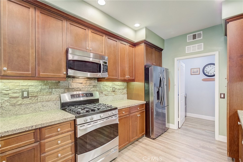 Resort Living!! One of a kind Meriwether Plan 3 home with a brick facade exterior (an upgrade from the builder) located in Columbus Square neighborhood. Perfectly situated between, and close to, both the new Veterans Sports Park and the Clubhouse/Pool areas. A true turnkey property with a wonderful open floor plan and spacious patio with room to bar-b-que, dining space and beautiful tropical plants extending your indoor living space to the outdoors. This home also has a side yard hardscaped with herringbone pavers, and a custom iron gate separating the two areas. As you enter the home, you’re greeted with an open floor plan, beautiful LVP flooring (throughout the home), custom finish wood details, high ceilings and a cozy craftsman detail fireplace. The cook in the family will enjoy the extensive storage in the kitchen, granite counters, stacked stone backsplash, beautiful and abundant cabinetry and stainless steel appliances. Additionally, the counter has been extended with a custom oak counter making it perfect for a breakfast bar. The wall from the living area into the kitchen has been widened, opening up the space. This popular floor plan has 3 bedrooms and 3 full baths with a convenient lower level bedroom and bath. Upstairs, the primary suite has a large walk in closet and a spa like bathroom suite with dual vanities, a soaking tub and separate shower. The upper level is complete with the secondary bedroom, guest bath and a loft area, perfect for those working from home. Other features of the home include crown molding, 5” base boards, and a newer Oak stairway, retractable front door screen. Columbus Square offers resort style amenities including parks, Clubhouse with a Junior Olympic pool, spa, exercise room, and many community events. Close distance to the newly opened Veteran's Sports Park, the Village of Tustin Legacy shopping center and zoned for Heritage Elementary and the Legacy Academy Middle and High Schools. Close to the District, OC airport, beaches and freeways and the Flight Mess Hall. Welcome Home!