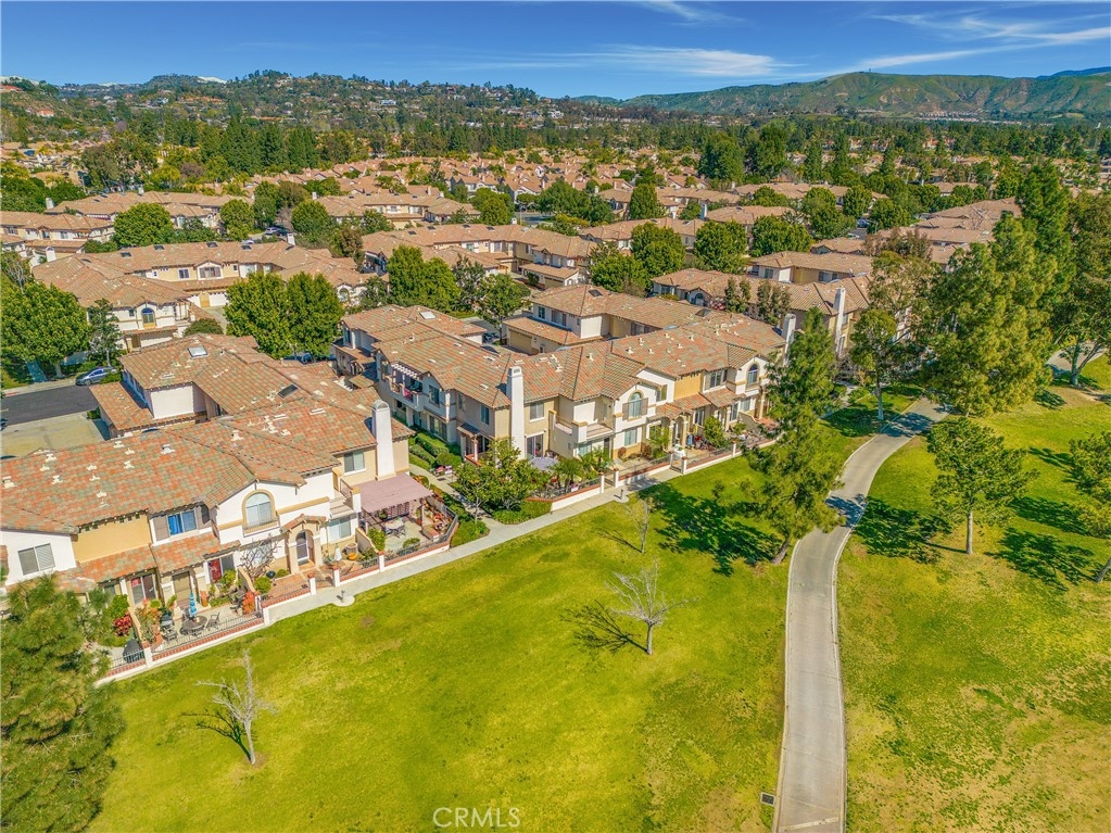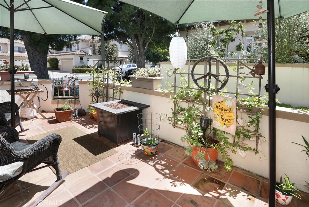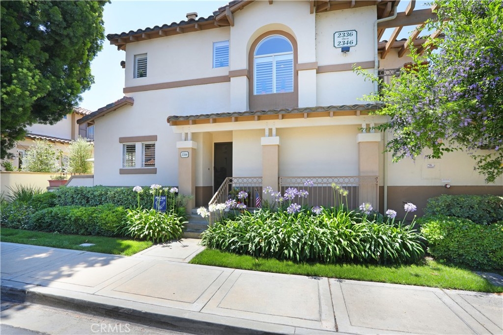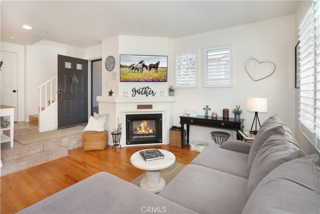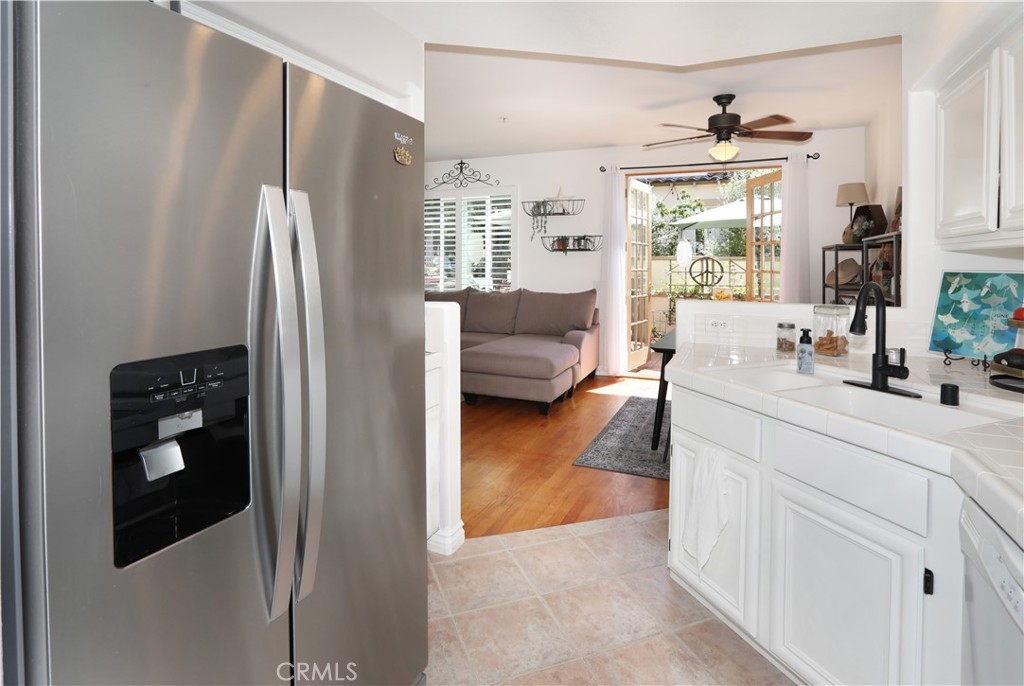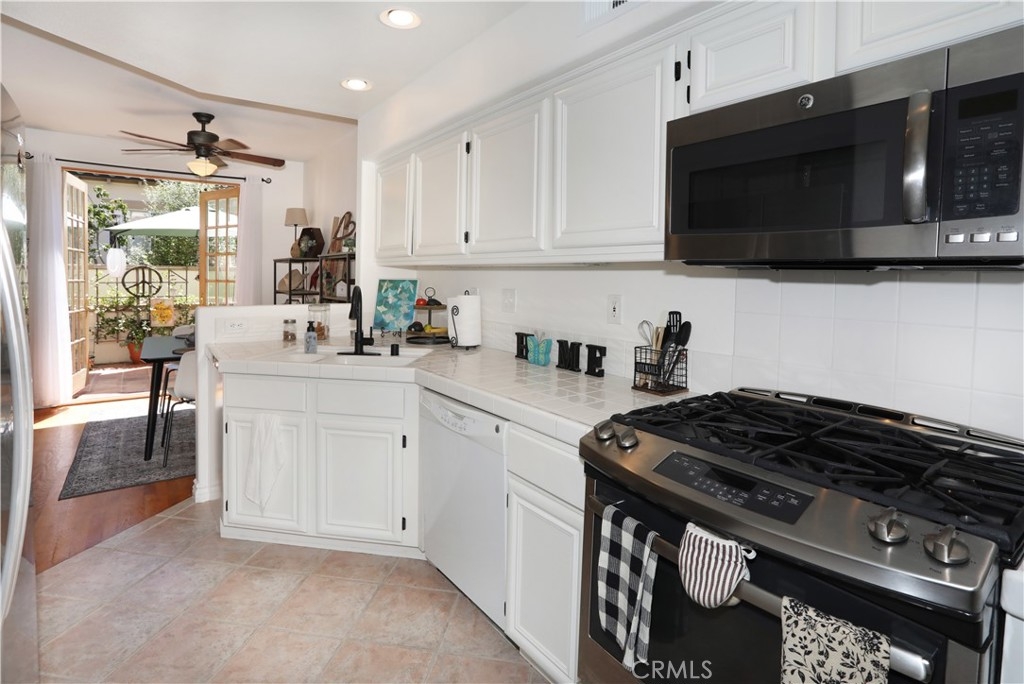 Rarely on the market, END UNIT in GOLF community of The ORCHARDS. This light and bright Modern Farmhouse Style 2 BEDROOM and 2.5 BATH, 2 story CONDO. Each bedroom has own private bathroom! Freshly painted SIMPLY WHITE with wood flooring, upgraded black fixtures, stainless appliances in kitchen including newer REFRIGERATOR, WASHER and DRYER upstairs included, 2 baths remodeled, half bath downstairs, ceiling fans, NEW WINDOWS w/PLANTATION SHUTTERS, NEW WATER HEATER, NEW AC, charming FRENCH DOORS with retractable screen leading to relaxing patio great for morning coffee or glass of wine at the end of a long day. Cozy FIREPLACE in living room with TV mounted above also included. Just steps away from Tustin Ranch Golf Course. You will appreciate the ATTACHED TWO CAR GARAGE with storage racks included. Easy access garage right on the end. HOA amenities include Pool, Spa, BBQ, Tot Lot, Tennis/Pickleball. Conveniently located to Market Place and District Shopping, Restaurants, Parks, Excellent Schools, Peters Canyon Hiking Trails. Low Mello Roos $541 per year and low HOA $280 per month.