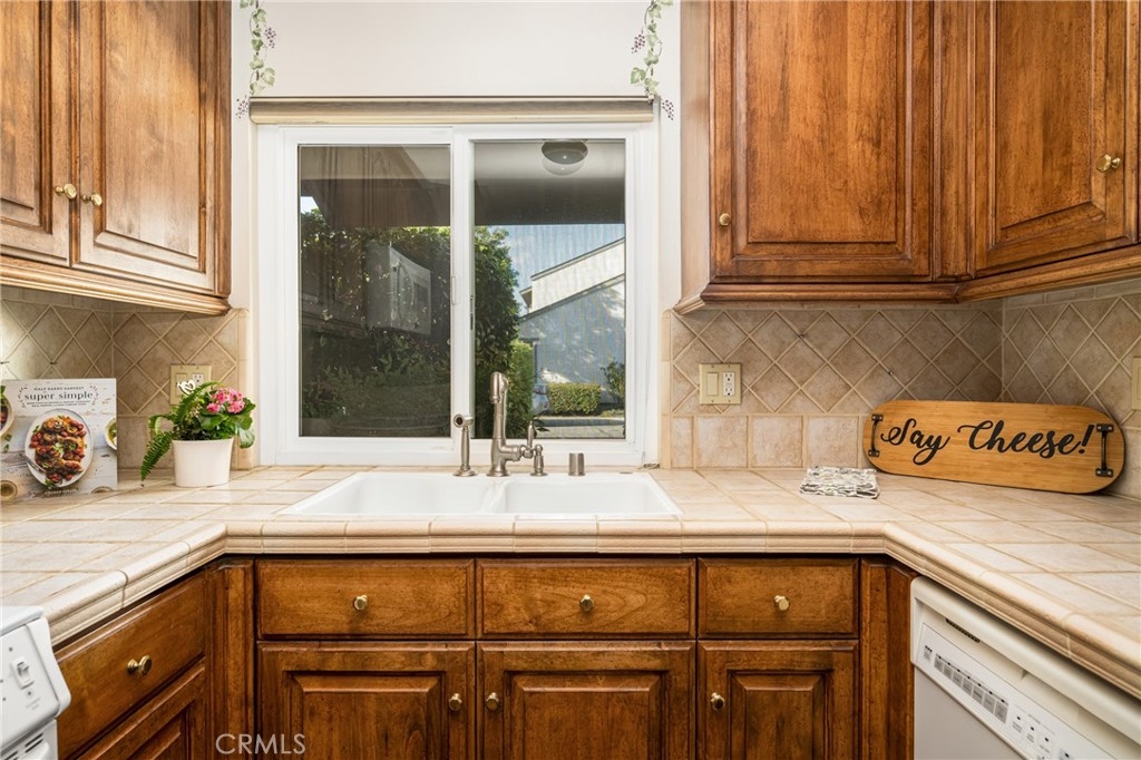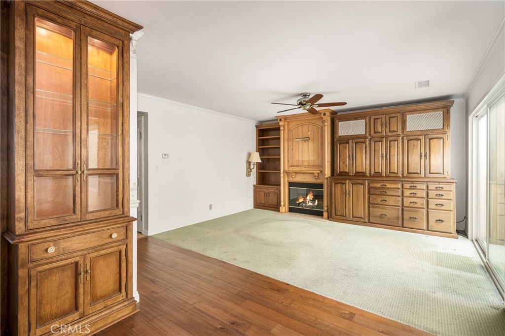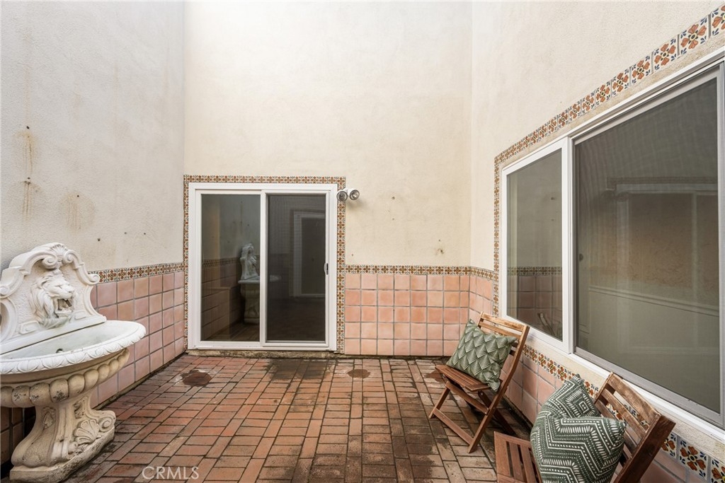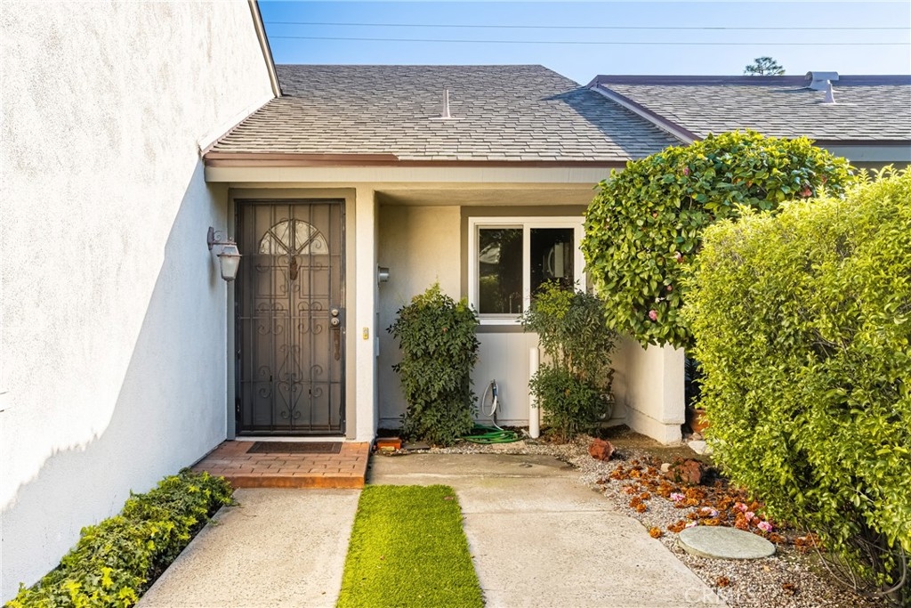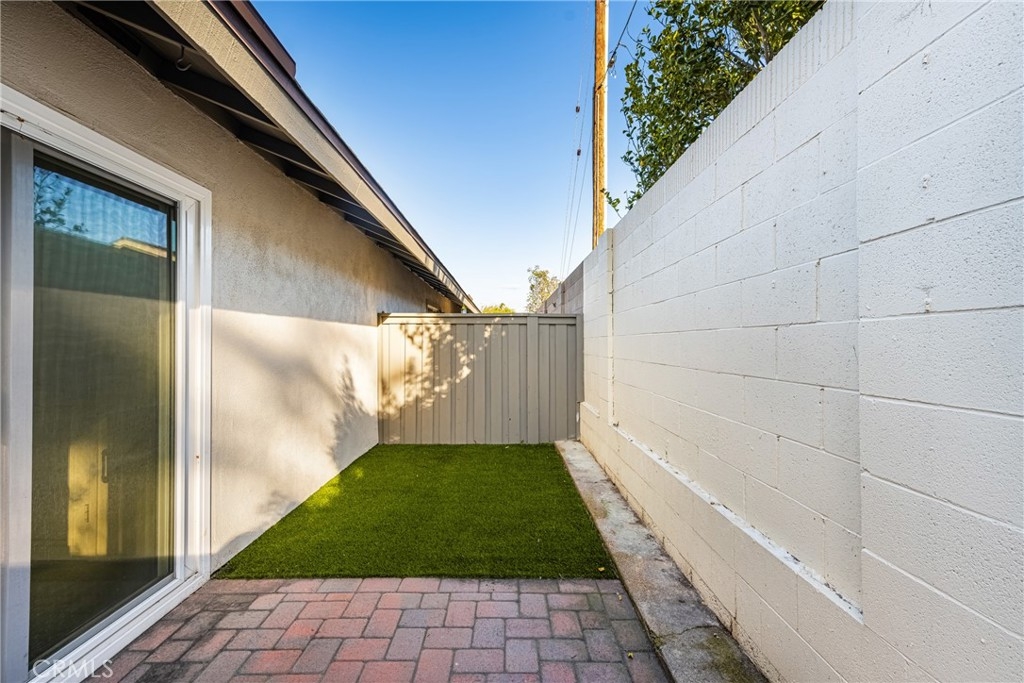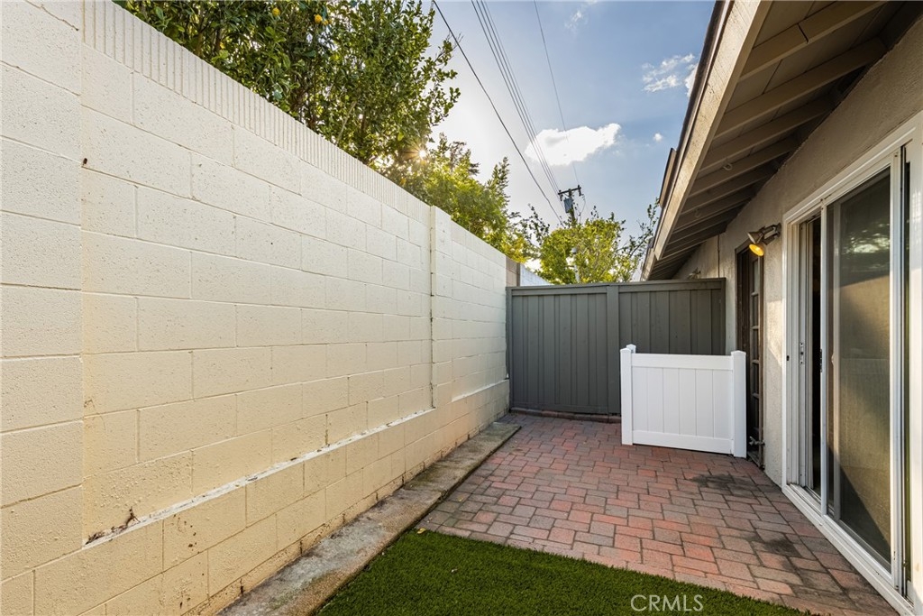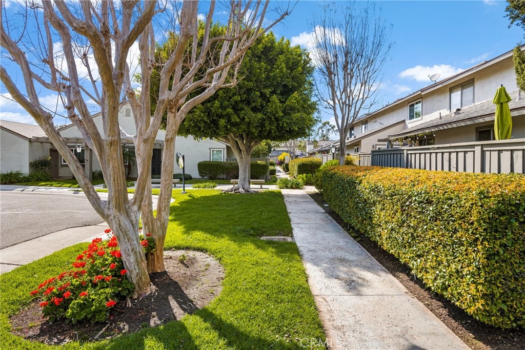 Welcome to the Park Tustin Community where properties seldom hit the market! This 2 bed, 2 bath single level condo is nestled in a highly desirable neighborhood close to shopping, dining, freeway access and sought after schools. The front living room boasts a beautiful custom built-in entertainment center complete with fireplace & bookshelves creating a warm and relaxing atmosphere. The adjacent dining area with wood plank laminate flooring features a built-in buffet cabinet to display your special treasures. The chef of the home will love the kitchen with rich wood cabinets, tiled counter tops & backsplash, and white appliances. The guest bath with tub has a custom wallpapered mural and dark wood vanity. The rear primary bedroom with attached bathroom has access to the fenced rear patio with artificial turf and stone paver sitting area. A beautifully tiled walk-in shower with glass enclosure is located in a separate area from the custom vanity and changing area. The 2nd bedroom offers large built-ins and a desk area for working from home, or a great reading retreat. The center atrium with access from the living room and 2nd bedroom, allows wonderful natural light to flow through the home. A European fountain adds to the charm of this additional outdoor space. An attached 1-car garage houses the washer and dryer hook ups and an extra parking space is conveniently located just outside the front door. Air conditioning, dual pane windows and doors, ceiling fans, walk-in closet, wood wainscoting and more! This community also offers an association pool, spa and clubhouse for your enjoyment!