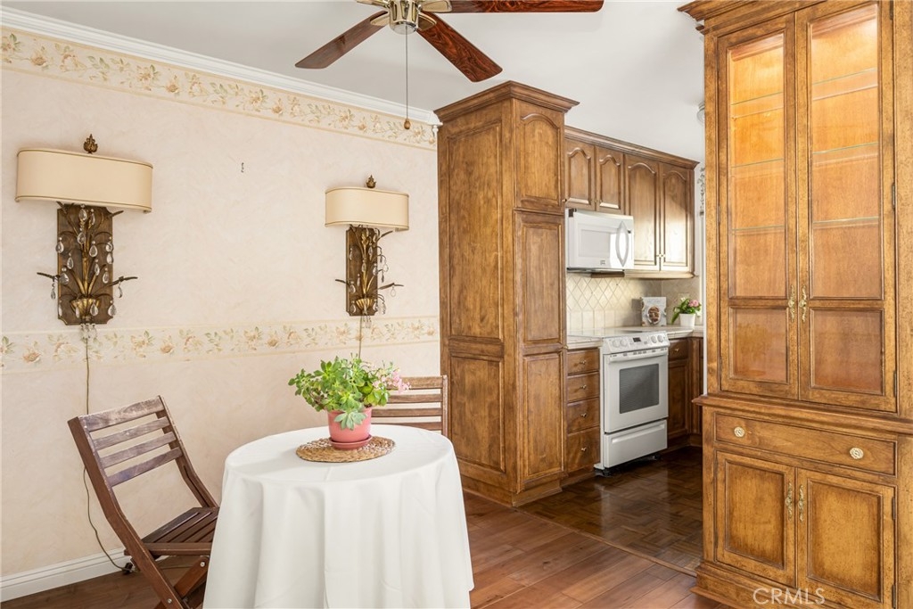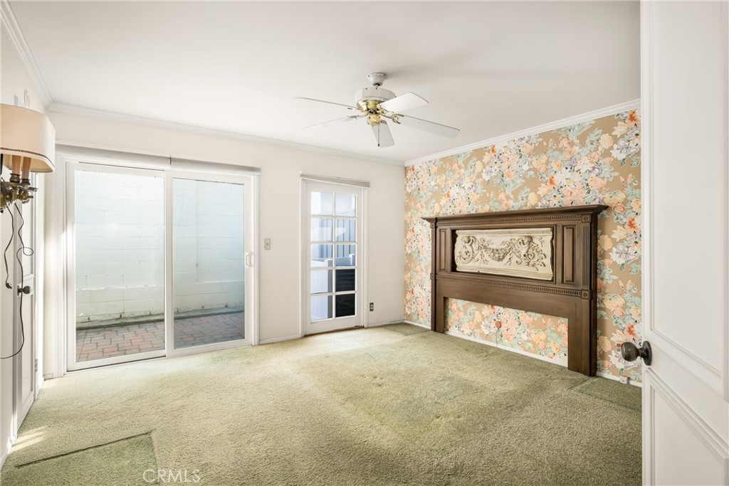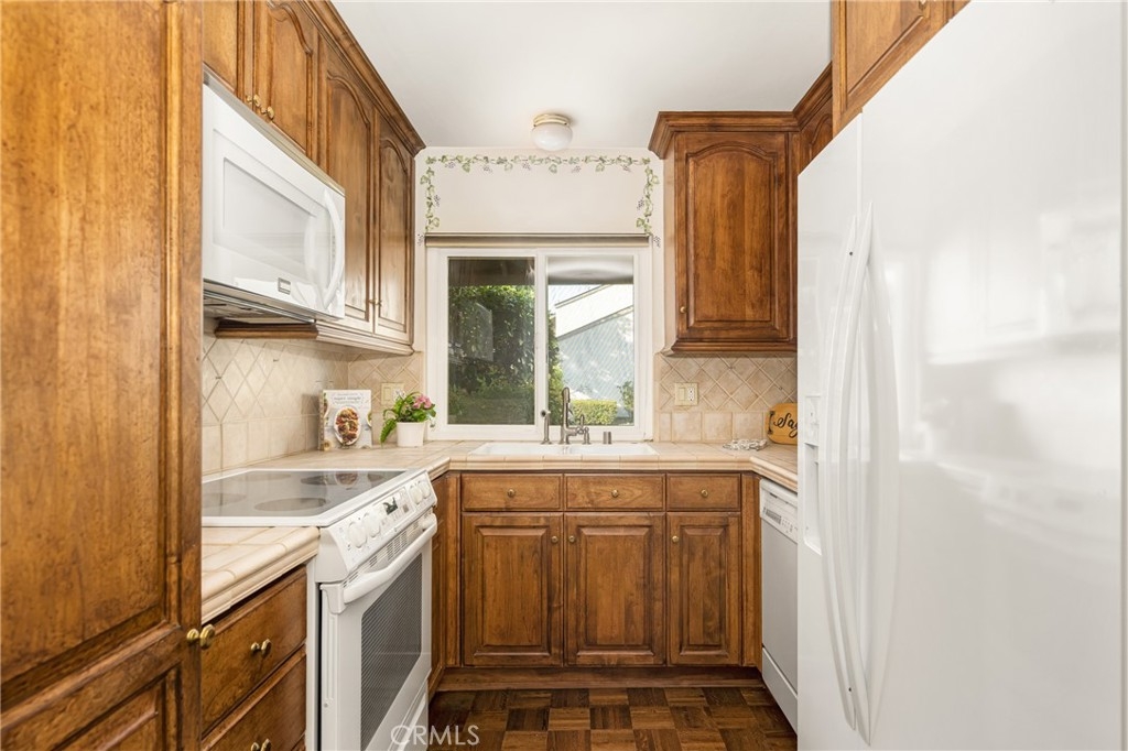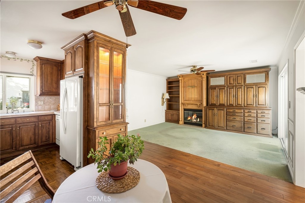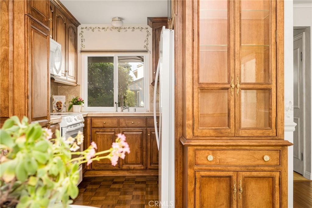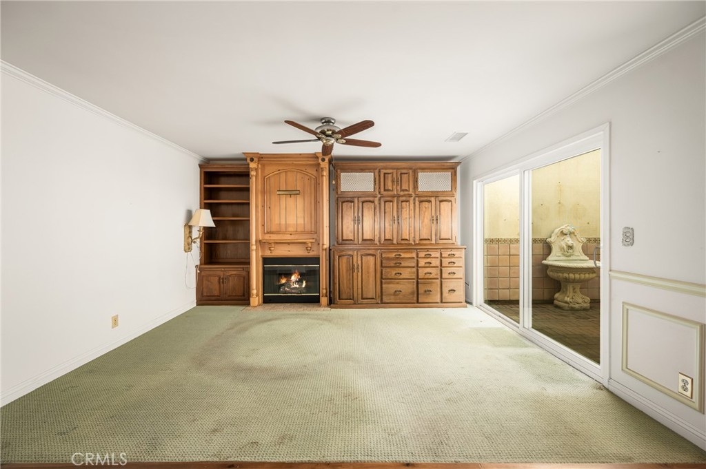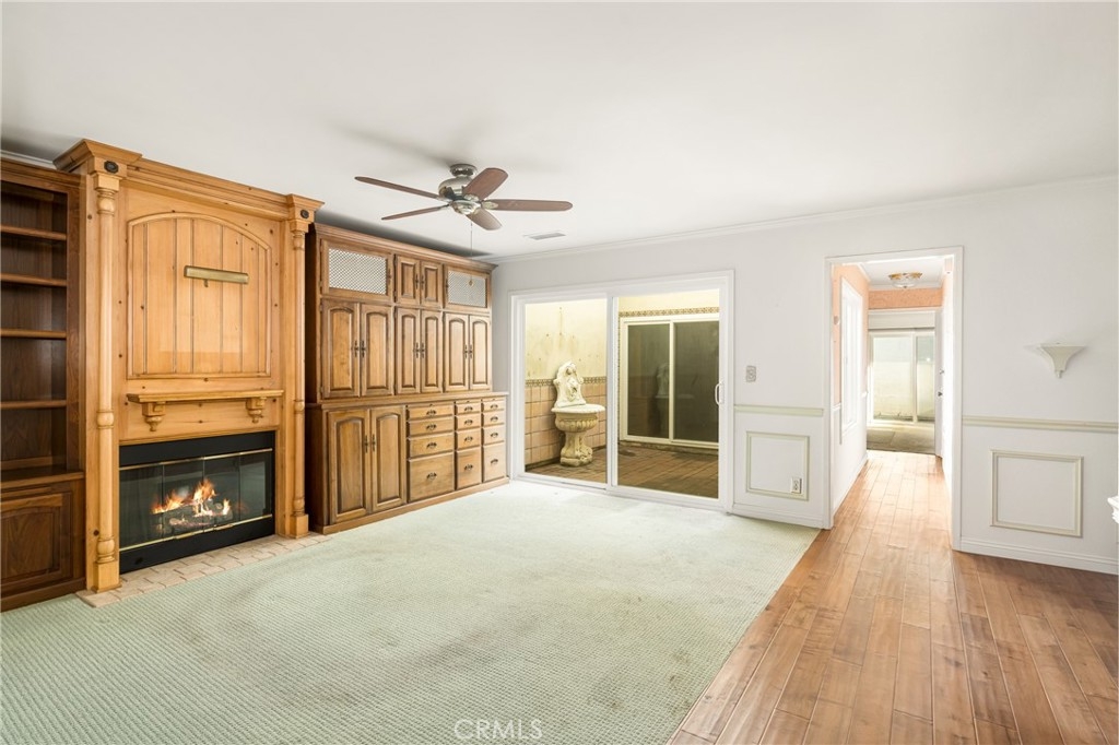 Welcome to the Park Tustin Community where properties seldom hit the market! This 2 bed, 2 bath single level condo is nestled in a highly desirable neighborhood close to shopping, dining, freeway access and sought after schools. The front living room boasts a beautiful custom built-in entertainment center complete with fireplace & bookshelves creating a warm and relaxing atmosphere. The adjacent dining area with wood plank laminate flooring features a built-in buffet cabinet to display your special treasures. The chef of the home will love the kitchen with rich wood cabinets, tiled counter tops & backsplash, and white appliances. The guest bath with tub has a custom wallpapered mural and dark wood vanity. The rear primary bedroom with attached bathroom has access to the fenced rear patio with artificial turf and stone paver sitting area. A beautifully tiled walk-in shower with glass enclosure is located in a separate area from the custom vanity and changing area. The 2nd bedroom offers large built-ins and a desk area for working from home, or a great reading retreat. The center atrium with access from the living room and 2nd bedroom, allows wonderful natural light to flow through the home. A European fountain adds to the charm of this additional outdoor space. An attached 1-car garage houses the washer and dryer hook ups and an extra parking space is conveniently located just outside the front door. Air conditioning, dual pane windows and doors, ceiling fans, walk-in closet, wood wainscoting and more! This community also offers an association pool, spa and clubhouse for your enjoyment!