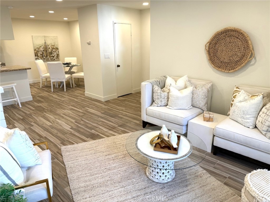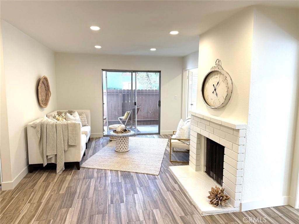 Ground Floor End Unit Two Bedroom Condominium. Just completed $20,000 in upgrades and appliances! It looks spectacular! Wood floor looking tile, open kitchen area, dining room, fireplace, patio, and two nice sized bedrooms. Light and bright!! This unit includes a Garage plus additional open parking spaces both up and below in a dedicated parking garage. Enjoy the amenities such as a pool, spa, and a tennis court! Great location near restaurants, shops, groceries, and the freeway. You could walk or bike to many of these locations easily. Ideal for someone who wants or needs ground floor living. Be ready to jump on this property as soon as it goes live! You don't want to miss it!