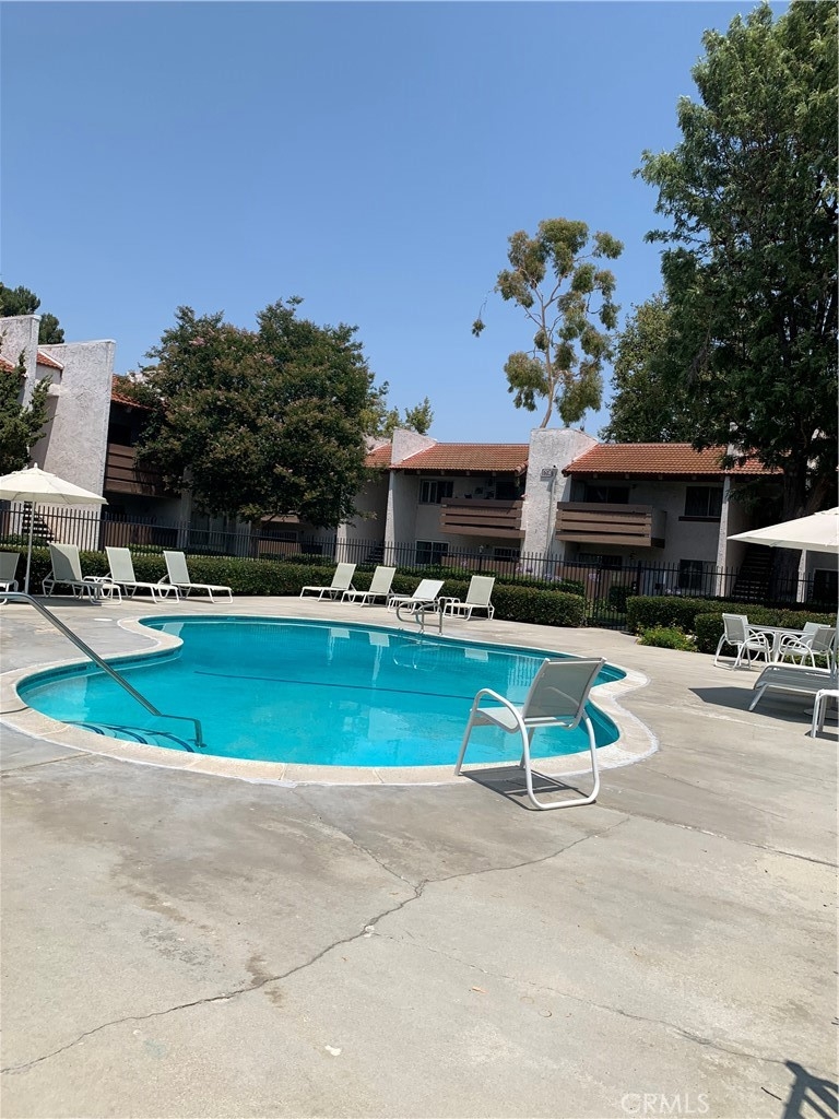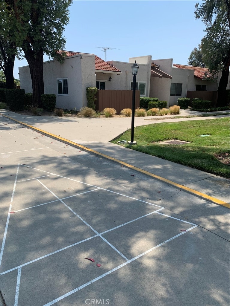 PRIME LOCATION IN THIS COTTAGE, BUNGALOW STYLE CONDO. Single story no one above or below and in back. END UNIT. Located next to shuffle board and steps to Community laundry facilities, parking structure has open parking on upper level and gated area is assigned parking. Private and surrounded by trees and lawn area. Community Association has Fenced Tennis Court, Community Pool. "A Diamond in the rough" (needs paint and carpet, some cosmetic) but a some major items renovated. Kitchen cabinets have been replaced, stainless steel sink and Whirlpool Dishwasher, granite counters. Plantation shutters added, MBR shower has been retiled, Dining Area has a grandfathered window added for lots of light only unit in tract with this window. Two Private Patios one in front and one in back with sliding doors. Hard surface flooring except bedrooms need carpet. Fireplace in Living Room. Priced to sell below recent comps. Homeowner Association Dues include Water, and trash and outside lighting.