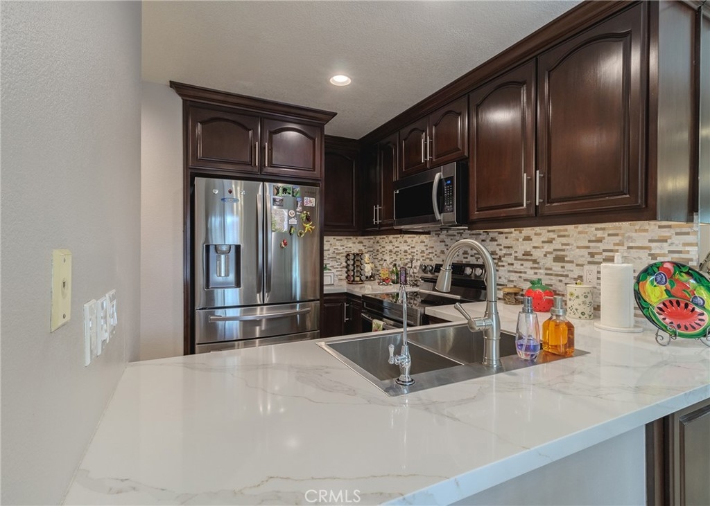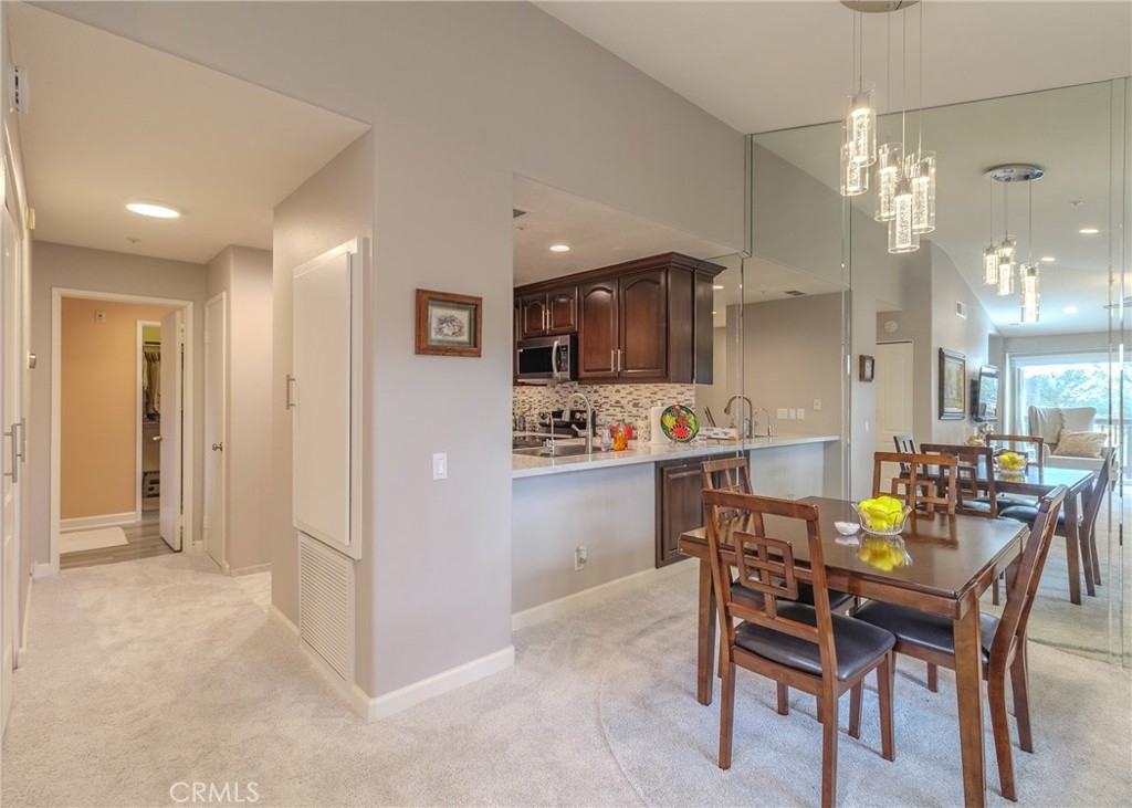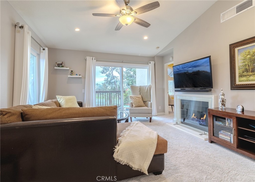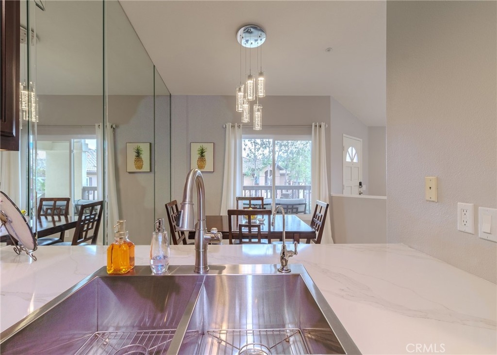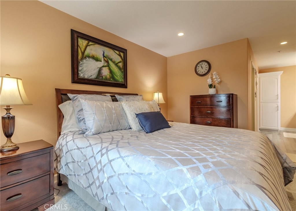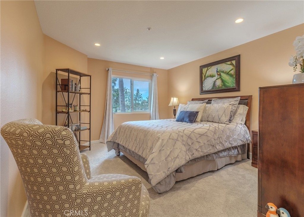 Welcome home to the luxury condominium located in the community of Rancho Vera Cruz, in Tustin. This upper corner condo faces the serenity of the pool area and amazing views of the golf course. Walking up to the condominium you will find a manicured green belt, the pool area and magnificent view of the golf course. As you enter the property you will find the living room featuring custom paint, dual pane windows, recessed lighting and a cozy fireplace. The living room flows nicely into the dining area leading into the custom kitchen. The gourmet kitchen features large cabinets, a built-in sink, a pantry and quartz countertops- breakfast nook counter. Inside laundry room with built-in cabinets. This unit features 2 master suites with walk in closets, tile shower and quartz countertops. Step outside the patio area facing the pool and spa, enjoy the greenery making this home perfect for relaxing. Property is an upper level corner unit with complete privacy. Park inside the manicured 2 car garage, with built-in cabinetry and epoxy flooring. Too many other amenities to add, this is a must see home!