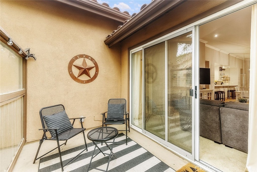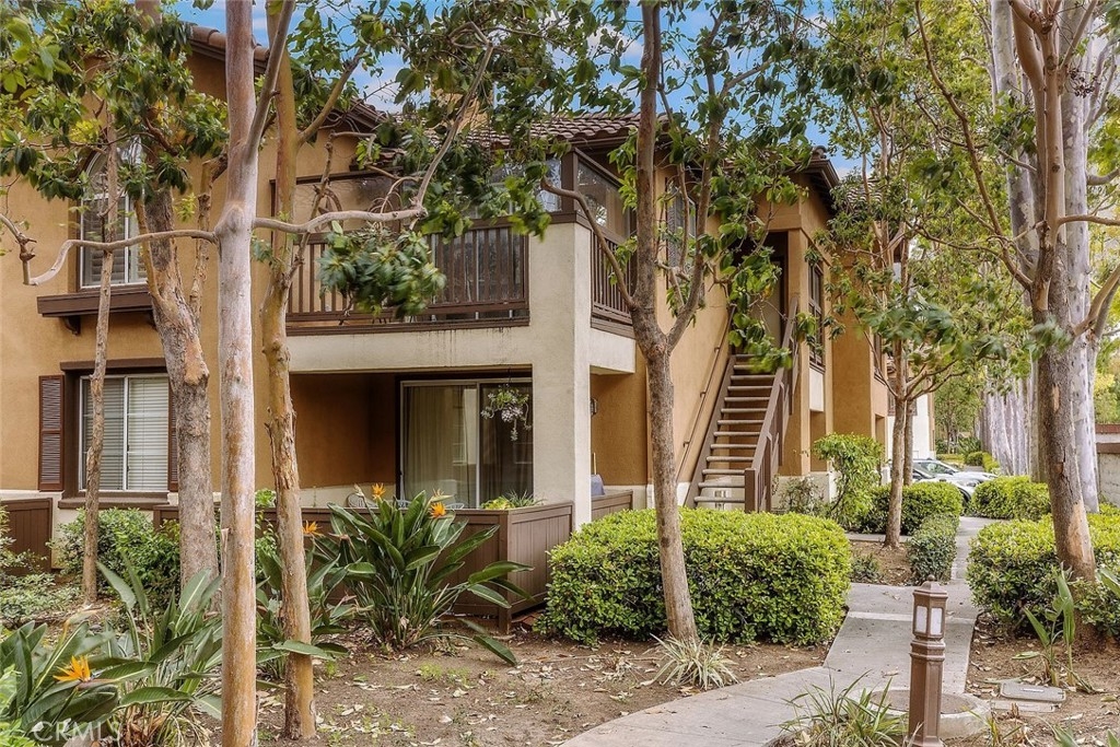 Welcome to this breathtaking two-bedroom upstairs unit located in the Rancho Veracruz community of beautiful Tustin Ranch! Embrace the large, light and bright carpeted living room with light grey walls and white crown molding. The living room has ample natural lighting, colonial shutters throughout, a gas fireplace and access to the patio through a sliding glass door. The separate dining room offers an open layout unfolding to both the kitchen and the living room and includes vaulted ceilings, a charming chandelier and is the perfect layout for entertaining family and friends. Make your way into the kitchen that offers tile flooring and a ceramic tile breakfast bar extending the length of the kitchen. Lots of cabinet space with white cabinetry, a crown-molded coffered ceiling and recessed lighting. Across the hall is the laundry closet with white shutter doors and a side-by-side washer and dryer. Both bedrooms in this desirable home are suites and include panel doors throughout. The lambent master bedroom features a ceiling fan and offers a spacious walkway to the master bathroom. The master bathroom boasts spacious white countertops and white cabinetry. Accent lighting over the vanity and a large tub/shower combo with a sliding glass door are highlighted by a spacious walk-in Closet. The secondary bedroom suite includes pitched vaulted ceilings, carpet flooring, and is showcasing an attached bathroom. The secondary bathroom features a wide-ranging vanity with white countertops and cabinetry and a tub/shower combo with a sliding glass door. This bedroom also provides a walk-in closet. Enjoy the sizeable outdoor patio with plenty of room for seating and a BBQ. Other features include a two-car garage, two community pools, a workout gym, a clubhouse, and access to walking trails. This home is within walking distance to Peters Canyon Park and is close to Tustin Ranch golf course. Enjoy everything that Rancho Veracruz has to offer including freeway access, nearby shopping, dining, and entertainment!