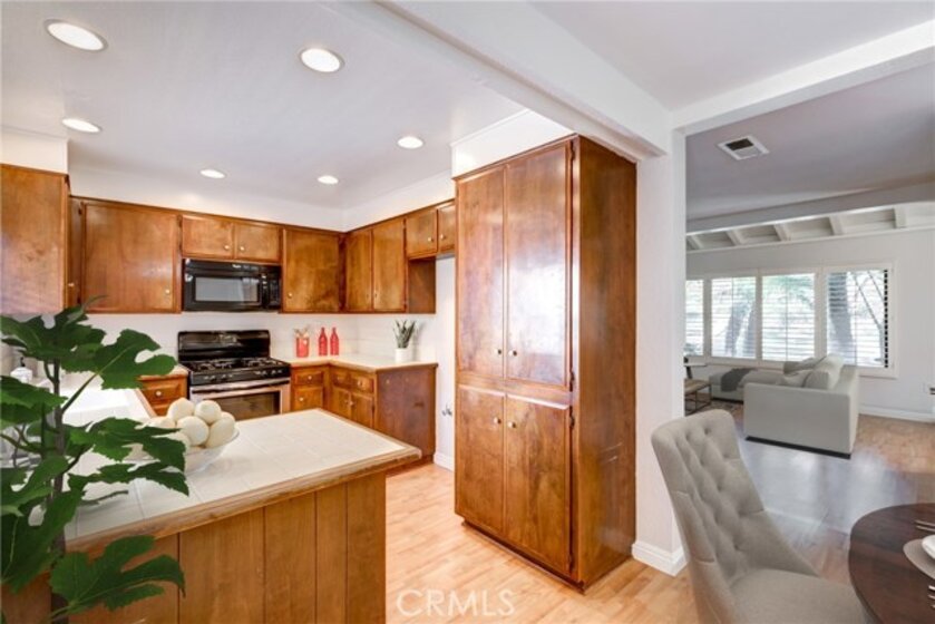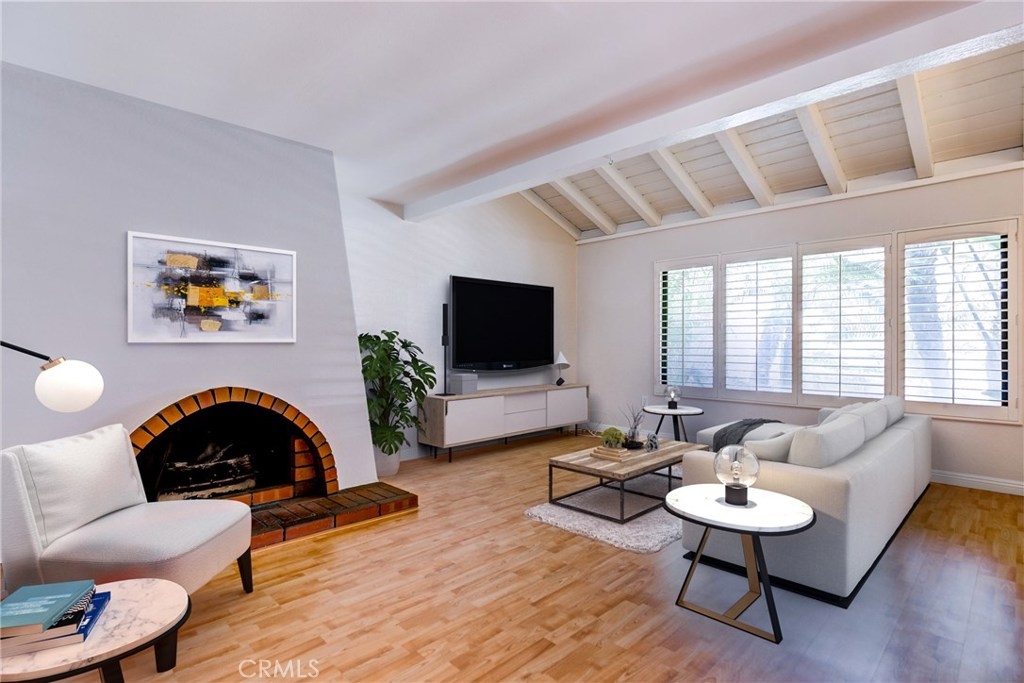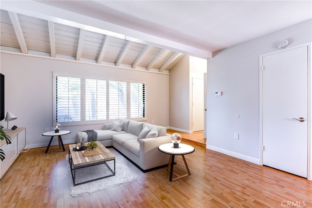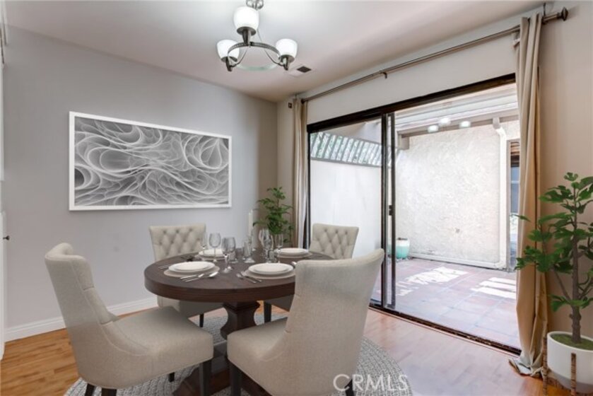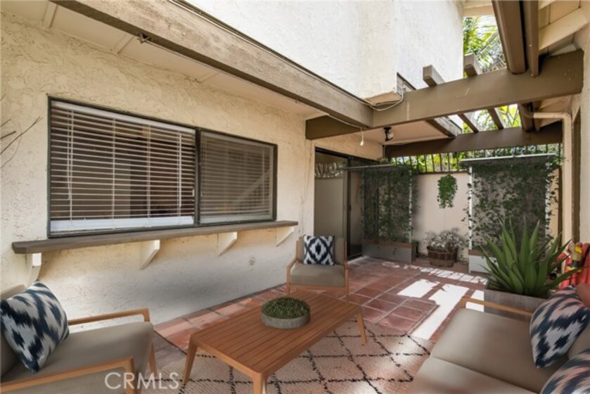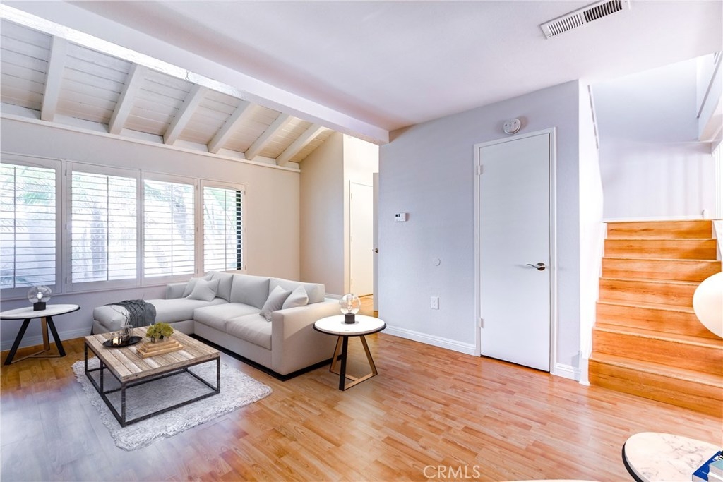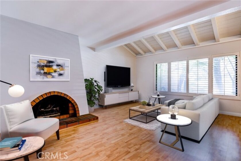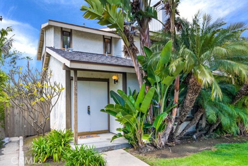Beautifully upgraded 2 bedroom 1.5 bath end unit townhome located in a quiet 22 unit PUD community. This home is extremely private and it feels more like a Single Family House than a townhouse. It has a private front entry, a charming patio, and oversized 2 car garage with your own driveway that means extra parking for your guests. The open floor plan features vaulted ceiling in living room, brick fireplace, and a large picture window filled with natural light. The spacious master bedroom features a vaulted ceiling, with walk in master closet. The other bedroom is roomy with natural light and large closet. The whole house is freshly painted with neutral color, newer wood floor in living room, kitchen, and 2 bedrooms, newer tile floor in bathrooms. Other upgrades include: new roof, new water heater, Plantation Shutters, Dual Pane Windows, and Central Air. Only 1.5 miles from the Tustin Marketplace. Within walking distance to Veeh Elementary, Utt Middle School and Tustin High School, the location cannot be beat.