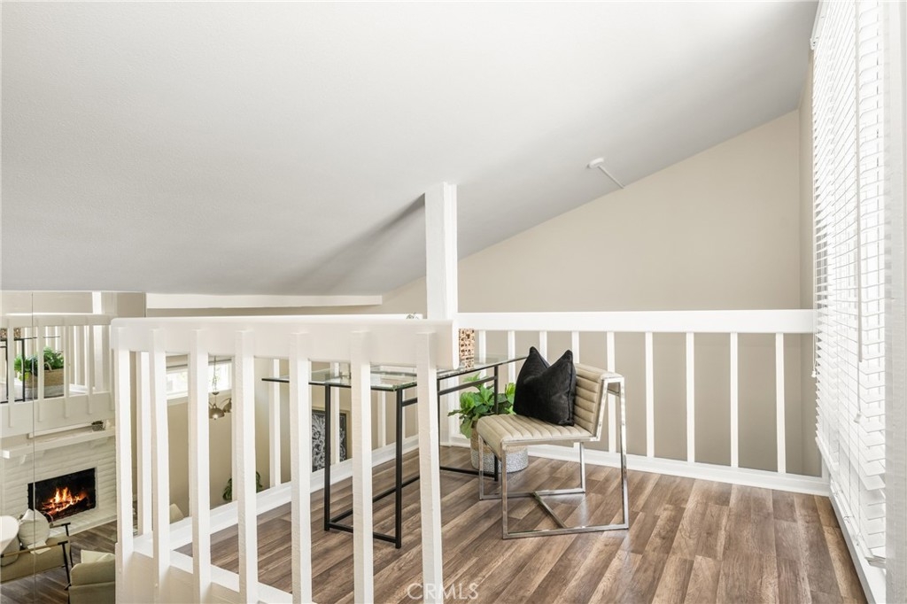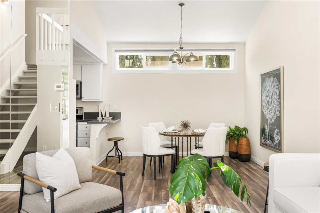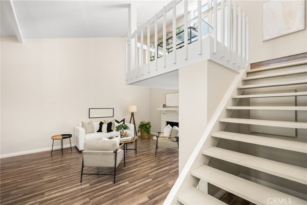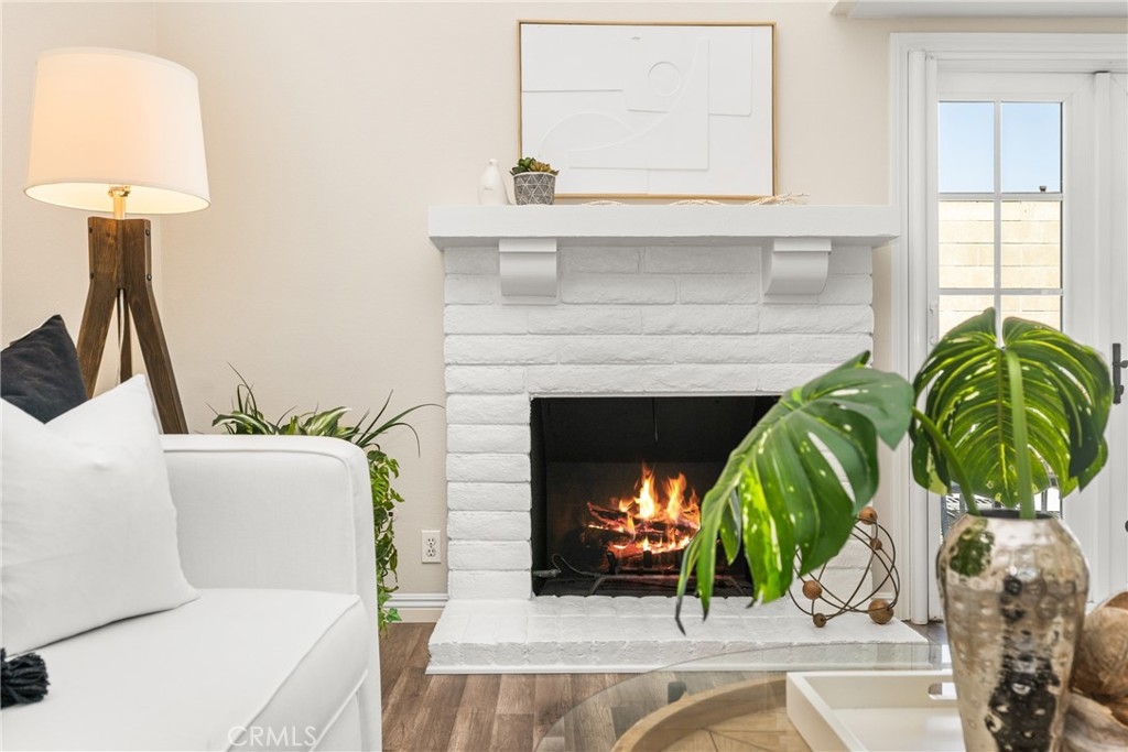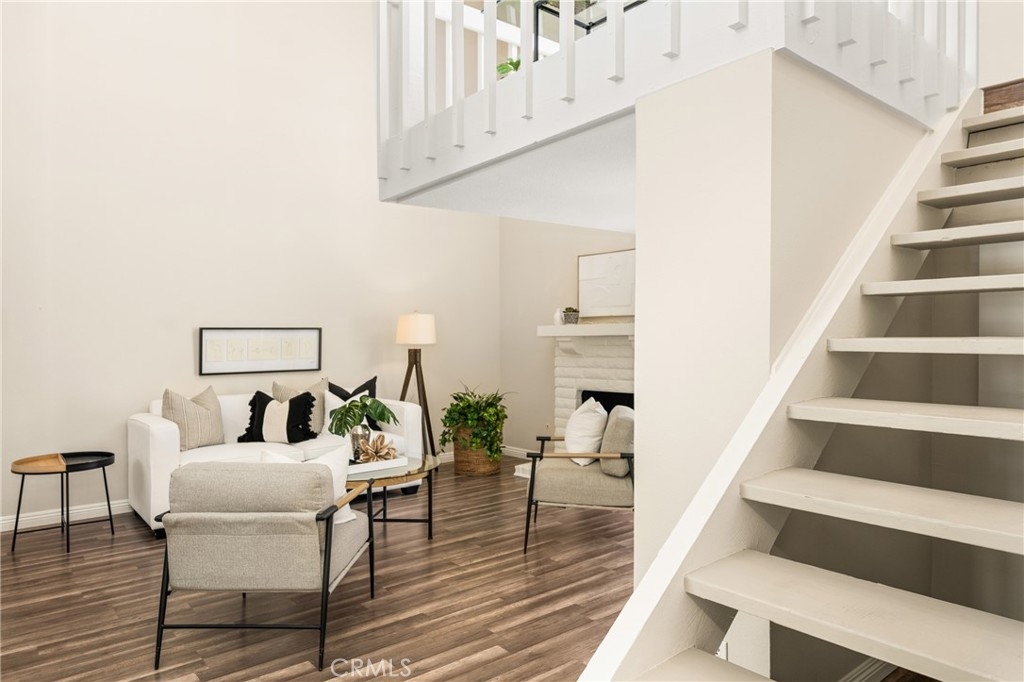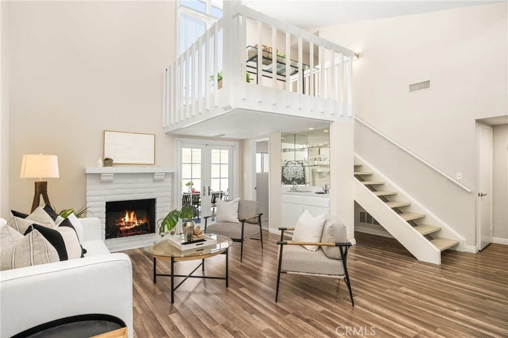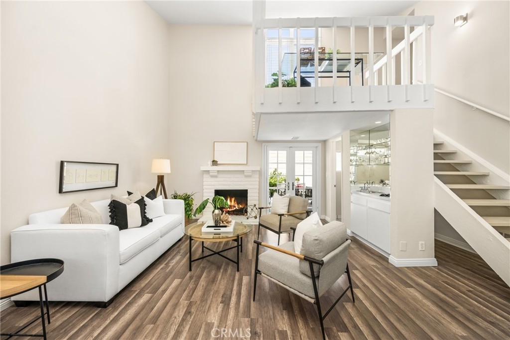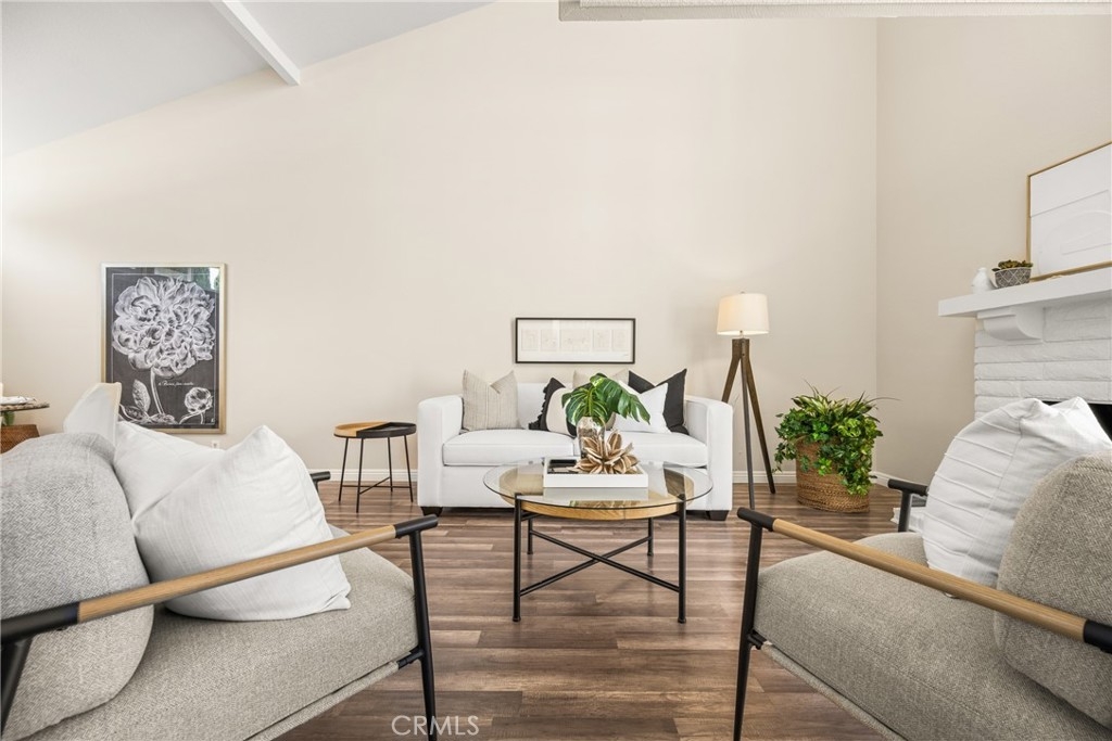 Settle into the good life at Cascadia—an intimate gated enclave in Tustin, the beloved “City of Trees.” Perfectly positioned on the border of North Tustin, this private townhome offers a rare blend of thoughtful space, modern comfort, and easy everyday living. Whether pulling into your attached 2-car garage or using your oversized adjacent third parking spot, your daily routine starts with ease. Inside, soaring cathedral ceilings and a wall of light welcome you into the main living space—an open-concept design that seamlessly blends the living and dining areas for connected living. The warmth of the wood-burning fireplace anchors the room, while generous wall space is ready for your favorite art—or your favorite big screen. The updated kitchen is dialed in for both form and function: quartz countertops with bar seating, stainless steel appliances, single-basin sink, recessed lighting, and freshly painted cabinets. Mornings are made better with the perfect omelet or espresso at your stylish coffee bar/wet bar setup. A guest powder bath on the main level adds function for entertaining. French doors open to a private tropical-inspired patio—complete with plumeria trees, artificial turf, and built-in storage to tuck away garden essentials. Hosting is easy with direct gate access from your third parking spot and plenty of room to dine al fresco, lounge, or BBQ under the stars. Upstairs, a versatile loft offers the ideal flex space for a home office or lounge area. The secondary ensuite bedroom includes an updated bath and a cozy dressing or study nook. The sunlit primary suite offers both a walk-in closet and additional storage, plus a dedicated vanity area that flows into the private walk-in shower and commode. Take advantage of fresh paint, easy-care laminate flooring, and window coverings throughout. The fully finished garage adds even more versatility with laundry hookups and extra storage areas—all with direct home access. Live just minutes from Tustin’s favorite breakfast spots, breweries, shopping, and award-winning Tustin Unified schools. Privacy, possibility, and pride of place—welcome home to Cascadia.