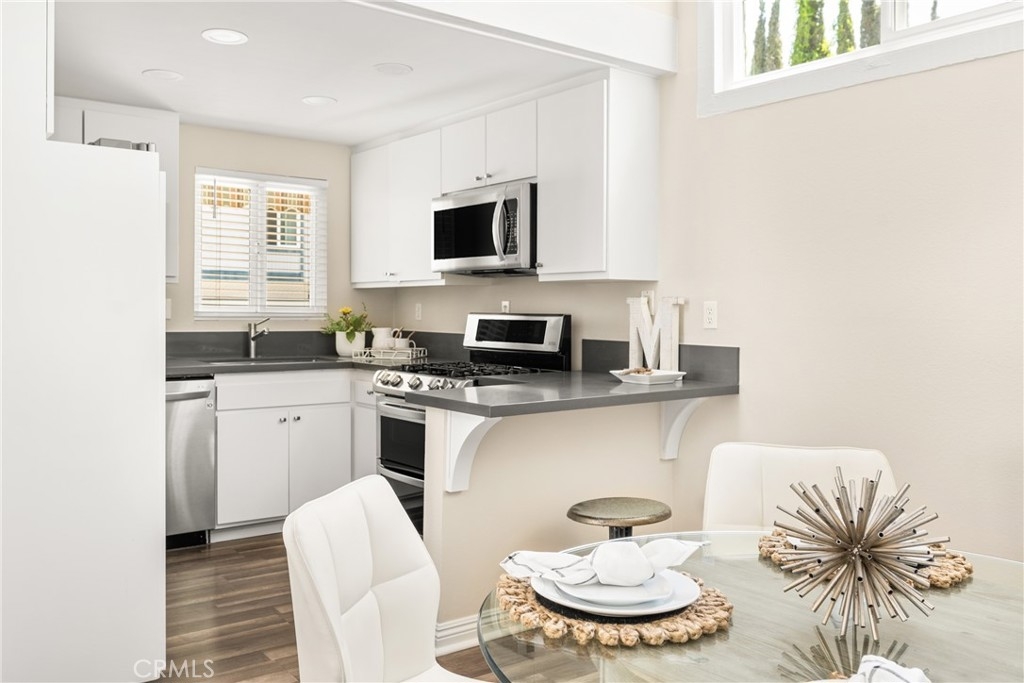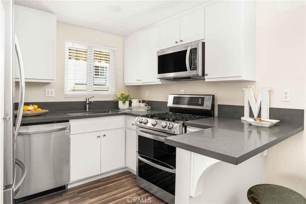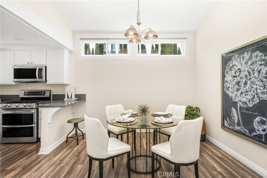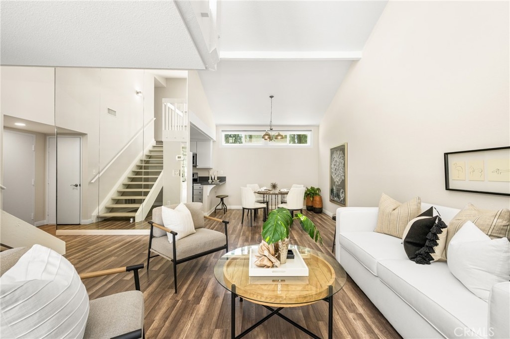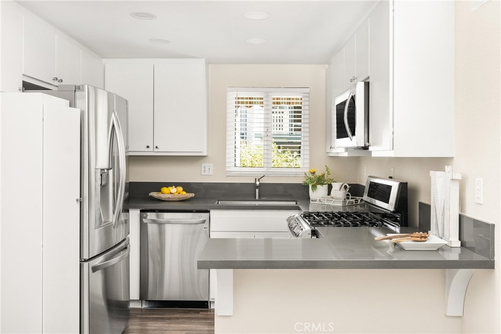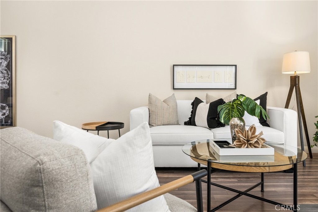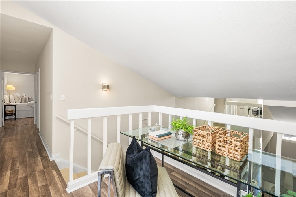 Settle into the good life at Cascadia—an intimate gated enclave in Tustin, the beloved “City of Trees.” Perfectly positioned on the border of North Tustin, this private townhome offers a rare blend of thoughtful space, modern comfort, and easy everyday living. Whether pulling into your attached 2-car garage or using your oversized adjacent third parking spot, your daily routine starts with ease. Inside, soaring cathedral ceilings and a wall of light welcome you into the main living space—an open-concept design that seamlessly blends the living and dining areas for connected living. The warmth of the wood-burning fireplace anchors the room, while generous wall space is ready for your favorite art—or your favorite big screen. The updated kitchen is dialed in for both form and function: quartz countertops with bar seating, stainless steel appliances, single-basin sink, recessed lighting, and freshly painted cabinets. Mornings are made better with the perfect omelet or espresso at your stylish coffee bar/wet bar setup. A guest powder bath on the main level adds function for entertaining. French doors open to a private tropical-inspired patio—complete with plumeria trees, artificial turf, and built-in storage to tuck away garden essentials. Hosting is easy with direct gate access from your third parking spot and plenty of room to dine al fresco, lounge, or BBQ under the stars. Upstairs, a versatile loft offers the ideal flex space for a home office or lounge area. The secondary ensuite bedroom includes an updated bath and a cozy dressing or study nook. The sunlit primary suite offers both a walk-in closet and additional storage, plus a dedicated vanity area that flows into the private walk-in shower and commode. Take advantage of fresh paint, easy-care laminate flooring, and window coverings throughout. The fully finished garage adds even more versatility with laundry hookups and extra storage areas—all with direct home access. Live just minutes from Tustin’s favorite breakfast spots, breweries, shopping, and award-winning Tustin Unified schools. Privacy, possibility, and pride of place—welcome home to Cascadia.