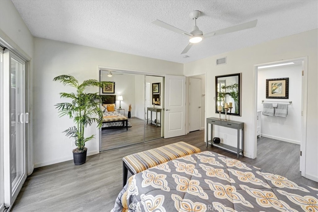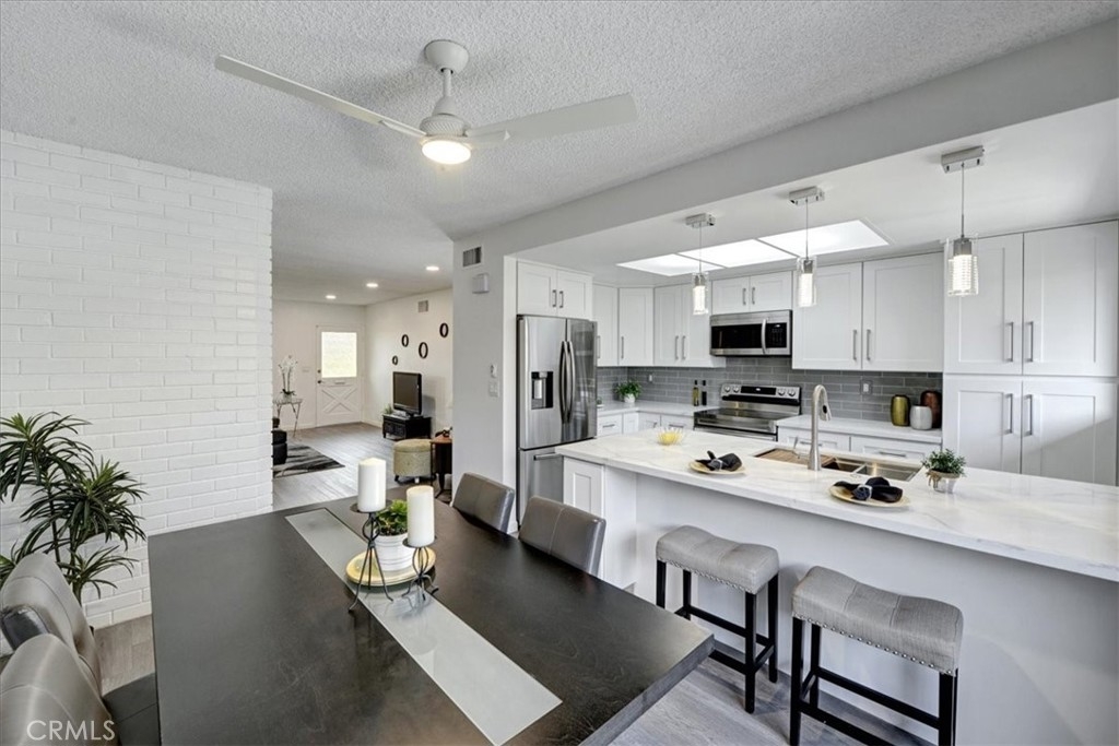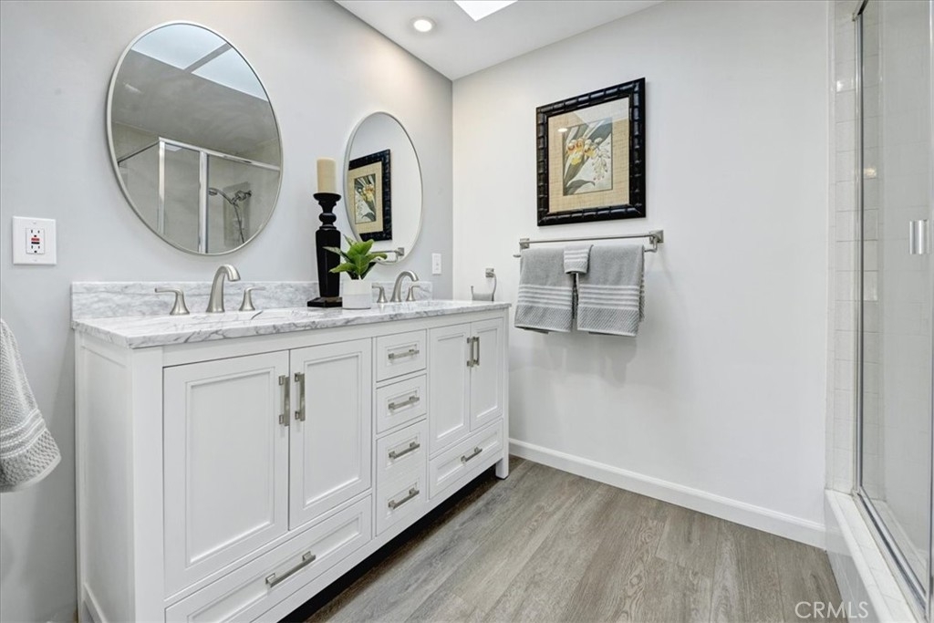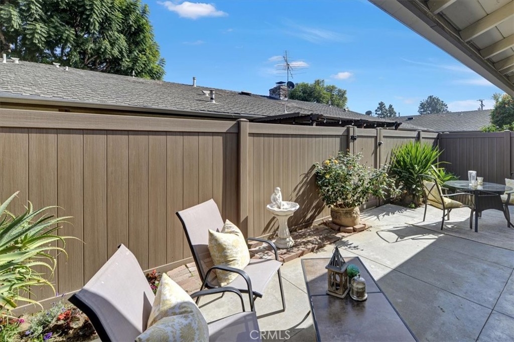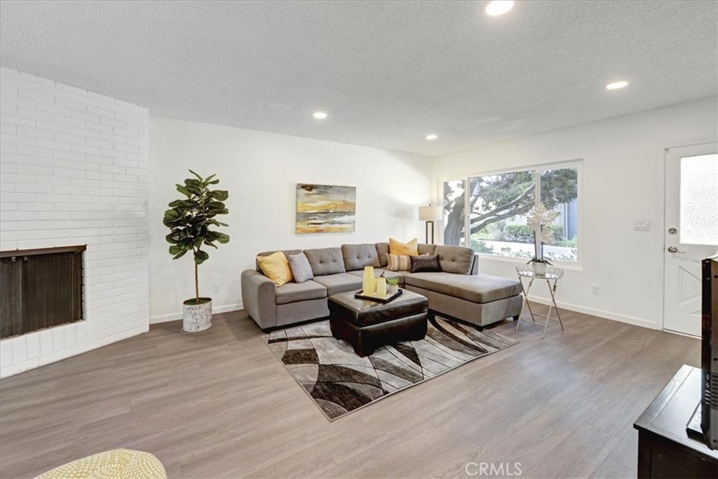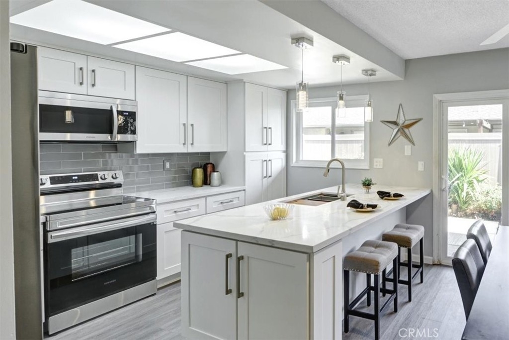Welcome to this wonderful totally remodeled 2BD 2BA Single Level condo with no one above or below! Just completed! New Kitchen, Two New Bathrooms, New Paint and Vinyl Plank flooring throughout in a modern neutral pallet to compliment any decor, this home is truly move in ready for you. Hurry this one will go fast! The property is a must see and has SO much to offer. The remodeled Kitchen is a home chef's dream that you will absolutely love, with an open floor plan and a view of the private patio. All new white shaker cabinets, quartz countertops, tile backsplash, new sink and faucet, all new stainless steel appliances, Refrigerator, Range, Micro Hood and Dishwasher. There is even a breakfast bar with gorgeous modern pendant lights and Dining Area with a ceiling fan, a great setting for dinner parties and family dinners alike. The spacious Living Room has new LED recessed lighting and even has a cozy fireplace with lots of space for a home office or homework area, watching your favorite TV show, game night or reading a book. The large Master Bedroom will truly be your peaceful retreat with mirrored closet doors, a ceiling fan and en suite bathroom with a new dual sink vanity and large step in shower. The spacious second bedroom features a ceiling fan and mirrored closet doors. The oversized hall bath is very spacious with a new vanity and fixtures, a renovated tub/shower and is also perfect for guests. What makes this place even better is the large private patio accessed from the Dining Room or Master Bedroom. The patio is landscaped with succulents & seasonal flowers with plenty of space for gardening, relaxing, entertaining & dining outside in your own private oasis. The home has newer windows and a new 40 Gallon water heater that was just installed in Oct. 2021. HOA Includes Water & Trash. One space in detached shared garage + 1 parking permit. Central AC & Heating. Can request approval from HOA to install WD on patio. This home is Clean, Spacious and Move-In Ready. Enjoy privacy here with greenbelts and a park like setting, it is a hidden gem. HOA amenities include two pools, spa's and clubhouse. Ideal Location for Dining, Shopping, Entertainment and Sports Venues. Across from Enderle Center, a short drive to The District, Tustin Marketplace, Old Town Tustin, Disneyland, Parks & Beaches. The central location is fantastic, with close proximity to the freeways making access to all of OC a breeze!