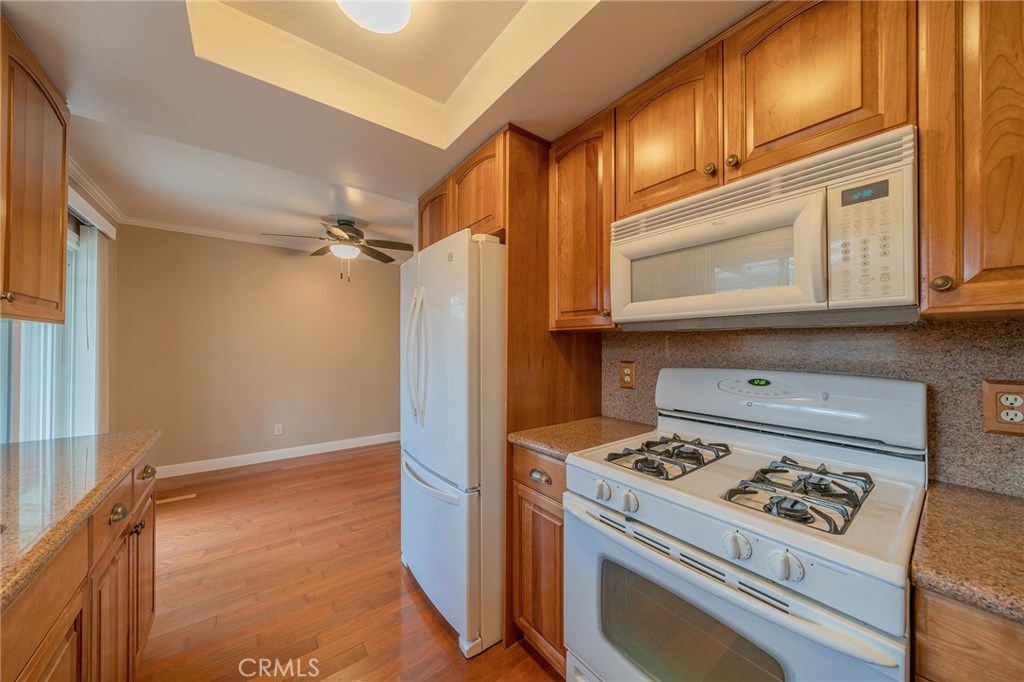 Single level spacious one bedroom patio home in Tree Haven community. Living room, dining room and kitchen have beautiful hardwood floors, bedroom has plush carpet. Kitchen features granite counters and updated cabinets and gas range. Dining area has sliding door opening to private covered back patio, plenty of room for a barbecue and outdoor dining. Washer Dryer hookups are on patio. Bathroom features stone shower and floors with newer vanity. Completing the residence is crown molding, ceiling fan and a neutral paint color palette. End unit, quiet location near clubhouse. HOA covers landscaping, roof, fences, termite inspection, garage door, trash and water, in addition there are two pools, club houses and laundromats. Landscaping is beautifully maintained with park like grounds. Close to freeways, restaurants and shopping, perfect started home or for someone who is looking to downsize and uncomplicate their lives.