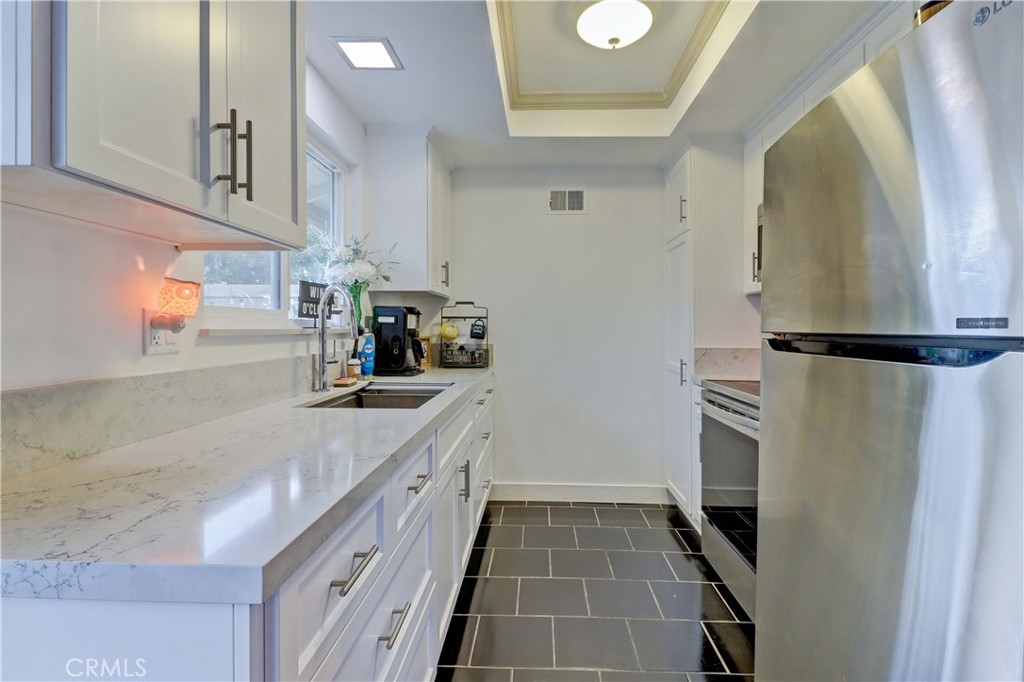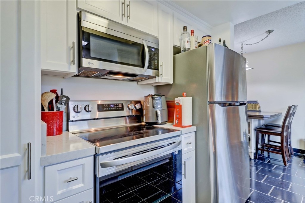 Beautifully Landscaped, Maintained and Quiet, Tree Haven Condo. This One Level End Unit has a Newly Remodeled Kitchen and Bath that was completed in December of 2022. Close to the included Single Car shared garage with remote control. Can obtain permit for parking 2nd car in designated permit spaces. The recent Remodel in Kitchen includes Custom Built and Designed White Shaker Cabinets. Soft Close Drawers, Quartz Countertops, Space Saving Sink with Workstation (Stainless Steel), LG Electronics Appliances w/ New Stove and Microwave, also includes newer Refrigerator with recessed Water box. New Dual Pane Windows throughout. Tile Floors in all of unit except Master Bedroom which has newer carpet. Bathroom Remodel Includes New Tile, New Toilet and Soaking Tub, Kohler Sink, and Kohler Color Changing Waterfall Faucet, New Custom-Built Vanity w/ Quartz Countertop Allows for Plenty of room for your essentials. The large Master Bedroom has plenty of Room for a Large bed and sitting area. Large Living Room with White brick, Wood Burning Fireplace. New Plumbing added with Remodeled Kitchen and Bath. New Paint on inside. Nice size Private Patio with rear entrance, perfect for entertaining. New Front decorative Screen Door. Complex has Two Large Pools and Two Clubhouses, one with Kitchen and one with Fireplace. Conveniently located for easy access to Freeways and Shopping.
