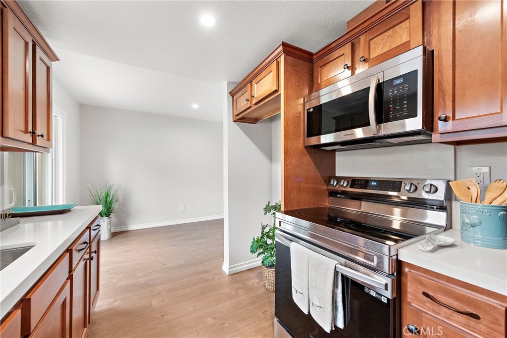Located in the charming community of Tree Haven, this 1 bedroom - 1 bathroom end unit single story cottage has no one above or below. This home was recently remodeled. Some of the features include - WOOD LOOK FLOORING - MODERN AND BEAUTIFUL KITCHEN - STAINLESS APPLIANCES - SMOOTH CEILINGS - FIREPLACE - ELEGANT BATHROOM VANITY - CANNED LIGHTS - WHITE VINYL WINDOWS - BACKYARD. As you enter the home you have a spacious living room with fireplace and a large window overlooking the community greenery. The kitchen was just remodeled with tasteful brown cabinets, light counters, large basin sink and a window overlooking the back yard. There is a dining area off the kitchen with a white vinyl sliding door to the backyard. Down the hall is the bedroom and bathroom. The bathroom has just been updated as well. Enjoy time in the fenced and gated yard with room to relax and enjoy the gorgeous Southern California weather! You even have 1 space to park your car in the joint garage. This is a beautifully maintained small community where you will find 2 pools with club rooms. The community is conveniently located near freeways, shopping, restaurants and more!