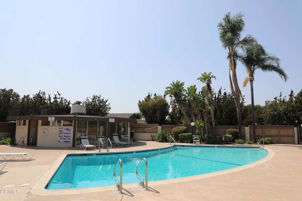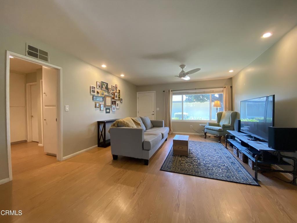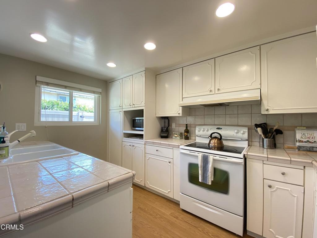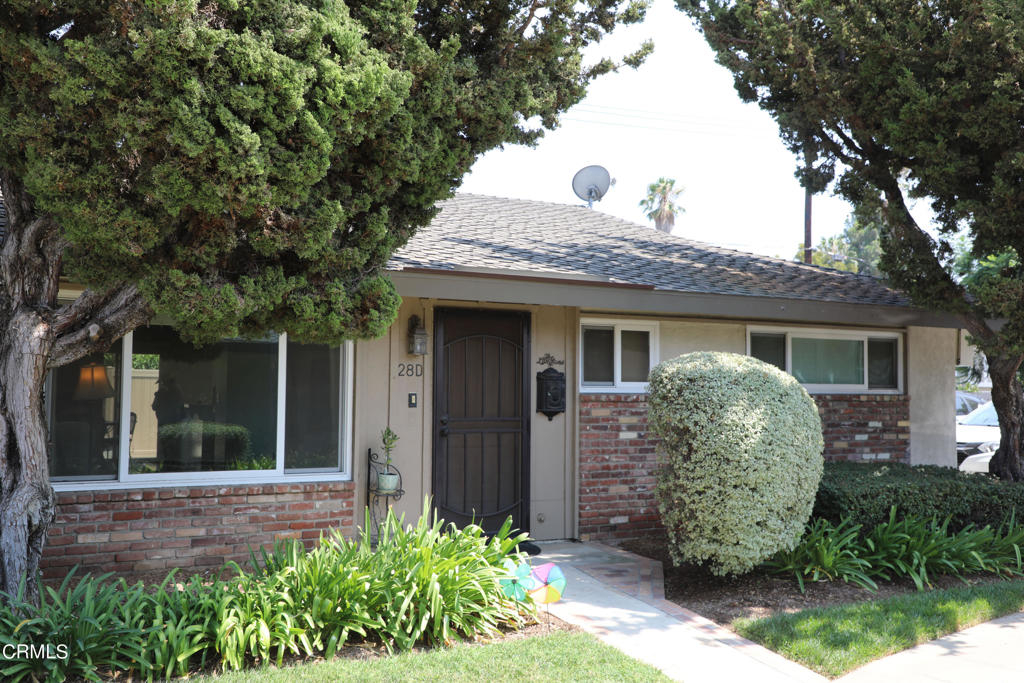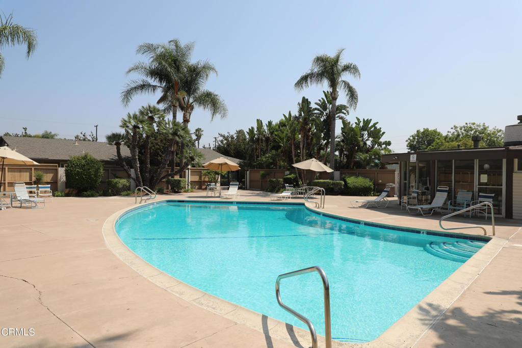 Great two bedroom, two bathroom Tree Haven condo with 1,106 sq. ft. of living space. This home is an end unit in the corner of the complex which provides for a very quiet and peaceful location. A large living room is accented with a white brick, floor to ceiling fireplace with wood mantle and opens into a generous dining and kitchen area. The kitchen features white cabinets with brushed nickel pulls, white tile counters with decorative inlaid and colored tiles, along with a complimenting tile backsplash. Dual-paned vinyl windows throughout. The primary en suite bedroom boasts a large closet with mirrored doors and a sliding door to the rear patio. The second bedroom has a birch tree accent wall, window shutters, mirrored closet doors and a newer stackable LG washer and dryer. Ceiling fans in both bedrooms and living room along with air conditioning and window/door screens allow you to set the comfort level just the way you want. The Tree Haven complex features two pools, just a short distance from your front door. There is also a shared garage with storage cabinets so you can park a vehicle inside too.