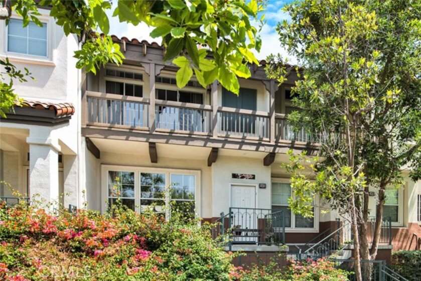 2 Master Suites plus Bonus Room, which could be third bedroom. This unique Tustin Ranch townhome is close to pools and Golf Course in a private location looking out to lovely view of trees! Considered to be one of the better locations in the tract. Volume ceilings. Upgraded dark laminate wood flooring throughout the living room, dining room, kitchen and stairwell. Eat-in kitchen boasts white cabinetry and breakfast nook with built-in cabinet. Downstairs powder room with canned lighting. Two private balconies! Fireplace features ceramic tile surround. Master suite #1 has Berber carpet, walk-in closet, 2 sink vanity, oval tub and separate shower. Master suite #2 has Berber carpet and shower in tub. Central air conditioning. Fire sprinklers. Washer & Dryer in separate closet. Direct access from the bonus room to the 2 car attached garage.