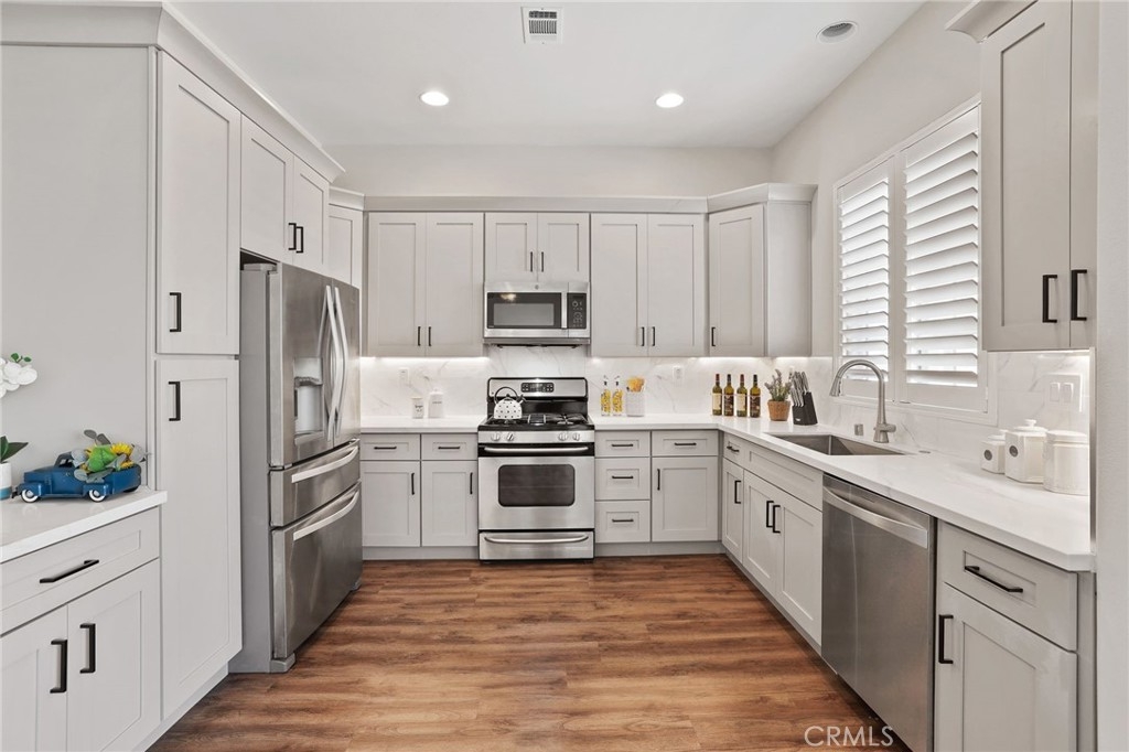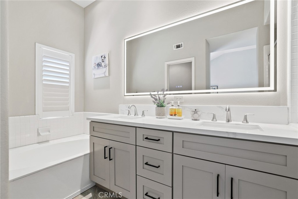Beautifully remodeled condo within the Venturanza Del Verde community in the highly sought-after Tustin Ranch area. Contemporary and move-in ready! Living room features high ceiling with recessed lighting, double-sided gas fireplace, and sleek plantation shutters. Kitchen features stainless steel appliances, new shaker cabinets, quartz counter tops, and tiled backsplash. Upstairs includes a spacious primary suite with dual closets, two more bedrooms, and a full-sized hallway bathroom. The primary bathroom features a modern LED mirror, double-sink vanity, walk-in shower, soaking tub, and private water closet. The powder room is convenient and guest friendly. The bonus room may be used as a home office, playroom, or exercise room, etc. Additional improvements include new vinyl plank flooring, interior paint, lighting fixtures, and so much more! HOA fee covers water, trash, property insurance, exterior maintenance, and resort-style pool and spa amenities. Conveniently located near the Tustin Market Place, scenic golf course, parks, and top-rated award-winning schools.