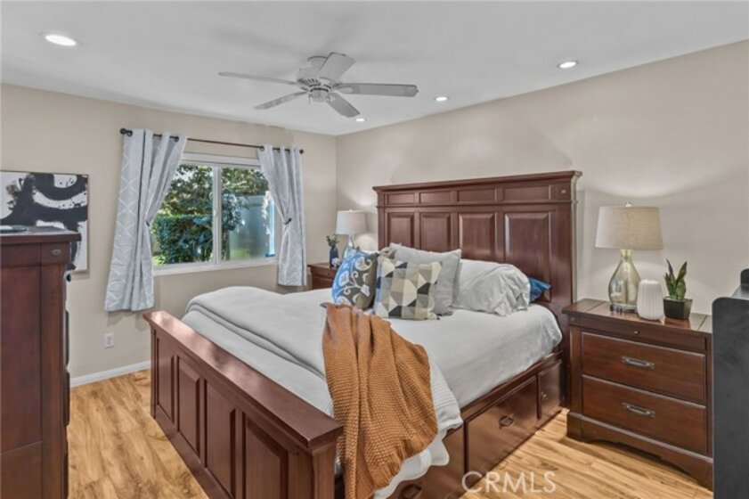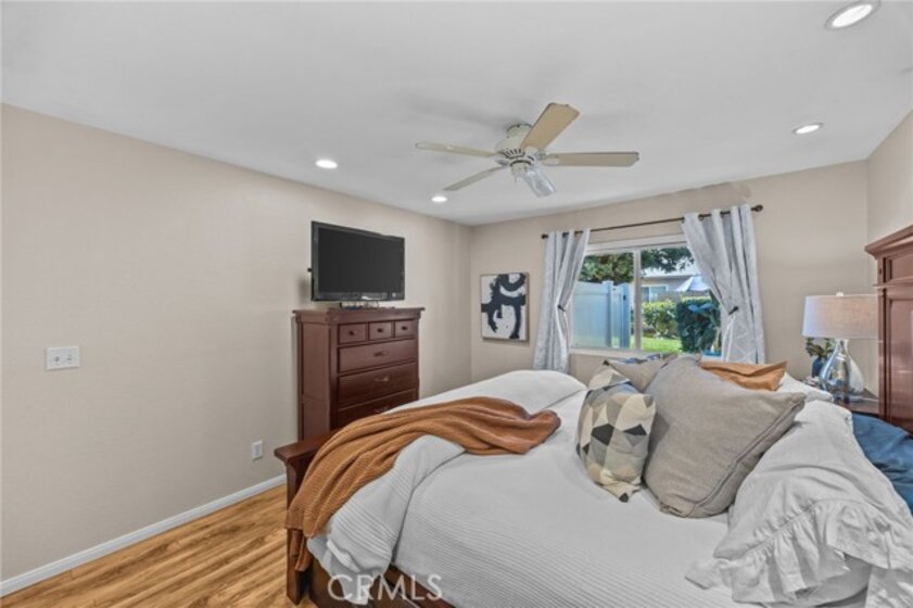 Welcome to this highly sought-after single level floor plan with no steps, offering 2 bedrooms, 2 bathrooms, and approximately 1,051 square feet of thoughtfully designed living space. With no one above and no one below, this home provides exceptional privacy in one of Tustin's most picturesque condominium communities. Beautifully upgraded throughout, the kitchen showcases quartz countertops, a classic white subway tile backsplash, crisp white cabinetry, and a sleek black stainless steel glass-top electric range, creating a clean, modern aesthetic that feels both timeless and inviting. Wood textured ceramic plank tile flooring adds warmth and durability while flowing seamlessly through the main living areas. The popular layout offers spacious living and dining areas filled with natural light, along with well-proportioned bedrooms providing comfort and flexibility for guests, a home office, or everyday living. Both bathrooms have been updated with quartz countertops, new sinks, tile backsplash walls, framed mirrors, mosaic tiles at floor, both toilets are soft-close and glass shower and bathtub enclosures. Ideally located near major commuter routes including the 5 highway, 55 and 405 freeways, you'll enjoy convenient access throughout Orange County located in a centralized location. World class shopping, dining, and entertainment await at the Irvine Spectrum Center while everyday conveniences and popular restaurants are just minutes away at the Tustin Marketplace and Old Town Tustin which features many unique dining spots and a farmers market. Located within a beautiful maintained community and highly regarded school boundaries, this home offers the perfect blend of style, privacy, and convenience. Other highlights include new garbage disposal, new soft neutral color fresh paint throughout, furnace 5 years new with nest thermostat,, recessed lighting, ceiling fans in dining, family and both bedrooms, wood laminate flooring in both bedrooms, scraped ceilings, retractable shade canopy cover at patio, custom window treatments, new energy efficient windows throughout, private detached one car garage, new roof, individual low-maintenance in front of unit landscaping, all offered in a quiet gated community. The home comes with one parking pass for additional parking within the community. HOA also covers exterior fire ins. Owner took great care of this property showing true pride of ownership. FHA APPROVED.