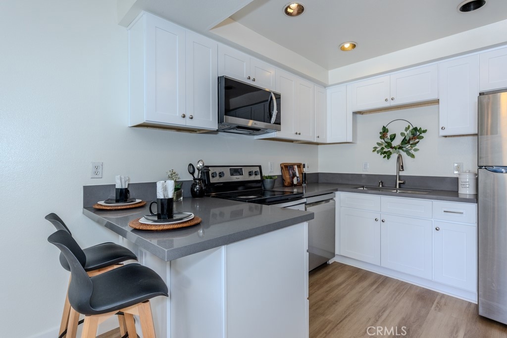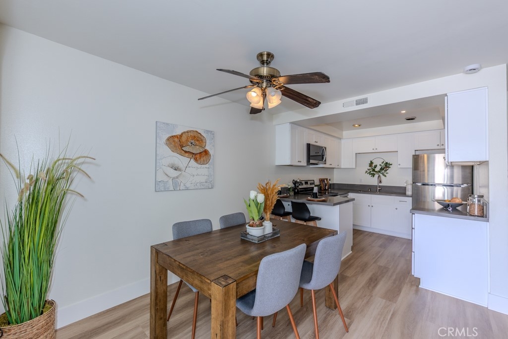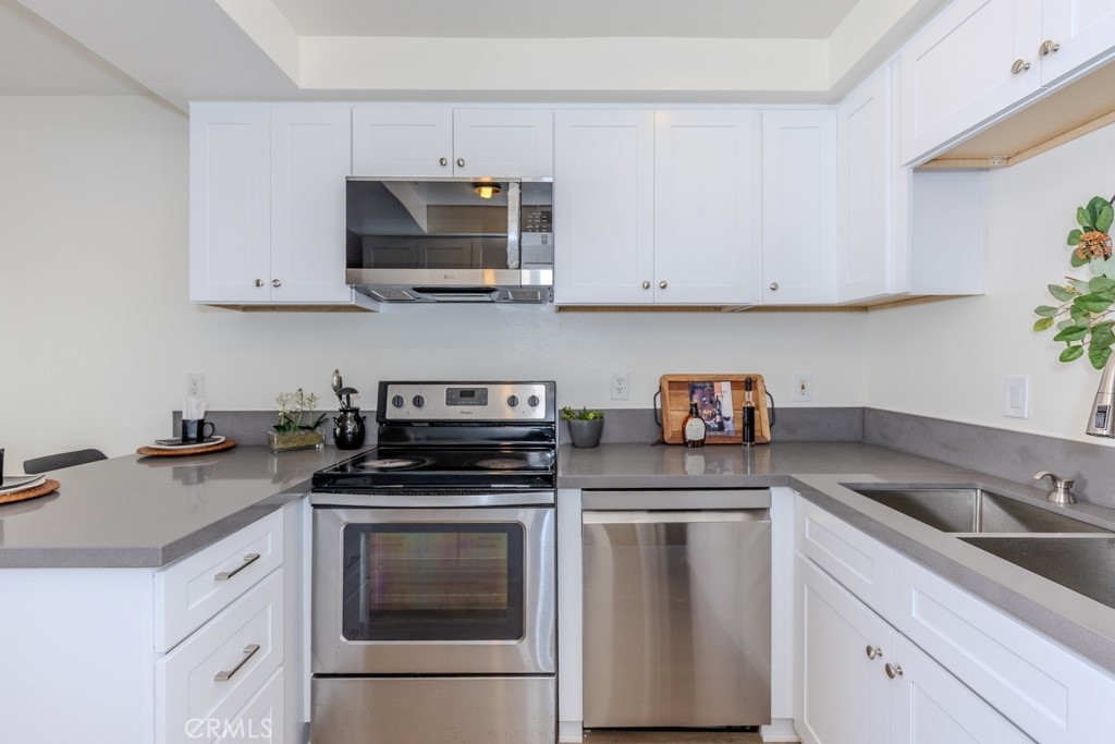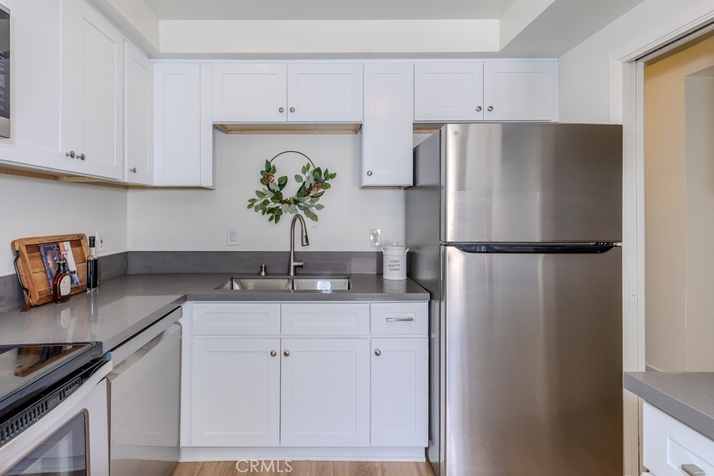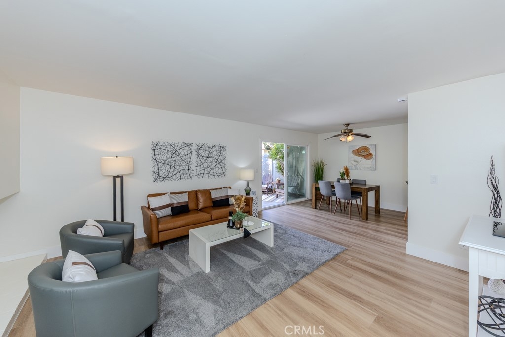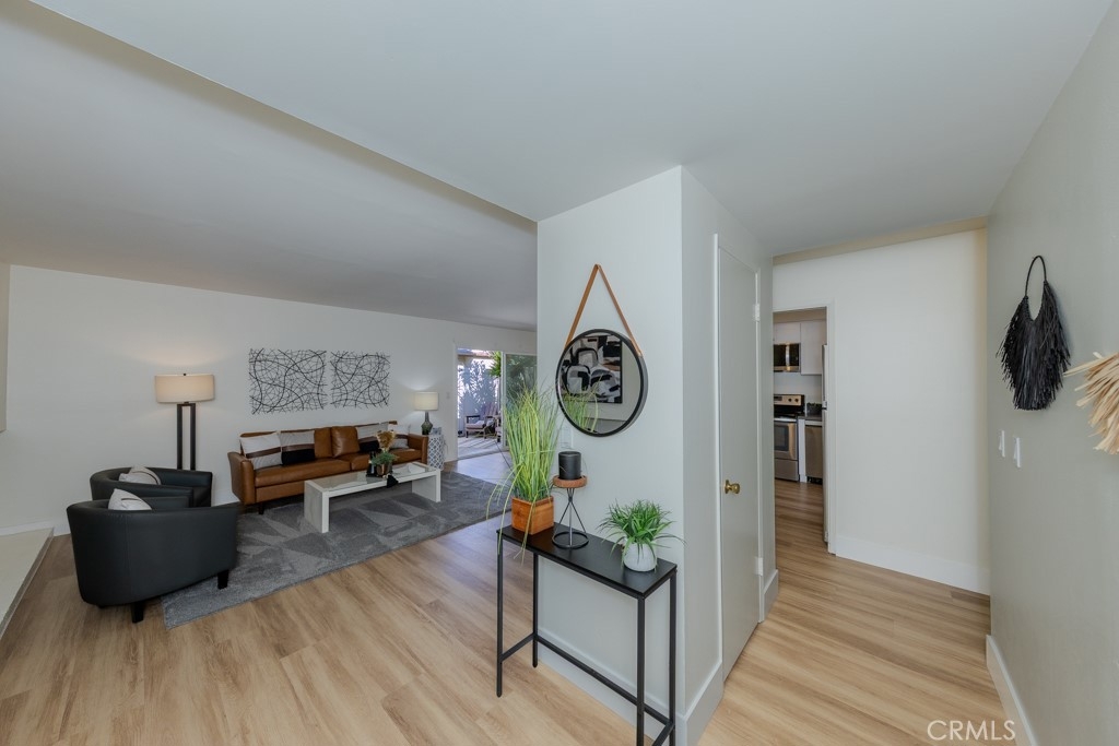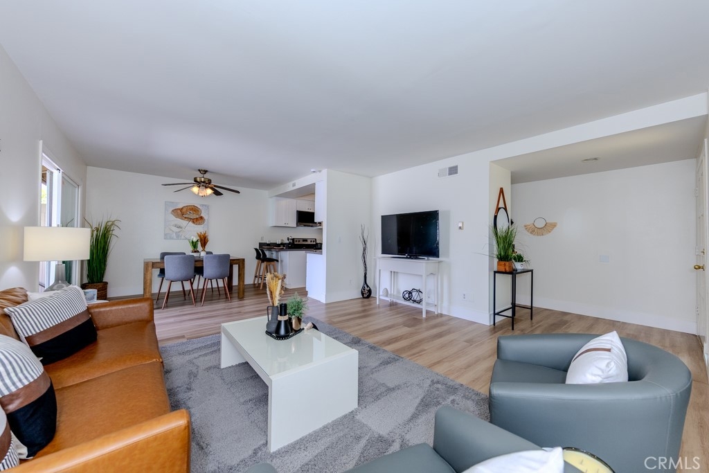 Welcome to 1881 Mitchell Ave #5, a beautifully updated single-story condo in the highly desirable Tustin Park Villas community. This 3-bedroom 2-bathroom end-unit offers rare privacy with no one above or below. This is a true single-story condo with no interior steps and has been recently updated. It was freshly painted inside and includes a one-car garage and an additional parking space, making it both comfortable and convenient. Inside, you’ll find 1150 square feet of living space with upgraded dual-pane windows and sliding doors. The inviting living room features a cozy fireplace and flows into the dining area with a ceiling fan and access to a private enclosed patio with a tall vinyl fence and gate. The fully remodeled kitchen includes new cabinets, stone countertops, and stainless steel appliances, including a new microwave, dishwasher, and refrigerator. A stainless steel oven range is also included. A bonus prep area provides extra cabinets with pull-out drawers matching counters and upper storage. Down the hall, the guest bathroom features a new vanity with matching stone counters, a new mirror, and a beautifully updated stone-accented shower with built-in shelving. The spacious primary bedroom includes mirrored closet doors and an ensuite with tiled counters, floors, and a walk-in shower. Both secondary bedrooms also have mirrored closet doors. Additional highlights of 1881 Mitchell Ave #5 include central heating and air conditioning, laminate wood flooring throughout with tile in the primary bathroom, and access to the community’s sparkling pool. Located in the Tustin Unified School District, this home is also close to major freeways, shopping, dining, parks, and schools.