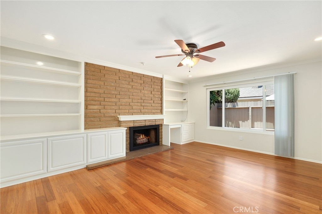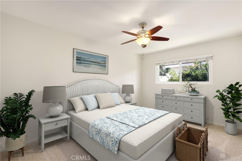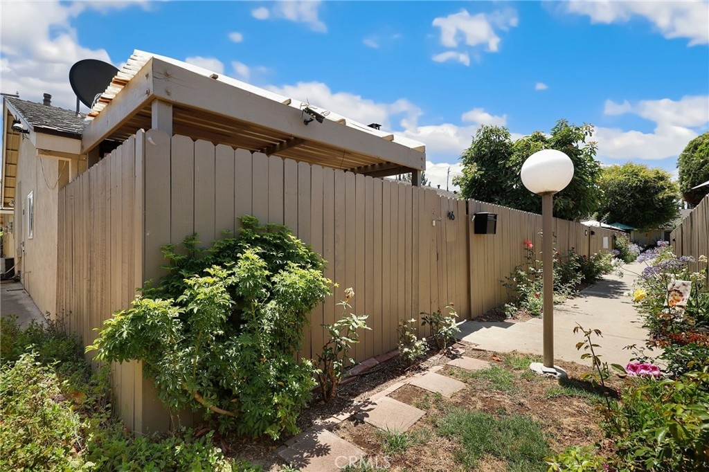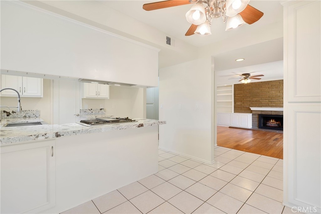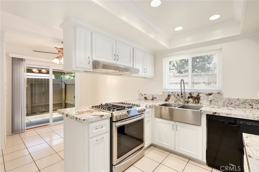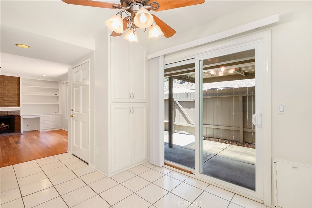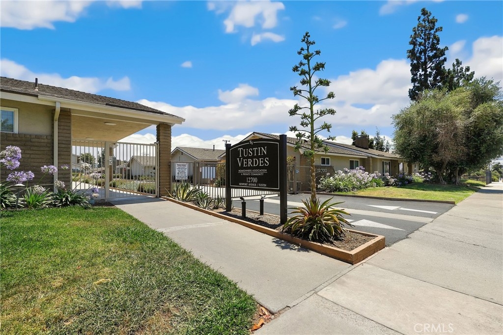 This beautiful single level home is located in the Tustin Verdes Community in desirable Tustin. The living room features gorgeous Bamboo flooring, crown molding, ceiling fan, stone fireplace with custom built-in book cases, shelving, storage and desk area. The newly interior paint of modern white bright tones and large windows allow an abundance of natural light to illuminate the open floor plan throughout. The kitchen impresses with clean white cabinetry, Granite countertops, plenty of storage, a large walk-in pantry with peg board system, dishwasher, recessed lighting, a long breakfast bar countertop for stool seating and tile flooring. The Stainless-Steel appliances include a double sink with fancy faucet, a gas 5 burner single oven range, and range hood. Adjacent is a dining area with ceiling fan and a large sliding door that leads to the large patio. The spacious primary en-suite features Bamboo flooring, ceiling fan, walk-in closet with custom shelving and racks, a single sink vanity, long Travertine countertops with plenty of storage, Jacuzzi style soak tub (no jets) surrounded by stone Travertine and shower in tub. The secondary bedroom is of a generous size, ceiling fan, closet doors, new carpet and a large window with binds. The hallway bathroom features Travertine countertops, single vanity, glass enclosed step in Travertine shower and stone flooring. The private front patio welcomes you with a custom patio cover, paved area, and perfect for planter boxes and vegetable gardens. A one-car detached garage (#46) includes shelving and buyer to register for the one permitted parking spot. Additional features include A/C unit with newer Ducting system, Dual Pane windows, new doors, brand new water heater and security system. Enjoy the Community amenities pool, clubhouse, greenbelt area, well manicure grounds, gated community and two common laundry facilities. Nearby Old Town and North Tustin shopping, restaurants, parks, easy access to the 55, 22 and 5 freeways.