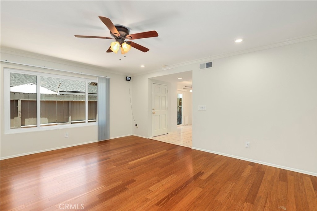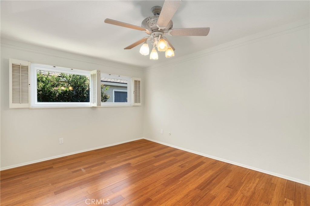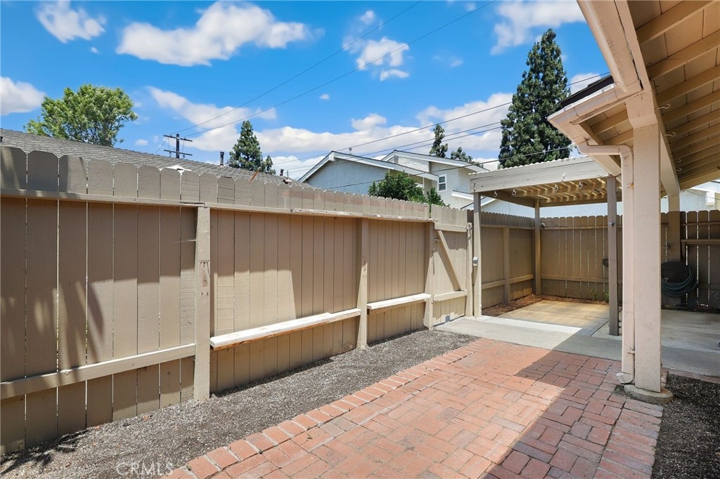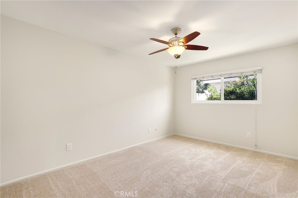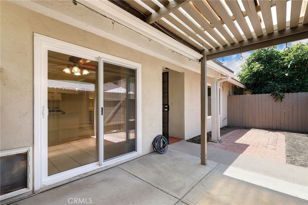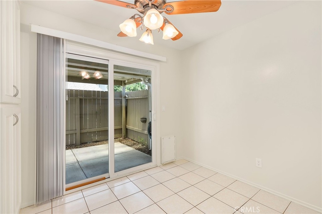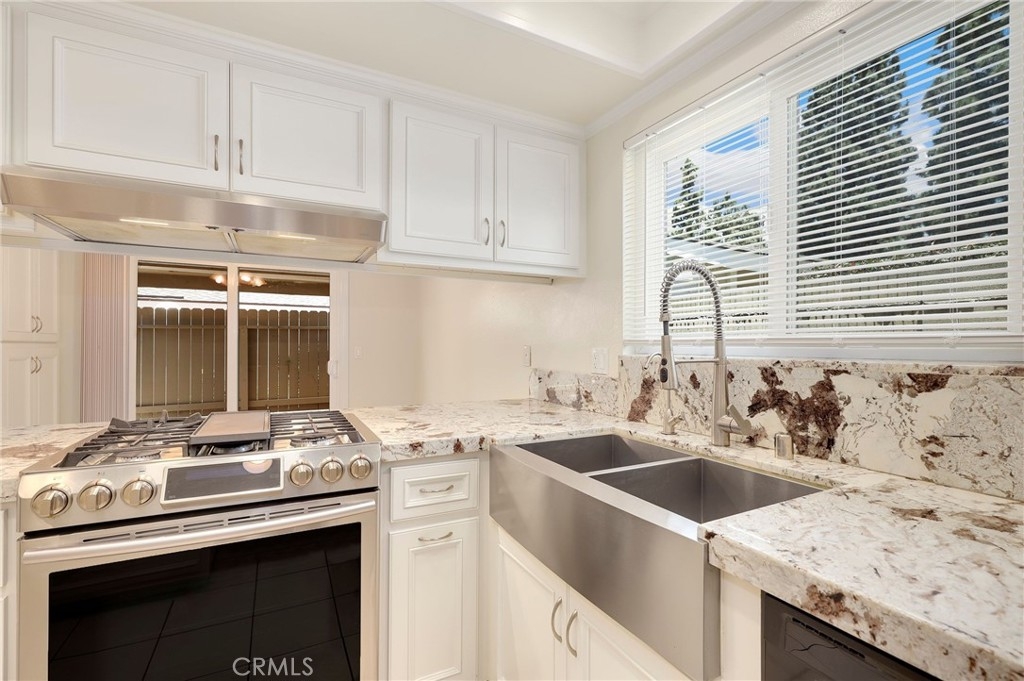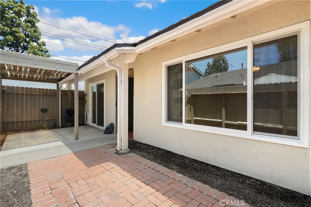 This beautiful single level home is located in the Tustin Verdes Community in desirable Tustin. The living room features gorgeous Bamboo flooring, crown molding, ceiling fan, stone fireplace with custom built-in book cases, shelving, storage and desk area. The newly interior paint of modern white bright tones and large windows allow an abundance of natural light to illuminate the open floor plan throughout. The kitchen impresses with clean white cabinetry, Granite countertops, plenty of storage, a large walk-in pantry with peg board system, dishwasher, recessed lighting, a long breakfast bar countertop for stool seating and tile flooring. The Stainless-Steel appliances include a double sink with fancy faucet, a gas 5 burner single oven range, and range hood. Adjacent is a dining area with ceiling fan and a large sliding door that leads to the large patio. The spacious primary en-suite features Bamboo flooring, ceiling fan, walk-in closet with custom shelving and racks, a single sink vanity, long Travertine countertops with plenty of storage, Jacuzzi style soak tub (no jets) surrounded by stone Travertine and shower in tub. The secondary bedroom is of a generous size, ceiling fan, closet doors, new carpet and a large window with binds. The hallway bathroom features Travertine countertops, single vanity, glass enclosed step in Travertine shower and stone flooring. The private front patio welcomes you with a custom patio cover, paved area, and perfect for planter boxes and vegetable gardens. A one-car detached garage (#46) includes shelving and buyer to register for the one permitted parking spot. Additional features include A/C unit with newer Ducting system, Dual Pane windows, new doors, brand new water heater and security system. Enjoy the Community amenities pool, clubhouse, greenbelt area, well manicure grounds, gated community and two common laundry facilities. Nearby Old Town and North Tustin shopping, restaurants, parks, easy access to the 55, 22 and 5 freeways.