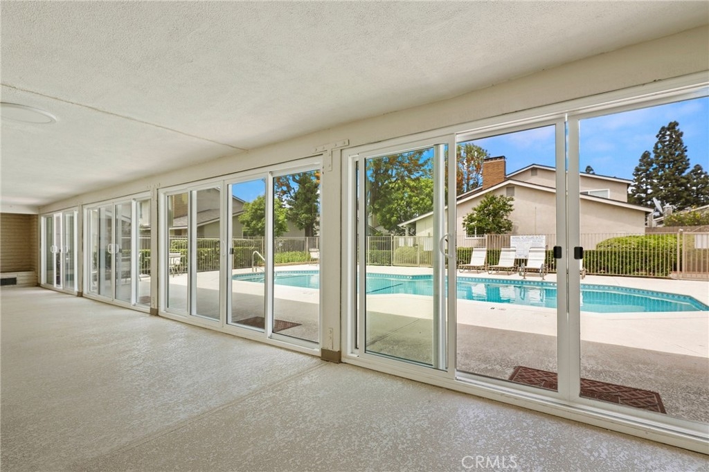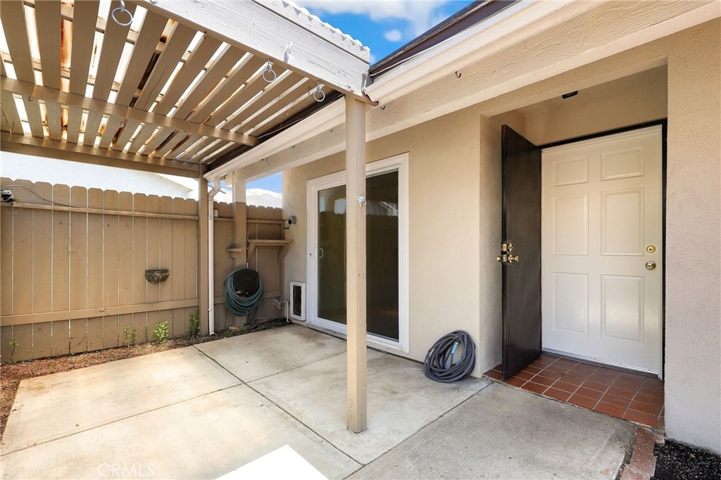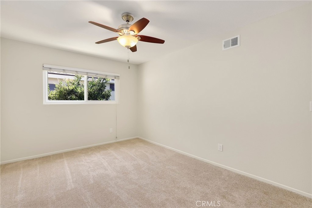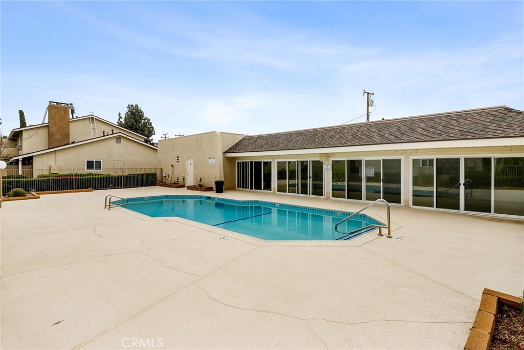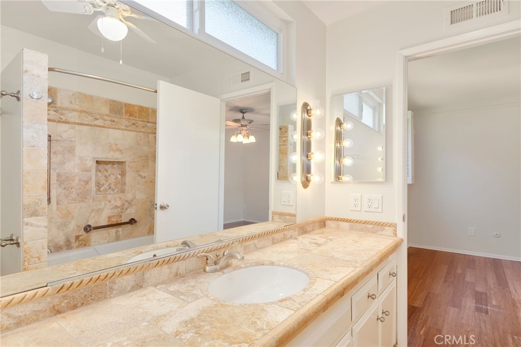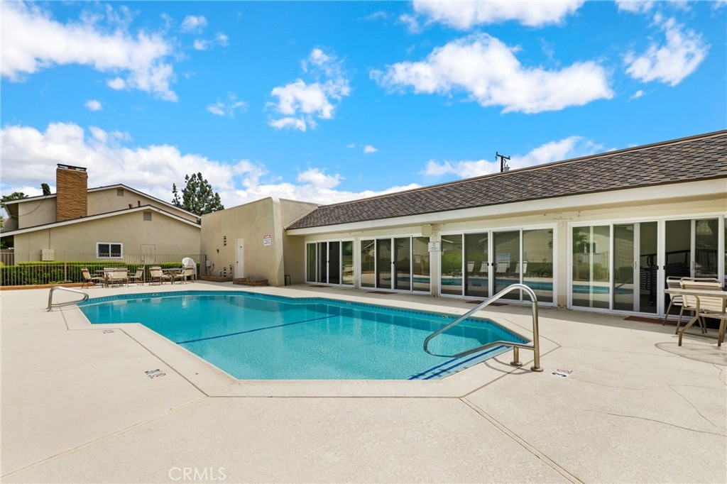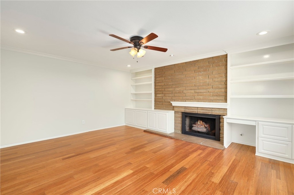 This beautiful single level home is located in the Tustin Verdes Community in desirable Tustin. The living room features gorgeous Bamboo flooring, crown molding, ceiling fan, stone fireplace with custom built-in book cases, shelving, storage and desk area. The newly interior paint of modern white bright tones and large windows allow an abundance of natural light to illuminate the open floor plan throughout. The kitchen impresses with clean white cabinetry, Granite countertops, plenty of storage, a large walk-in pantry with peg board system, dishwasher, recessed lighting, a long breakfast bar countertop for stool seating and tile flooring. The Stainless-Steel appliances include a double sink with fancy faucet, a gas 5 burner single oven range, and range hood. Adjacent is a dining area with ceiling fan and a large sliding door that leads to the large patio. The spacious primary en-suite features Bamboo flooring, ceiling fan, walk-in closet with custom shelving and racks, a single sink vanity, long Travertine countertops with plenty of storage, Jacuzzi style soak tub (no jets) surrounded by stone Travertine and shower in tub. The secondary bedroom is of a generous size, ceiling fan, closet doors, new carpet and a large window with binds. The hallway bathroom features Travertine countertops, single vanity, glass enclosed step in Travertine shower and stone flooring. The private front patio welcomes you with a custom patio cover, paved area, and perfect for planter boxes and vegetable gardens. A one-car detached garage (#46) includes shelving and buyer to register for the one permitted parking spot. Additional features include A/C unit with newer Ducting system, Dual Pane windows, new doors, brand new water heater and security system. Enjoy the Community amenities pool, clubhouse, greenbelt area, well manicure grounds, gated community and two common laundry facilities. Nearby Old Town and North Tustin shopping, restaurants, parks, easy access to the 55, 22 and 5 freeways.
