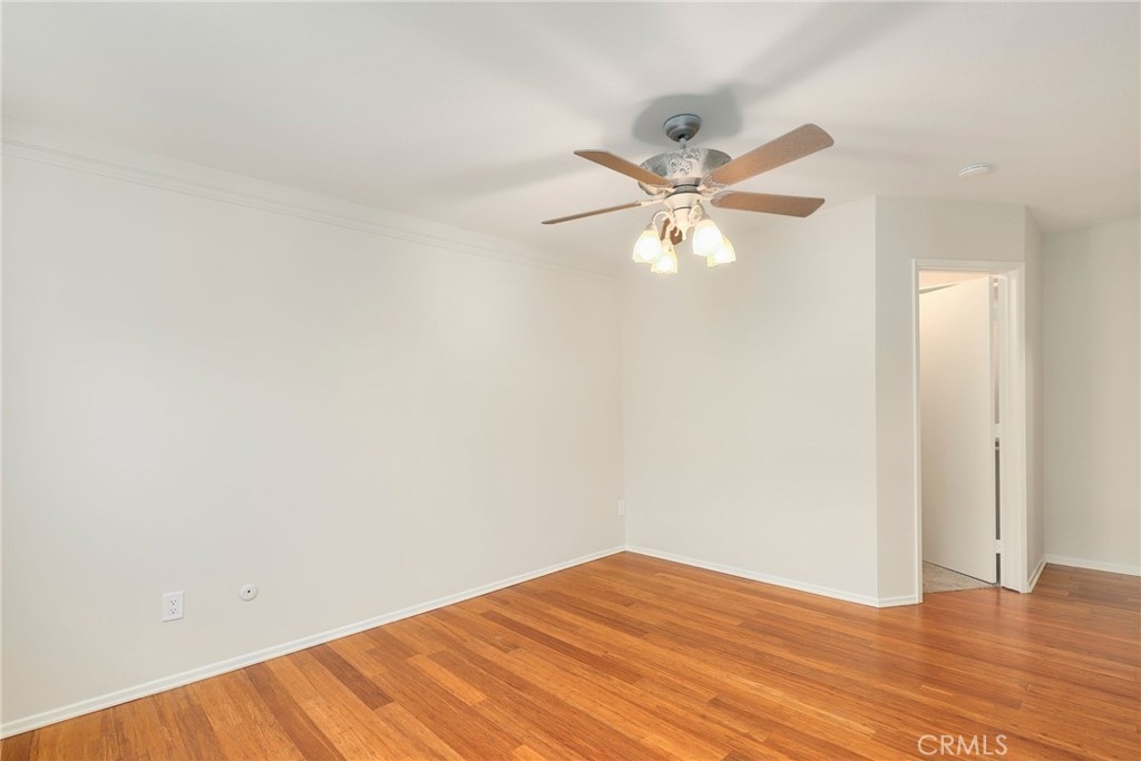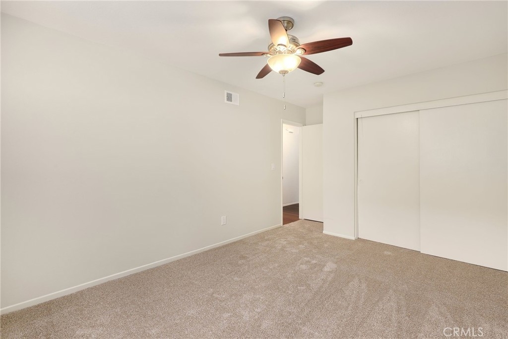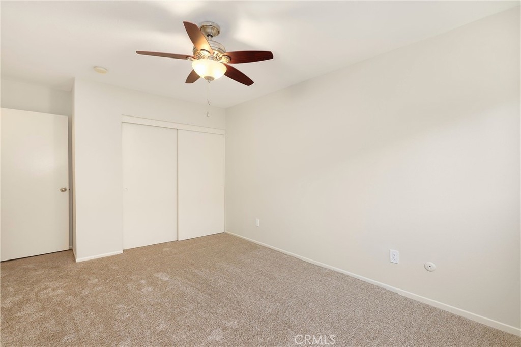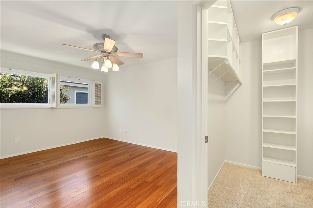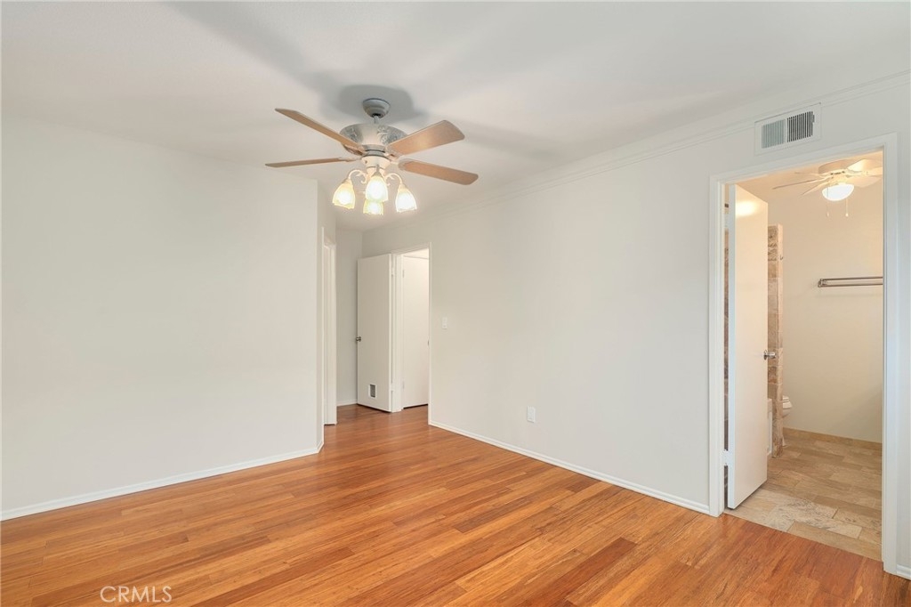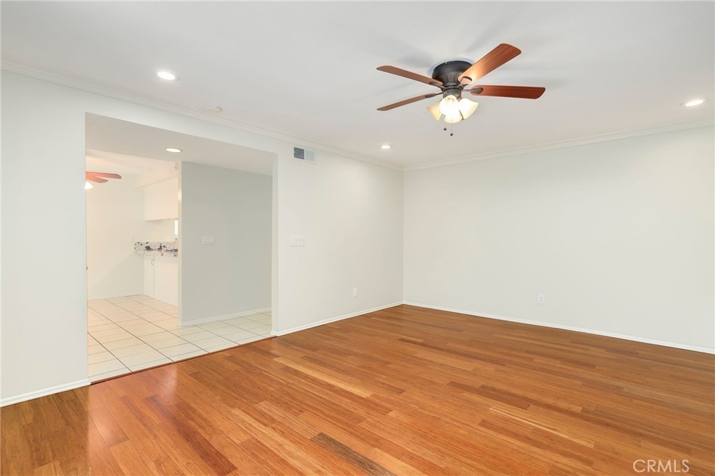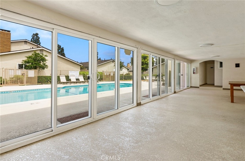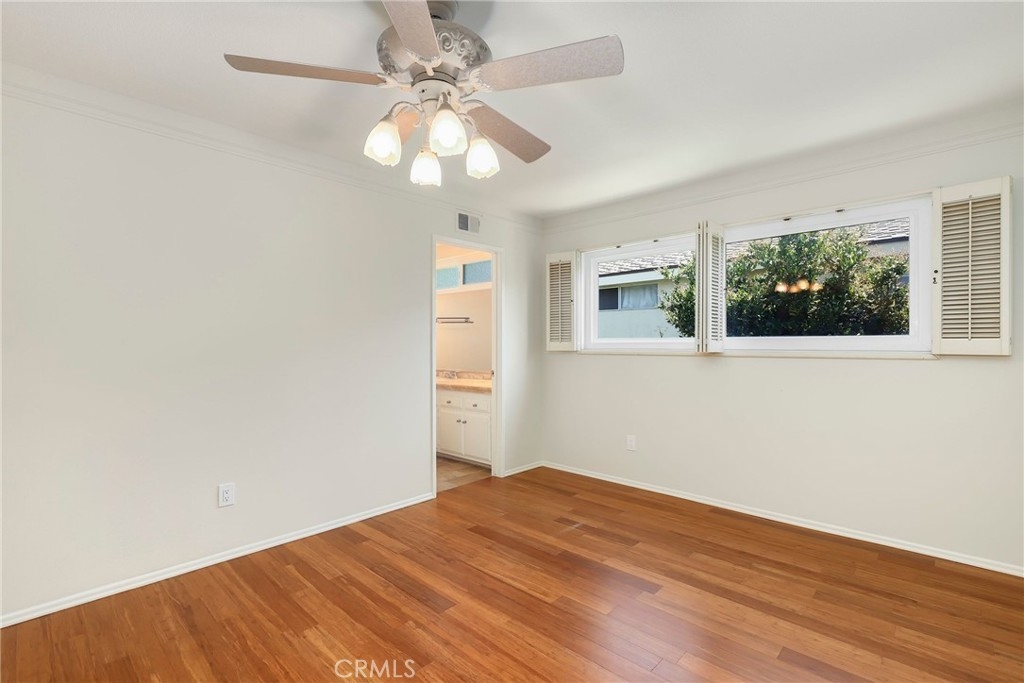 This beautiful single level home is located in the Tustin Verdes Community in desirable Tustin. The living room features gorgeous Bamboo flooring, crown molding, ceiling fan, stone fireplace with custom built-in book cases, shelving, storage and desk area. The newly interior paint of modern white bright tones and large windows allow an abundance of natural light to illuminate the open floor plan throughout. The kitchen impresses with clean white cabinetry, Granite countertops, plenty of storage, a large walk-in pantry with peg board system, dishwasher, recessed lighting, a long breakfast bar countertop for stool seating and tile flooring. The Stainless-Steel appliances include a double sink with fancy faucet, a gas 5 burner single oven range, and range hood. Adjacent is a dining area with ceiling fan and a large sliding door that leads to the large patio. The spacious primary en-suite features Bamboo flooring, ceiling fan, walk-in closet with custom shelving and racks, a single sink vanity, long Travertine countertops with plenty of storage, Jacuzzi style soak tub (no jets) surrounded by stone Travertine and shower in tub. The secondary bedroom is of a generous size, ceiling fan, closet doors, new carpet and a large window with binds. The hallway bathroom features Travertine countertops, single vanity, glass enclosed step in Travertine shower and stone flooring. The private front patio welcomes you with a custom patio cover, paved area, and perfect for planter boxes and vegetable gardens. A one-car detached garage (#46) includes shelving and buyer to register for the one permitted parking spot. Additional features include A/C unit with newer Ducting system, Dual Pane windows, new doors, brand new water heater and security system. Enjoy the Community amenities pool, clubhouse, greenbelt area, well manicure grounds, gated community and two common laundry facilities. Nearby Old Town and North Tustin shopping, restaurants, parks, easy access to the 55, 22 and 5 freeways.