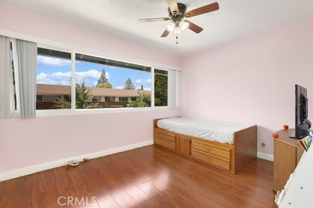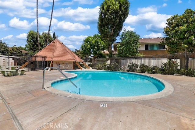 Enter through the front door into a spacious and bright living area with gorgeous laminate flooring, a fireplace, a ceiling fan, and a slider glass door into your private front yard. The kitchen has updated counters, tile backsplash, and recessed lighting. There is also an adjacent dining room. Up the stairs are the generously sized bedrooms. The primary bedroom is spacious with a ceiling fan and large windows. The two secondary bedrooms also feature ceiling fans. This home is a desirable end unit townhome and comes with 2 reserved spaces in the covered carport and 2 first come first served spaces outside. The property also has 2 permits for guests to park. Tustin Village Community offers its residents a pool, playground, and dog park.