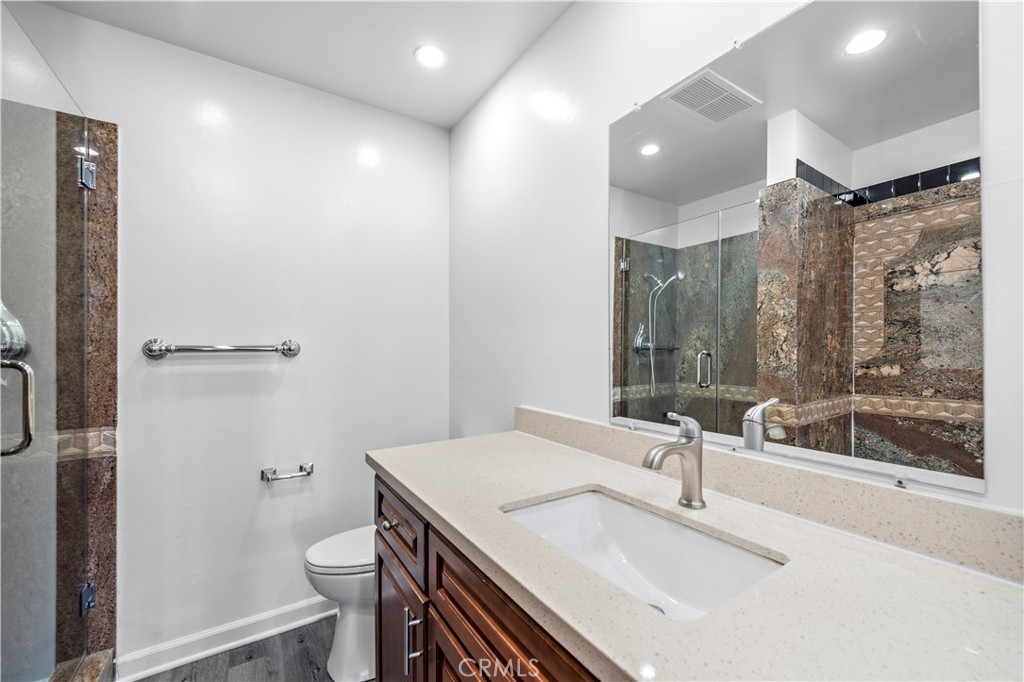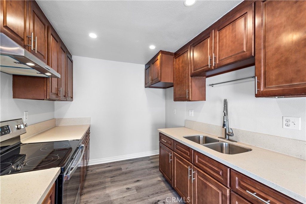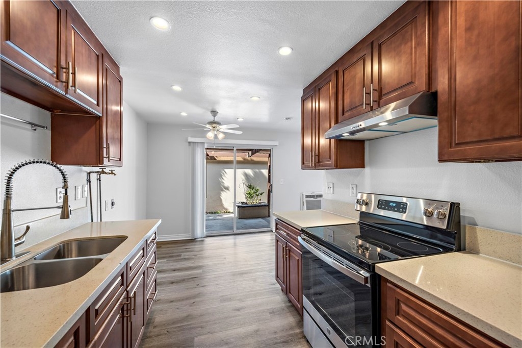 Excellent opportunity to live in Tustin at an affordable price! This beautiful 2 bedroom/1 bathroom unit has been beautifully updated throughout with brand new plank flooring, updated kitchen with cherry cabinetry and quartz countertops. Both bedrooms are upstairs and share a luxurious bathroom with separate tub and walk in shower adorned with granite. The vanity is cherry with quartz countertops. There is a large fully fenced patio accessed off the kitchen and living room making this an indoor/outdoor home extending your living space. Just steps from the carports. Fantastic community with association pool, laundry and a dog park. Excellent location with easy freeway access and proximity to dining and shopping.