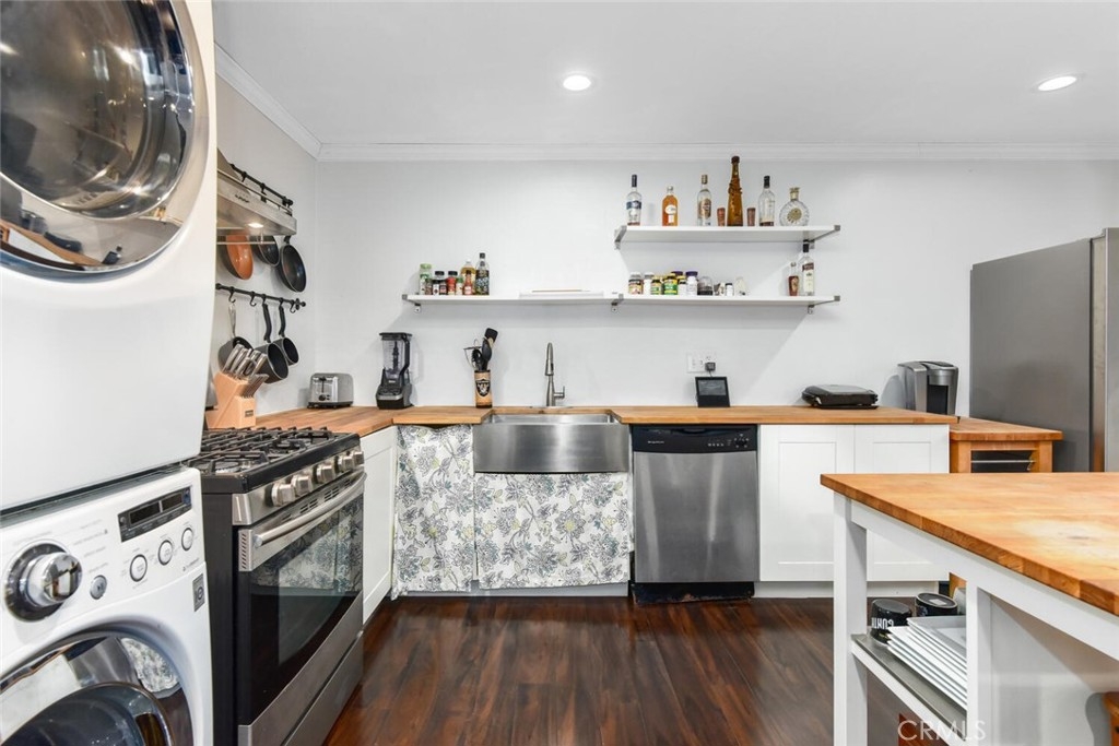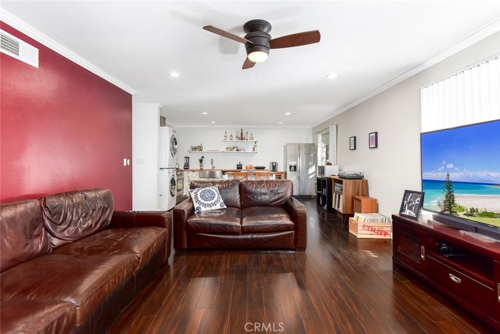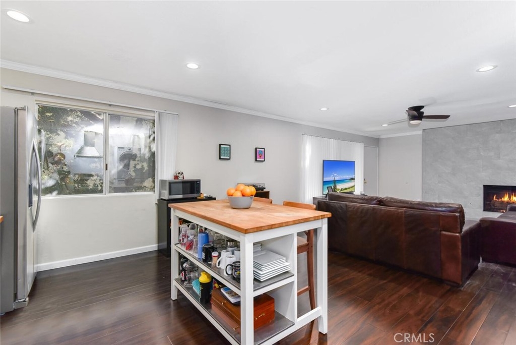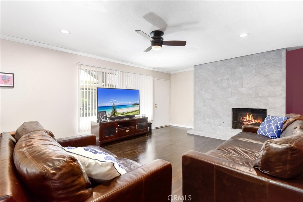 Beautifully remodeled 2 bedroom 2 full bathroom home offering an open floor plan with PRIVATE 2 car garage, in unit laundry, Central A/C and a Great location. This desirable end unit is bright and open with wood laminate flooring, beautiful paint palette and a flood of natural light. You are welcomed into the great room with recessed lighting, ceiling fan and beautifully tiled gas fireplace. The remodeled kitchen boasts white cabinetry, center island and stainless steel appliances including Refrigerator, Gas Stove, Washer and Dryer. The spacious Master bedroom includes a walk in closet, ceiling fan and tree views with no one behind you. The secondary bedroom has neutral carpet and mirrored closet doors. Both full bathrooms have updated vanities with neutral finishes. Williamshire boasts some of the best landscaping and green belts around, resort style pool with designer seating, gym, clubhouse and additional laundry room. The HOA also pays for water and trash! Located in the Award Winning Tustin Unified School District, close to Old Town Tustin, all major freeways and Tustin Marketplace with shopping and dining. Don’t Miss Out!