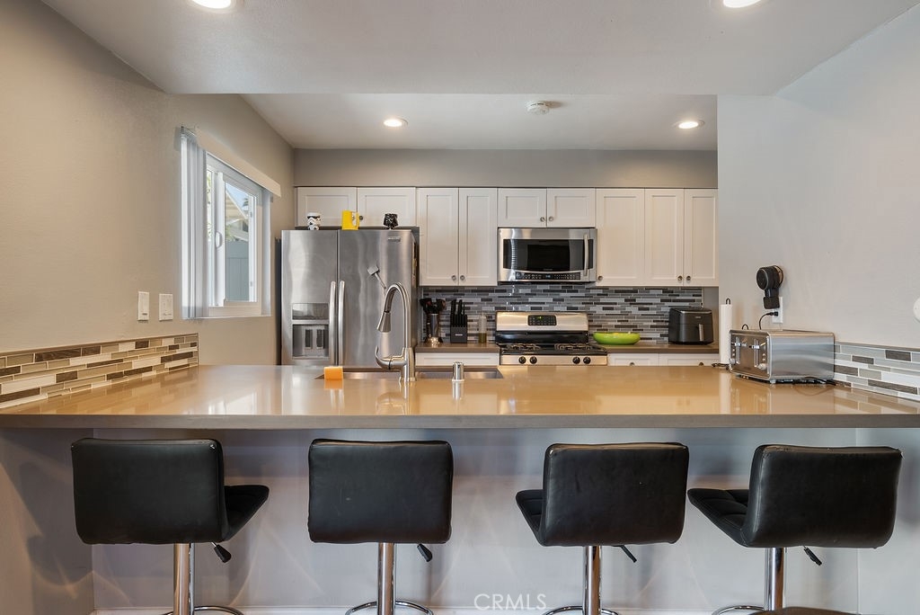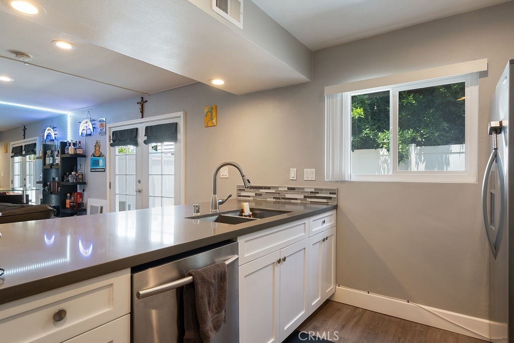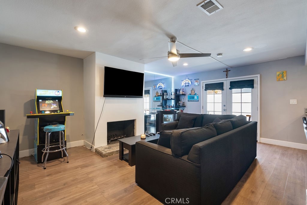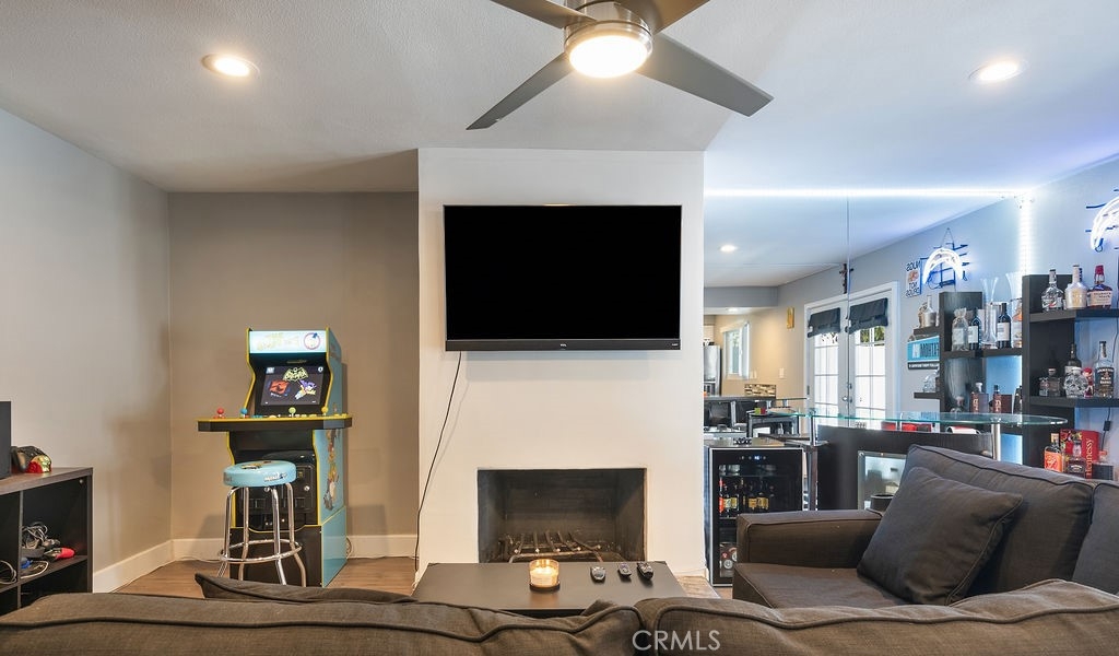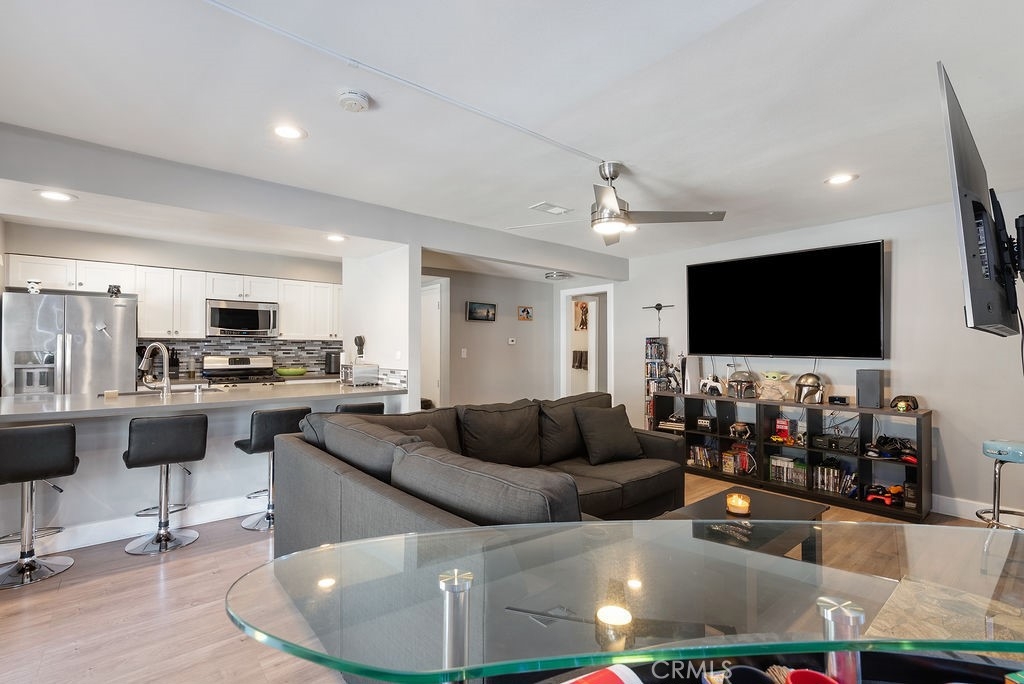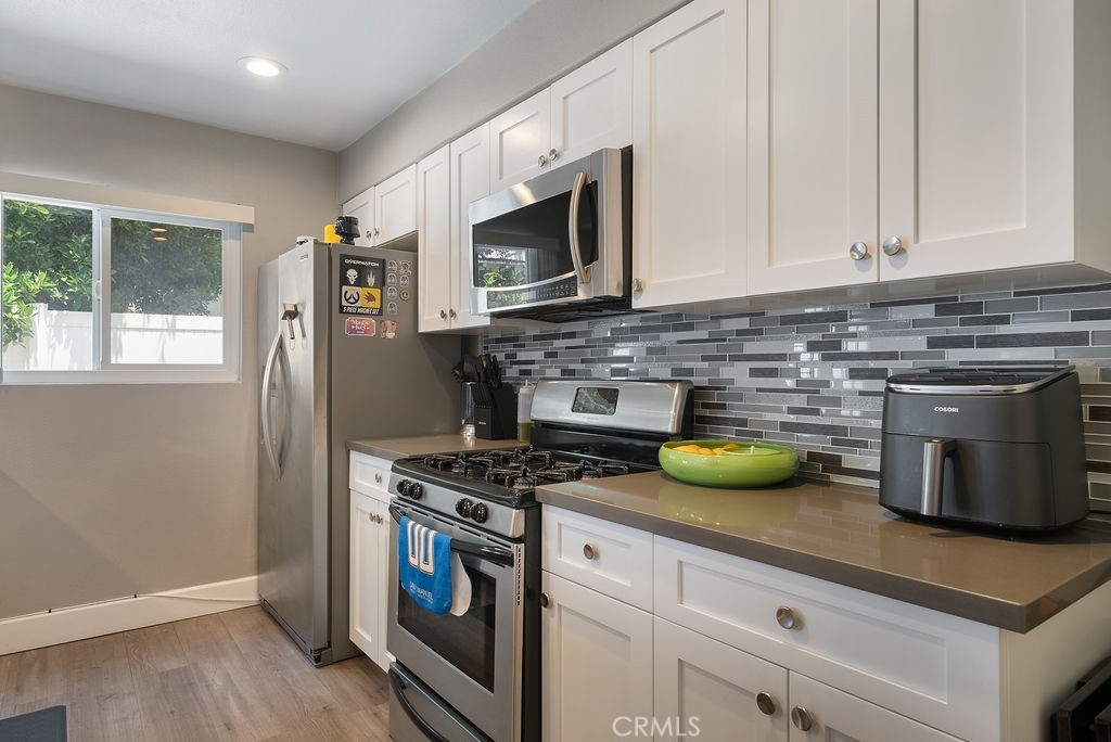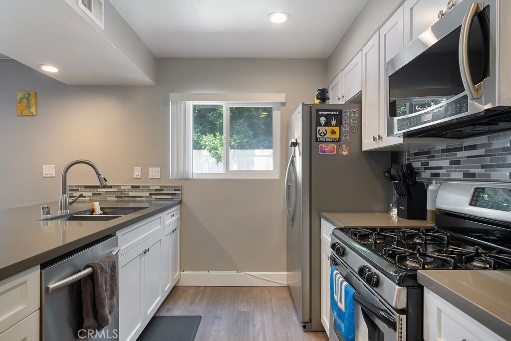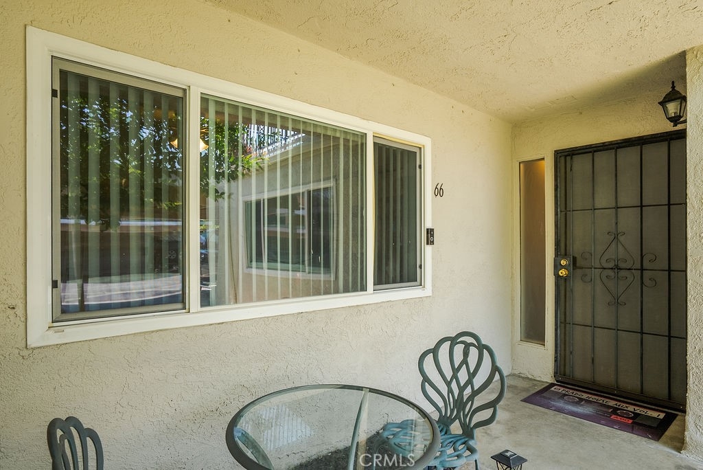 Price reduced! This nicely upgraded 2-bedroom, 2-bathroom condo welcomes you home. Perfectly positioned near premier shopping, delectable dining, and the bustling Tustin Market Place, with seamless access to the 5 and 55 freeways, convenience is at your doorstep. Step inside to a turnkey unit, with laminate wood flooring throughout, complemented by an upgraded open kitchen boasting sleek cabinets, shimmering quartz countertops, and stainless appliances. The fully updated bathrooms feature chic vanities, while custom LED lighting casts a warm glow across every room. Upgraded doors, windows, and a wall AC unit ensure year-round comfort, blending style with functionality. Cozy up by the fireplace, enjoy the convenience of in-unit washer and dryer hookups, and step outside to your private backyard—perfect for savoring Southern California’s idyllic weather. Beyond your door, indulge in resort-style amenities, including a sparkling community pool, inviting clubhouse, and playful playground. Perfect 2 bedroom starter home in the Heart of OC!
