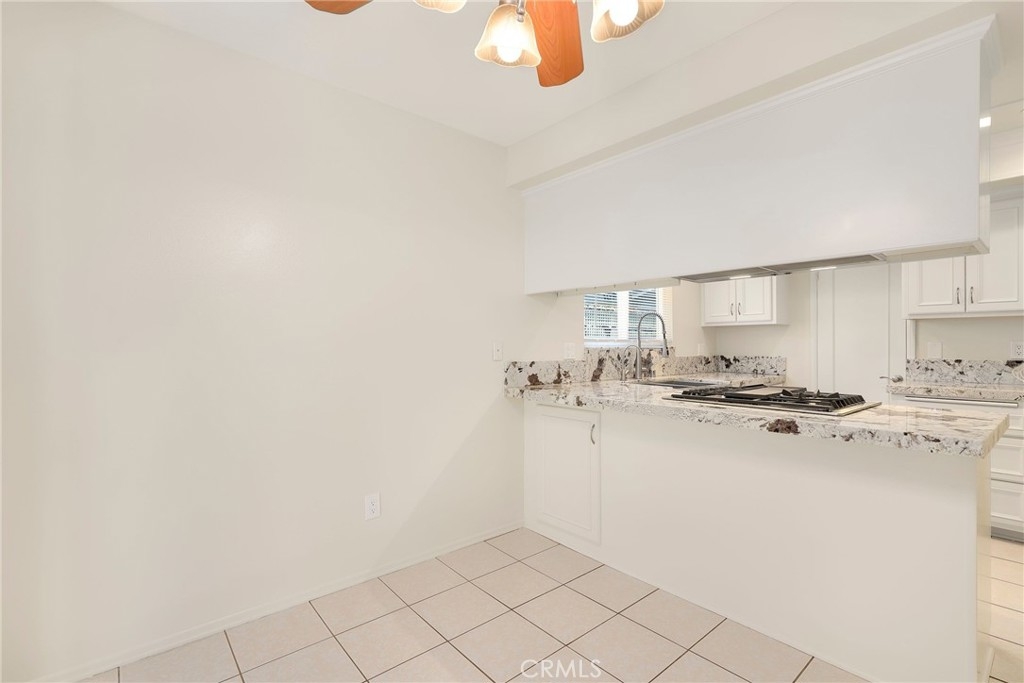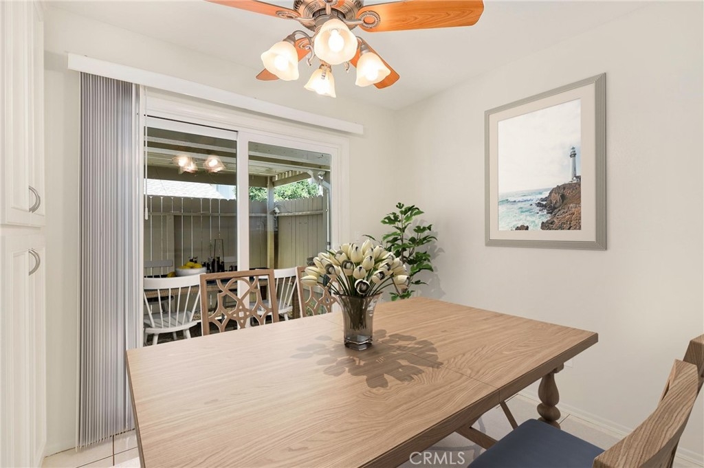 This beautiful single level home is located in the Tustin Verdes Community in desirable Tustin. The living room features gorgeous Bamboo flooring, crown molding, ceiling fan, stone fireplace with custom built-in book cases, shelving, storage and desk area. The newly interior paint of modern white bright tones and large windows allow an abundance of natural light to illuminate the open floor plan throughout. The kitchen impresses with clean white cabinetry, Granite countertops, plenty of storage, a large walk-in pantry with peg board system, dishwasher, recessed lighting, a long breakfast bar countertop for stool seating and tile flooring. The Stainless-Steel appliances include a double sink with fancy faucet, a gas 5 burner single oven range, and range hood. Adjacent is a dining area with ceiling fan and a large sliding door that leads to the large patio. The spacious primary en-suite features Bamboo flooring, ceiling fan, walk-in closet with custom shelving and racks, a single sink vanity, long Travertine countertops with plenty of storage, Jacuzzi style soak tub (no jets) surrounded by stone Travertine and shower in tub. The secondary bedroom is of a generous size, ceiling fan, closet doors, new carpet and a large window with binds. The hallway bathroom features Travertine countertops, single vanity, glass enclosed step in Travertine shower and stone flooring. The private front patio welcomes you with a custom patio cover, paved area, and perfect for planter boxes and vegetable gardens. A one-car detached garage (#46) includes shelving and buyer to register for the one permitted parking spot. Additional features include A/C unit with newer Ducting system, Dual Pane windows, new doors, brand new water heater and security system. Enjoy the Community amenities pool, clubhouse, greenbelt area, well manicure grounds, gated community and two common laundry facilities. Nearby Old Town and North Tustin shopping, restaurants, parks, easy access to the 55, 22 and 5 freeways.