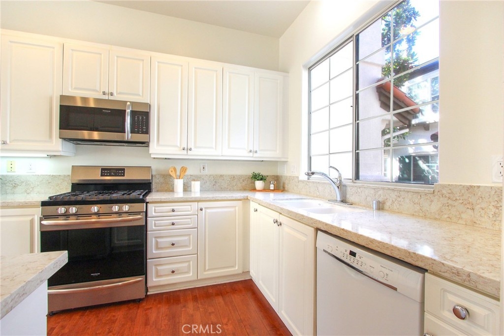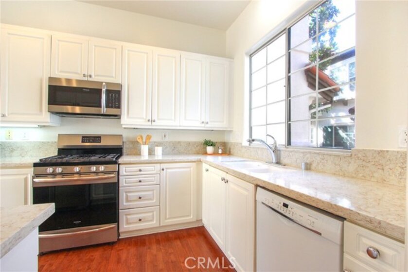 Make your home at Tustin's favorite luxury townhome community, Venturanza Del Verde. This gorgeous unit is remodeled and completely turnkey, with three large bedrooms upstairs, PLUS a secluded office, game room or craft area downstairs. A large rear facing double car garage opens into the courtyard, and provides direct access to the lower floor--which includes laundry, a half bath/powder room, and the office/game room. The main level is a spacious greatroom, with Brazilian Cherry hardwood floors, soaring ceilings, and lots of large sunny windows. A modern kitchen with elegant newer quartz countertops, the dining room, a bright and warm family room, and a large living room with woodburning fireplace make up the open-concept main level. Step out of the main floor slider to a multi-level private patio, perfect for relaxing, sunning, or gardening. The garage has built-in cabinets that will stay with the property. Venturanza Del Verde has a beautiful community pool and spa area, which will make you feel like you are at a vacation resort every time you enjoy it. The location is a short walk to Tustin Ranch Elementary, Tustin Sports Park and Irvine Ranch Historic Park--as well as the amazing dining and entertainment options available at Tustin/Irvine Marketplace. Don't miss it--priced lower than similarly-sized units for quick sale!