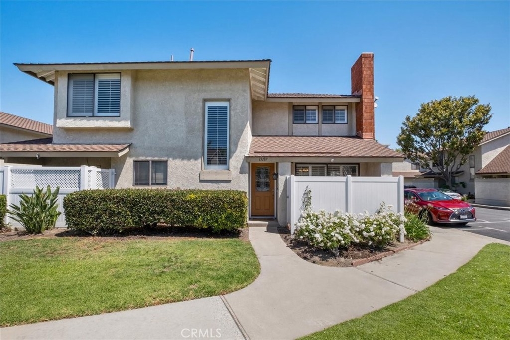 This one checks all the boxes! Upgraded end unit, 2 story townhome in the gated community of Briarcliff Village. Leaded glass front door leads to a tile entry. Spacious living room with cozy fireplace, recessed lighting and slider that leads to the enclosed patio. Wonderful open floorplan. Laminate flooring is in most rooms. Plantation shutters throughout. Crown molding downstairs. Large dining area. Stone counters in kitchen with white cabinets, stainless appliances, microwave included and updated recessed lighting. Direct access to the oversized two car garage and laundry just outside the kitchen. Remodeled powder room downstairs with newer vanity, fixtures and tile floors. King sized master suite – ceiling fan and recessed lighting. Master bathroom has separate toilet and shower room. The bathroom has newer tile shower and flooring, newer vanity and fixtures. Remodeled hall bathroom has bathtub and newer vanity. Ceiling fans in spacious secondary bedrooms. Central Air Conditioning. Sunny front patio with vinyl fencing. Community pool and spa. Walk to the Santa Ana Zoo and Old Town Tustin.