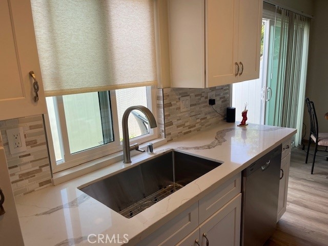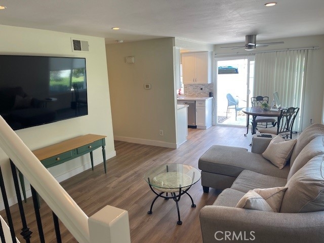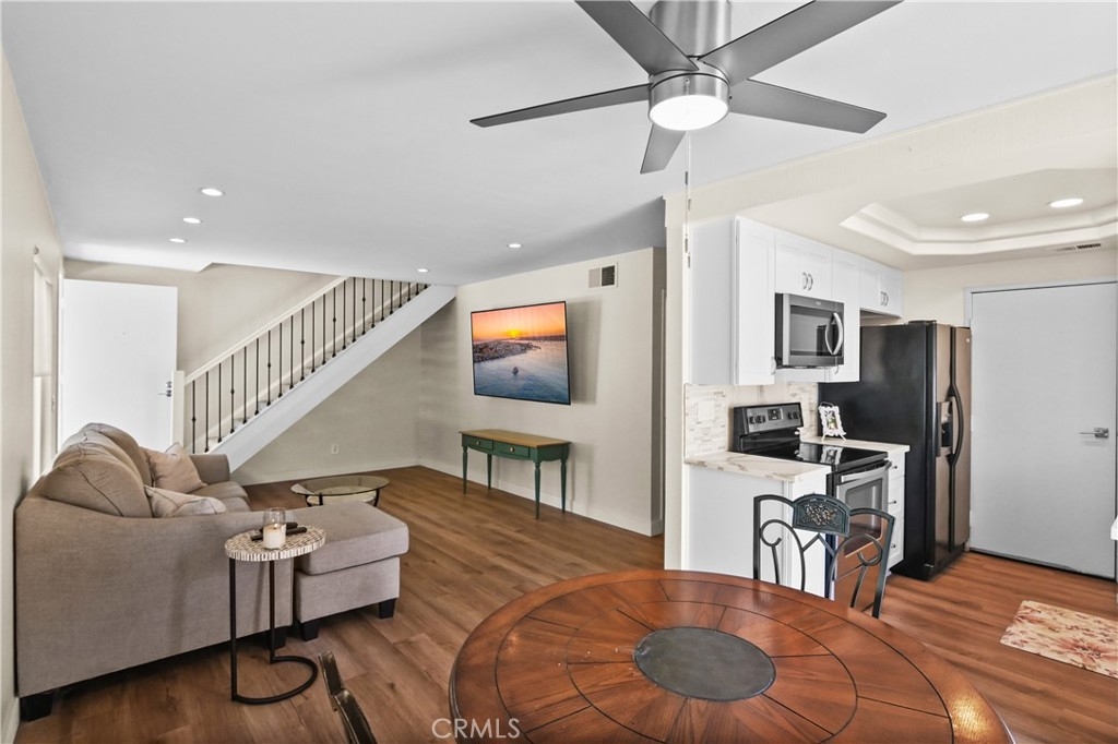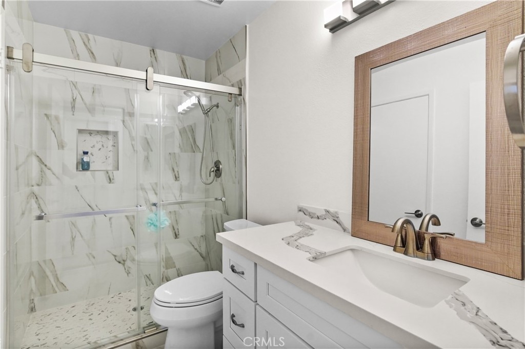 Beautiful two-Story Condo end unit. Beautifully upgraded including new Kitchen Cabinets and Quartz Counter tops. Waterproof Luxury Vinyl Floors, and low profile baseboards, Remodeled baths including walk in shower with new designer marble and Glass barn style shower doors. Dual Payne energy saving windows new paint and ceiling fans throughout, walk in closet in Master bedroom, Sunny patio end unit. Gated community with large pool and spa plenty of parking. Excellent location just blocks from Old Town Tustin, shopping, dining and schools.