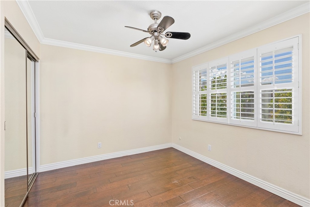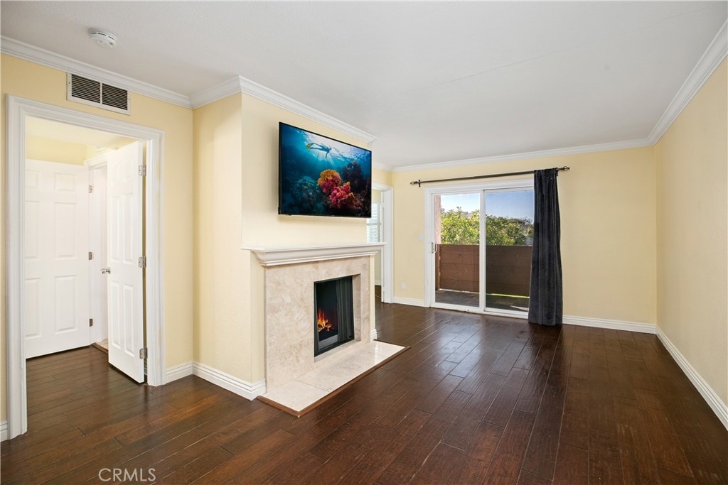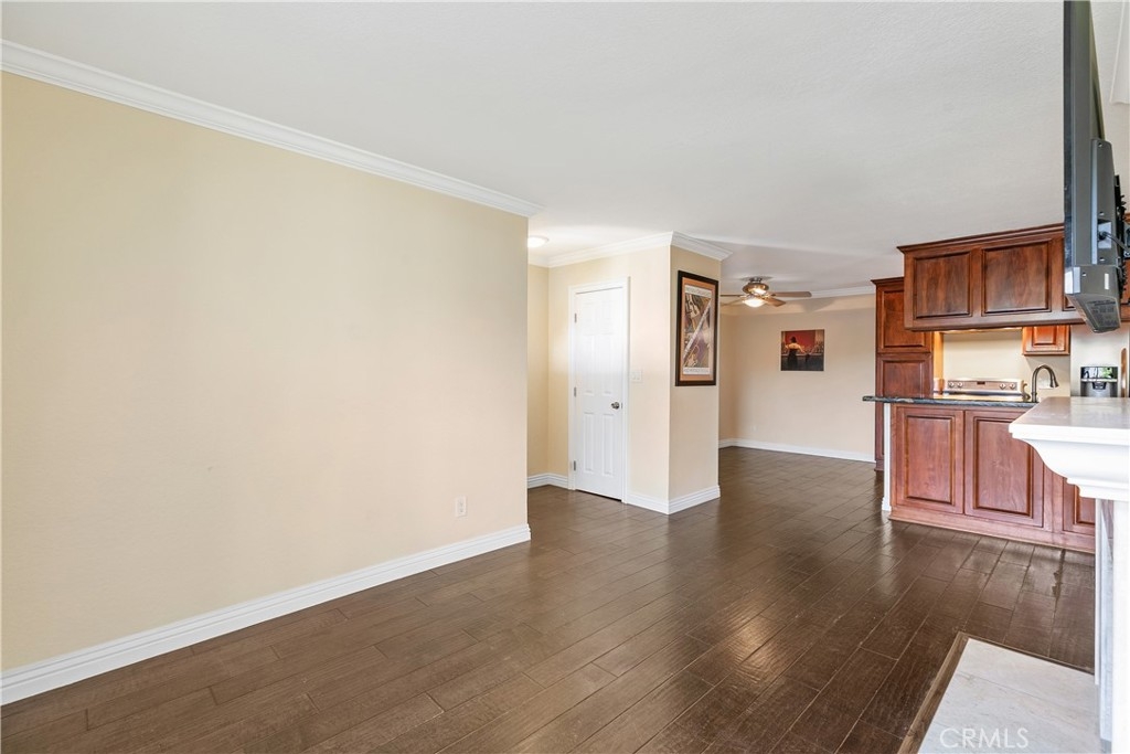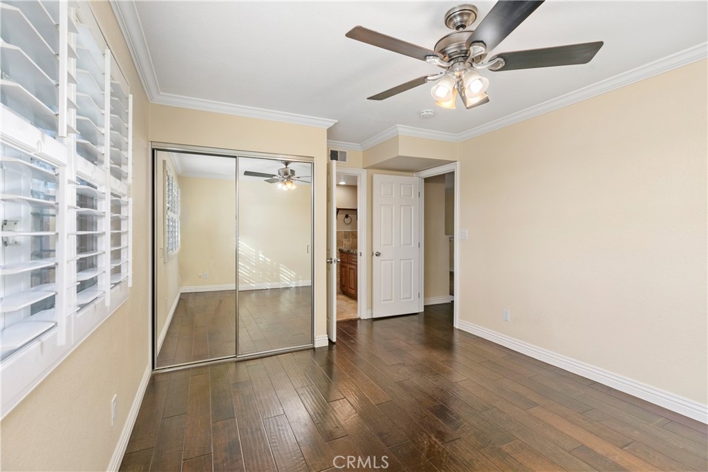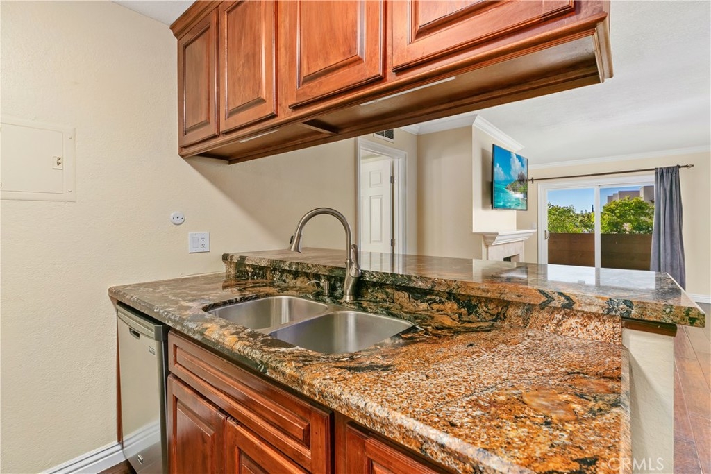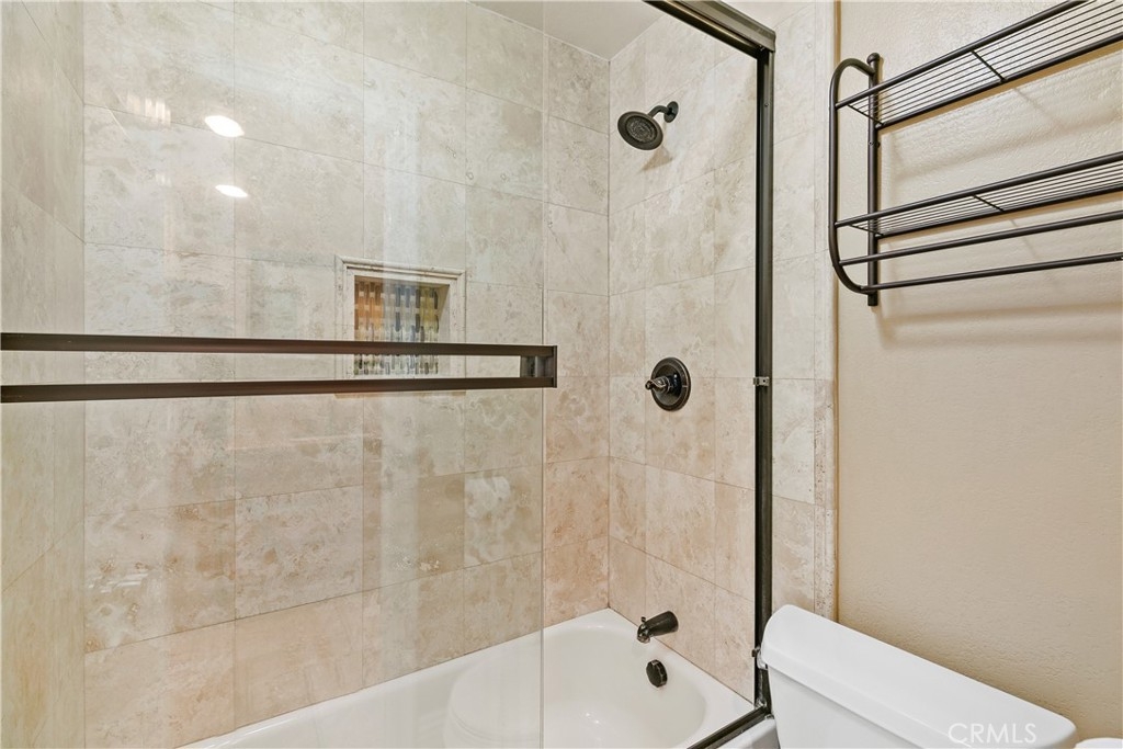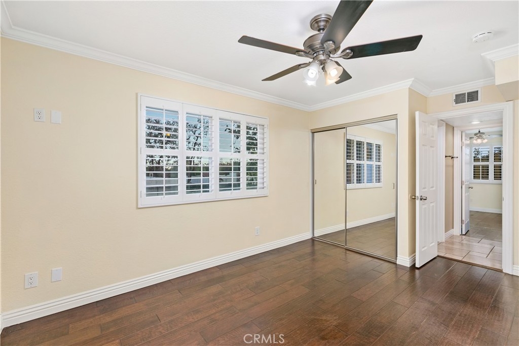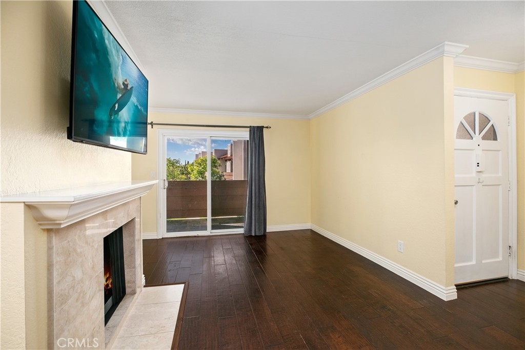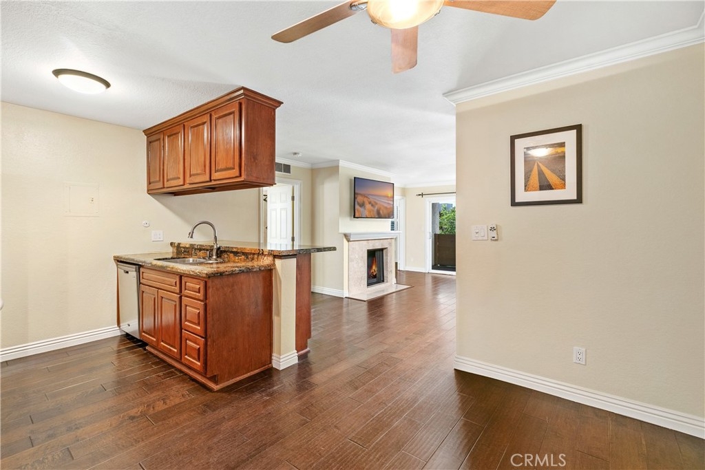 This quaint, remodeled 2 bed, 1 bath Quail Meadows condo is sure to captivate you from the minute you walk through the door. Situated on the 2nd floor facing the community greenbelt, you'll love the prime positioning of this end-unit condo as it does not look directly into another unit or building and is in close proximity to the community pool. Engineered hardwood floors grace the space, A travertine fireplace, granite counters, plantation shutters, and crown moulding give this condo an upscale touch. The open floor plan is ideal with the remodeled kitchen open to the living room with sliding doors opening to a balcony with unobstructed views of the community greenbelt. Enjoy the custom cabinetry, granite counters, stainless steel appliances, breakfast bar and nook the kitchen has to offer. Both bedrooms are generous sizes and connected to a jack-and-jill bath that has been remodeled with travertine tile and granite counters. Community amenities include: pool/spa, tennis courts, clubhouse, and laundry facilities. Located just off the 55 FWY and walking distance to local shopping and dining.