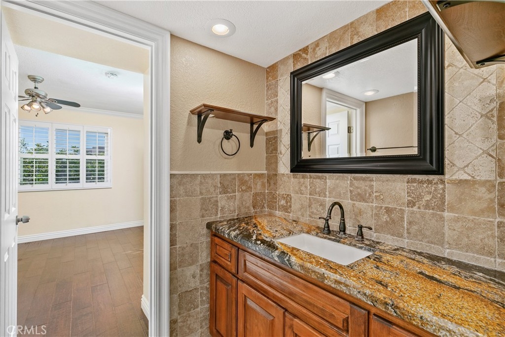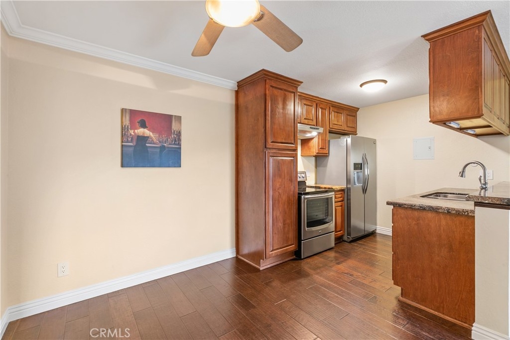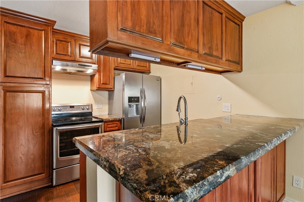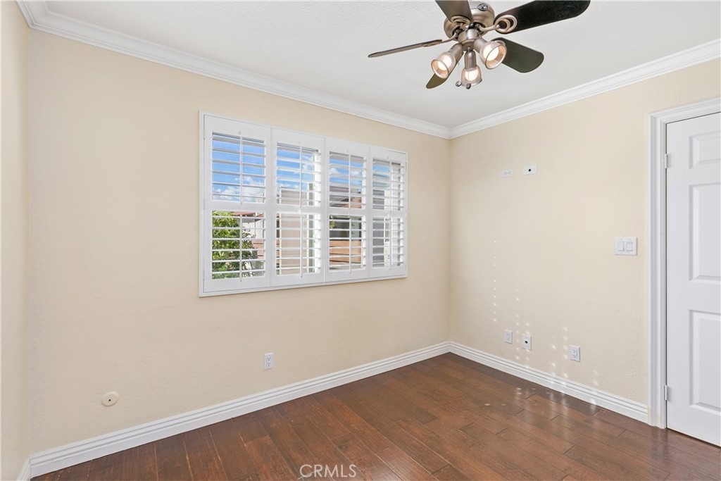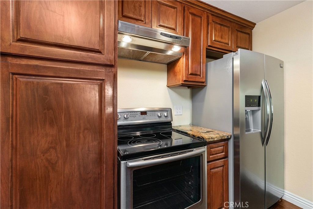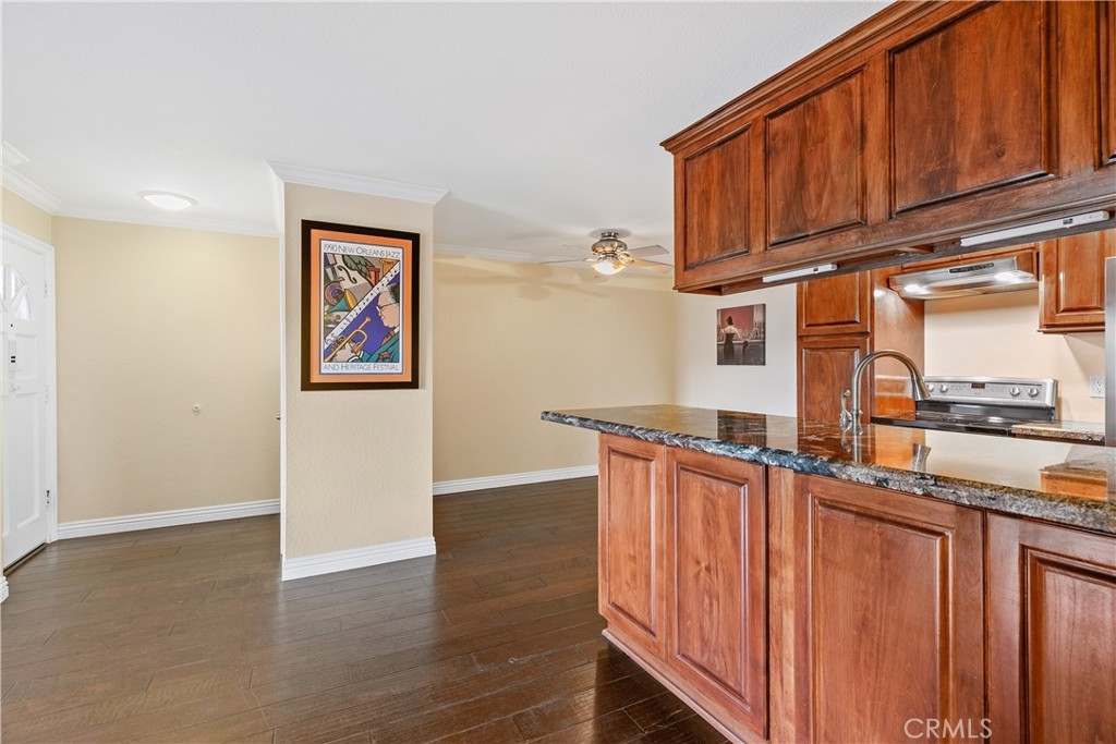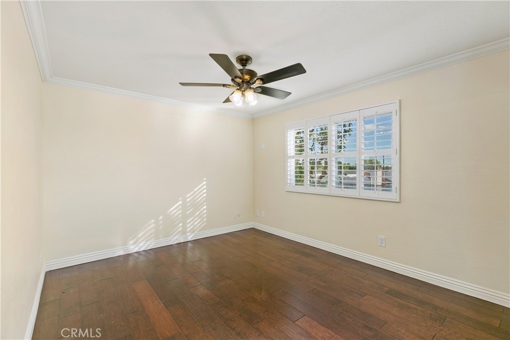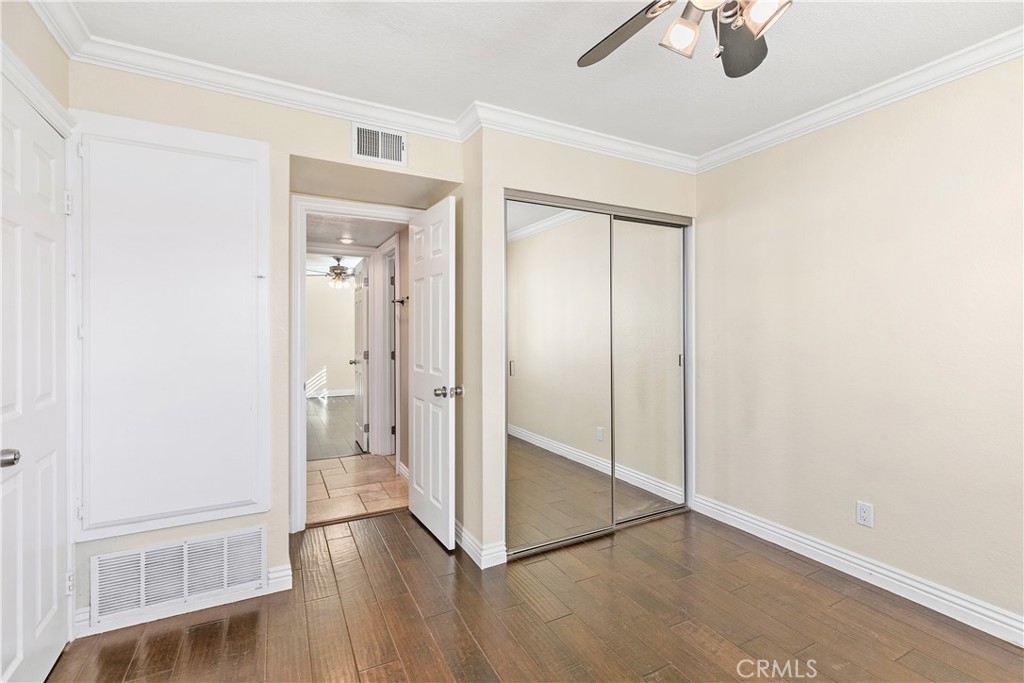 This quaint, remodeled 2 bed, 1 bath Quail Meadows condo is sure to captivate you from the minute you walk through the door. Situated on the 2nd floor facing the community greenbelt, you'll love the prime positioning of this end-unit condo as it does not look directly into another unit or building and is in close proximity to the community pool. Engineered hardwood floors grace the space, A travertine fireplace, granite counters, plantation shutters, and crown moulding give this condo an upscale touch. The open floor plan is ideal with the remodeled kitchen open to the living room with sliding doors opening to a balcony with unobstructed views of the community greenbelt. Enjoy the custom cabinetry, granite counters, stainless steel appliances, breakfast bar and nook the kitchen has to offer. Both bedrooms are generous sizes and connected to a jack-and-jill bath that has been remodeled with travertine tile and granite counters. Community amenities include: pool/spa, tennis courts, clubhouse, and laundry facilities. Located just off the 55 FWY and walking distance to local shopping and dining.