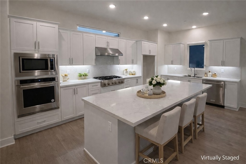 Fully owned solar system. Welcome to this highly upgraded Cira Plan 1 home in the desirable Tustin Legacy community. This modern three-story residence features a flexible floor plan with a ground-floor bedroom and full bath, ideal for guests, multigenerational living, or a home office. The second level offers an open-concept Great Room with soaring 10-foot ceilings, abundant natural light, and seamless flow between the living, dining, and kitchen areas. The kitchen is beautifully appointed with upgraded quartz countertops, contemporary cabinetry, and premium finishes, while luxury vinyl flooring enhances both style and durability throughout the main living spaces.The third level includes three bedrooms, highlighted by a spacious primary suite, along with secondary bedrooms and a conveniently located laundry area. All bathrooms and countertops throughout the home have been upgraded with quartz surfaces, reflecting thoughtful design and quality craftsmanship. Additional features include a fully paid-off solar system and numerous upgrades that elevate this home beyond standard new construction. Ideally located near parks, award-winning schools, and the shopping, dining, and entertainment at The District, this home offers modern comfort, efficiency, and an exceptional Tustin Legacy lifestyle.
