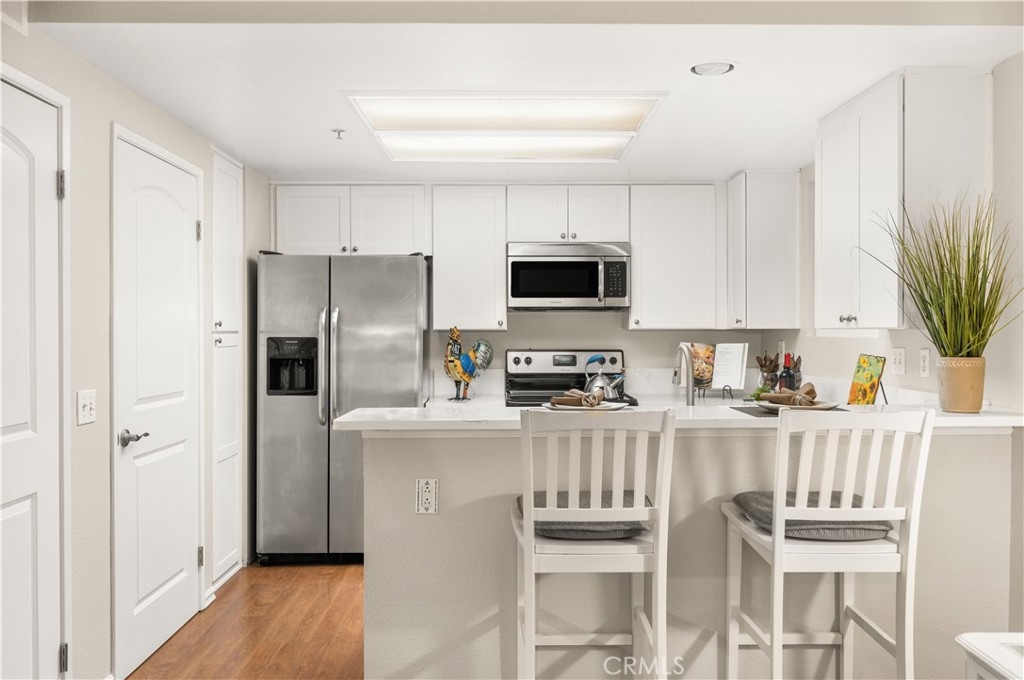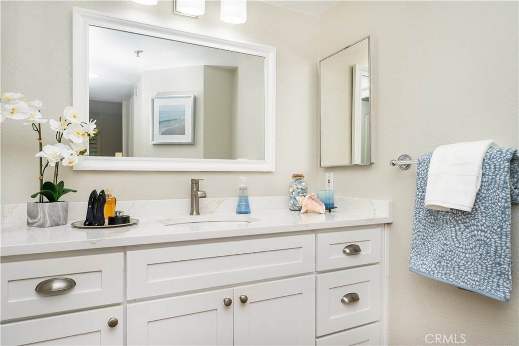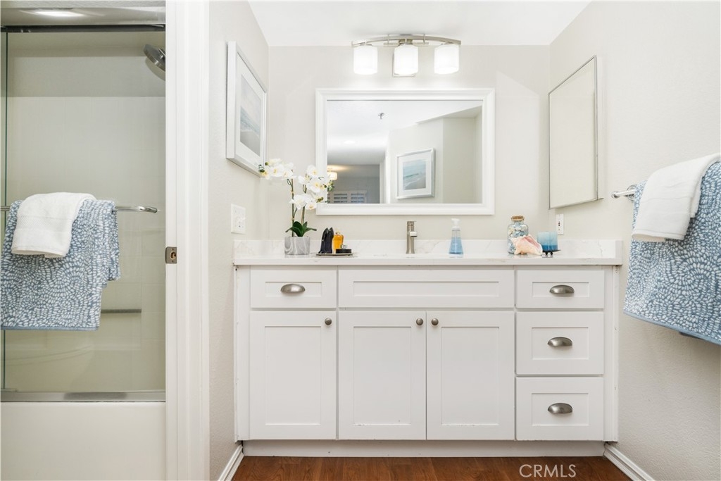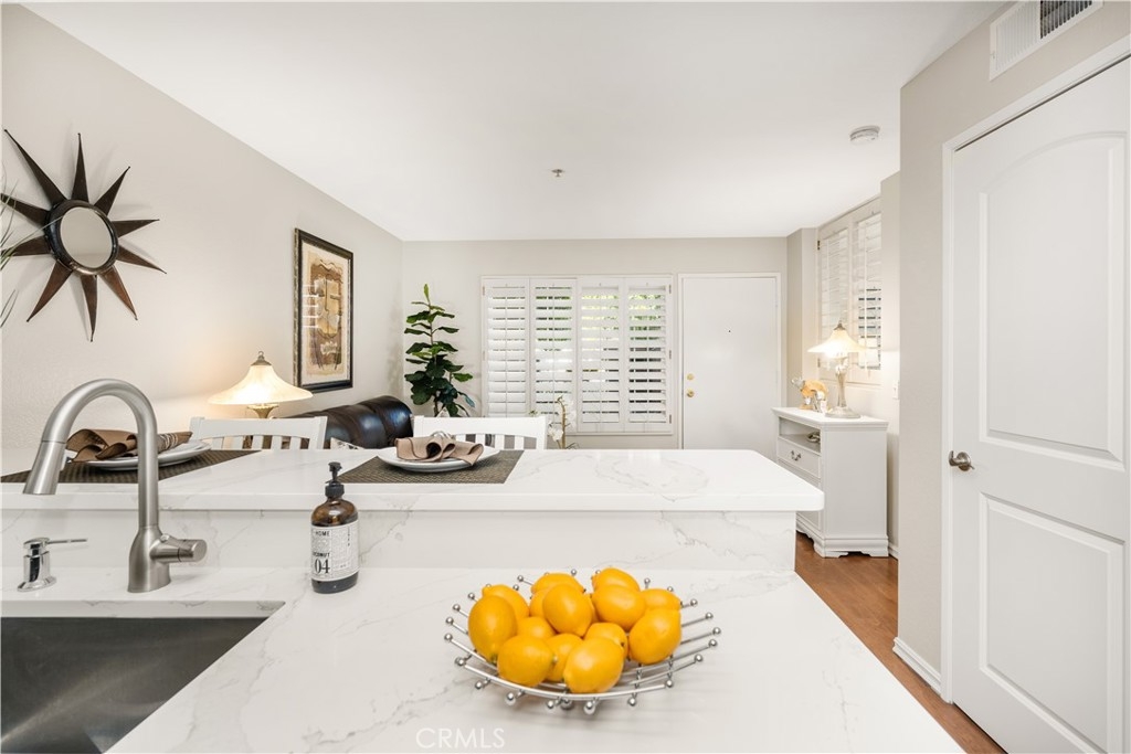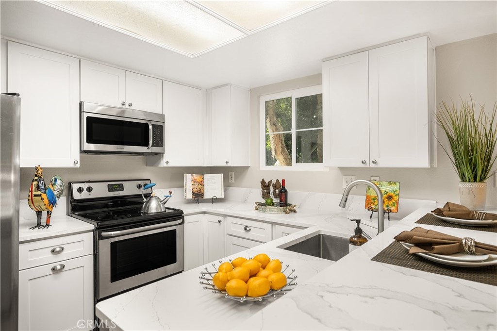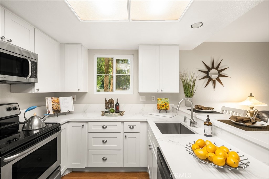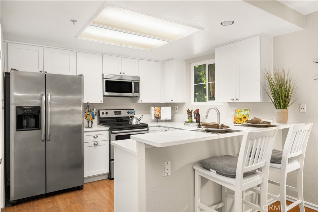 Welcome to this charming, junior 1-bedroom, condo located in the tree-lined streets of Mandevilla in the heart of Tustin Ranch. With living all on one level, this home is the perfect blend of convenience and comfort. As you step inside, you’re welcomed with an open floorplan as the living room opens to the kitchen. New paint creates a fresh and inviting atmosphere with plantation shutters adding a sense of style. The remodeled kitchen is a chef’s delight, featuring crisp, white, shaker-style cabinetry, quartz surfaces, pantry and stainless steel appliances—ideal for cooking your favorite meals or entertaining family and friends. The breakfast bar is a perfect spot to enjoy casual dining, with space for more formal dining. The spacious bedroom with plantation shutters and large walk-in closet, has a wall of mirrors, adding a sense of space to the room. The remodeled bathroom features newer white shaker-style cabinets, quartz surfaces, and private toilet/shower area. The detached one-car garage has extra space for convenient storage. Newer A/C, furnace and windows. Ideally located in the peaceful center of the community, you’ll love being close to two association pools/spas, and fitness center to stay active or just relax. Located across from Tustin Sports Park, you have access to a variety of outdoor recreation right at your doorstep. When it comes to shopping and dining, the nearby Marketplace has everything you need! Whether a first-time buyer, downsizing, or investment, don’t miss your chance to make this home your own! It’s a wonderful opportunity to enjoy the best Tustin Ranch has to offer! Make sure you check out both the Video Tour and Matterport 3D tour!