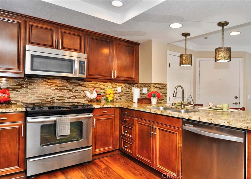 Absolutely Stunning Upper Unit in a Quiet Interior Location in the Highly Sought-After Resort Community of Mandeville. This 1 Bedroom, 1 Bath Unit Includes a Single Car Garage and an Extra Large Balcony with 2 Storage Closets. It has been Completely Upgraded with Impeccable Taste, Using the Highest Quality Materials & Craftsmanship. It Boasts an Open Floorplan, Central A/C, Crown Molding, Designer Paint, Smooth Ceilings, Ceiling Fans, Raised Panel Interior Doors, Custom Window and Door Casements, Tropical Woven Vertical Blinds, High Base Boards, Beautiful Wood Vinyl Flooring in Entry, Dining, and Kitchen, and a Completely Remodeled Gourmet Kitchen that Includes Granite Countertops, Glass Mosaic Tile Backsplach, Custom Dark Wood Cabinetry, Stainless Appliances (Microwave, Dishwasher, Electric Stove, Refrigerator), Coffered Ceiling, Recessed Lighting, Stainless Sink, and a Breakfast Bar w/Pendant Lighting. It has a Beautiful Spacious Living Room w/Slider to Balcony, a Full-Size Dining Room that's Open to the Living Room and the Kitchen, an Inside Laundry Closet w/Stackable Washer/Dryer, a Lovely Master Suite w/Slider to Balcony, Walk-In Closet and Beautiful Bathroom with Long Granite Vanity and Tiled Tub/Shower Combo w/Glass Enclosure. Enjoy the Association Amenities: 2 Pools, Spa, BBQ's, Tot Lot, Clubhouse, Fully Equipped Fitness Center, and Beautiful Grounds with Walking Paths. It is Close to Excellent Schools, Sports Park, Shopping, Dining, and Golf Course.