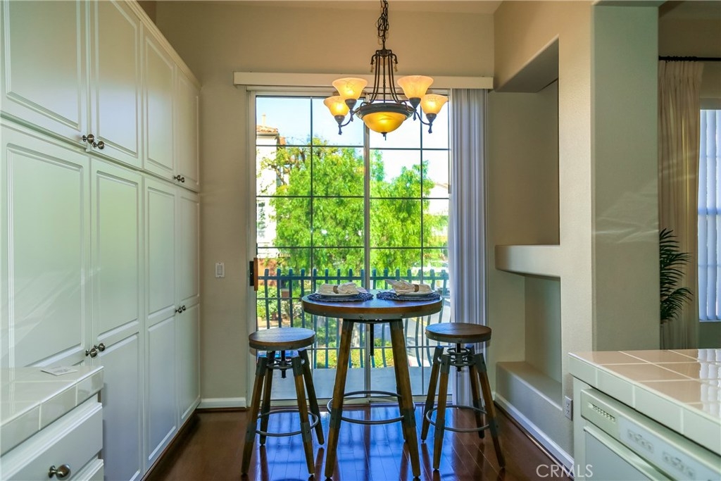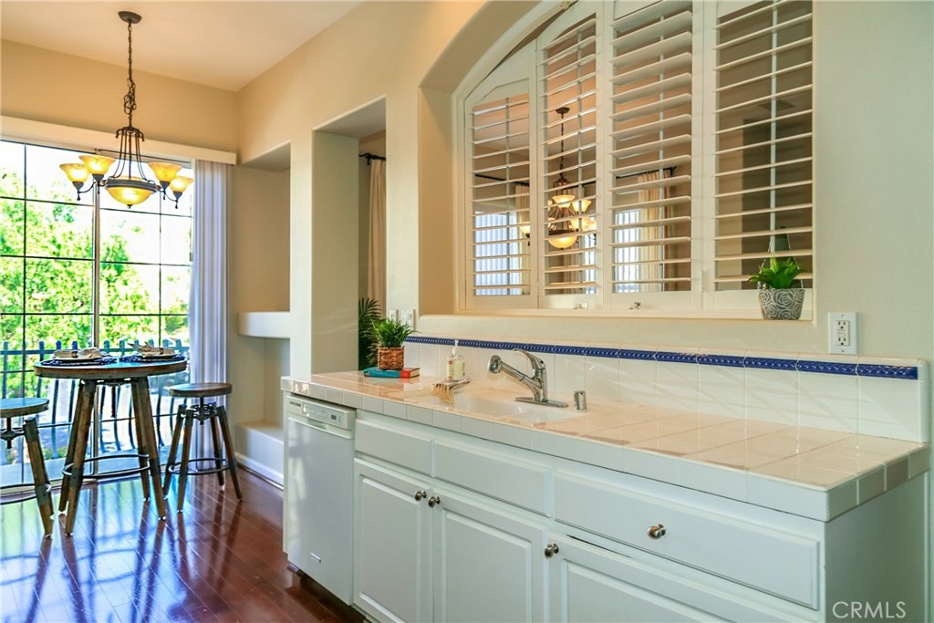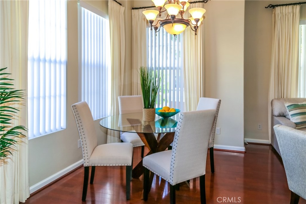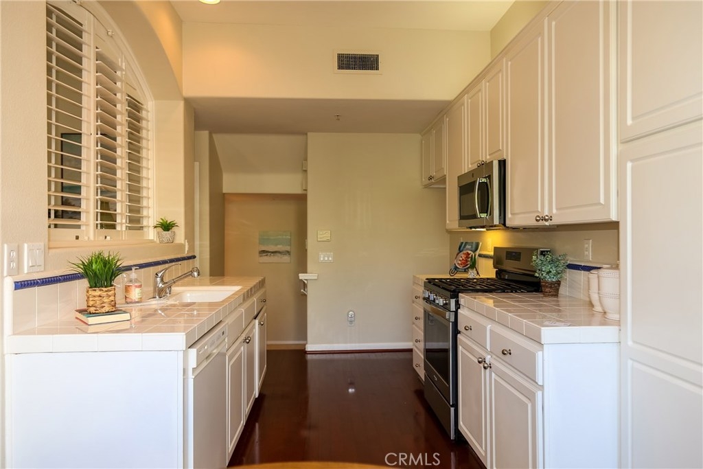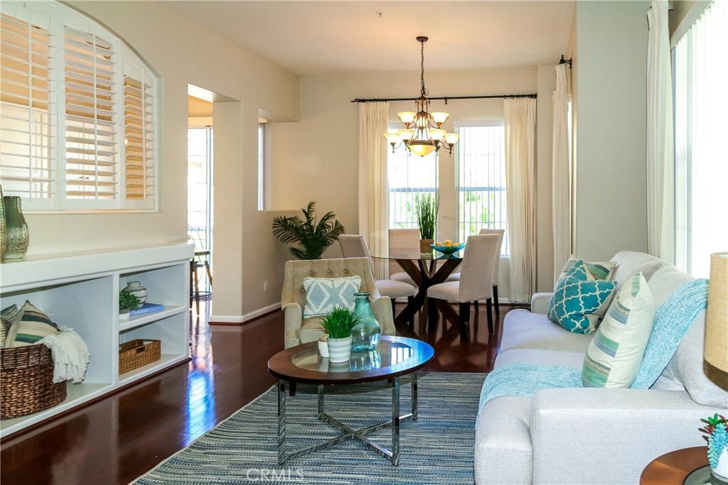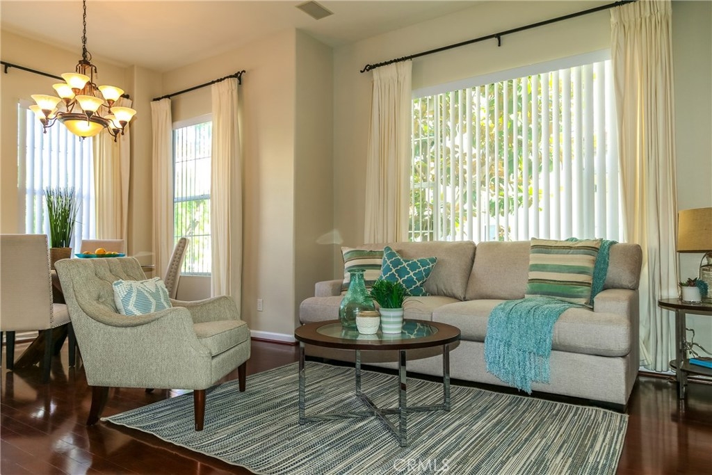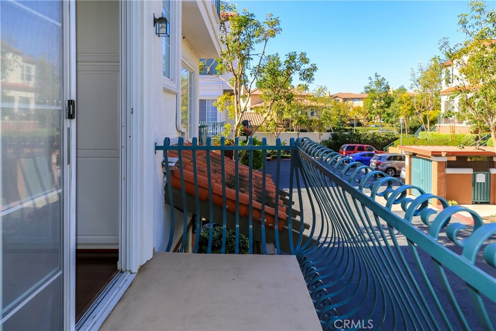 Premium location in sought after Tustin del Verde community. End unit with plenty of windows and tons of natural light. Locaated across from the park and walking distance to shopping, the golf course, and Sports park. This upgraded home used to be the model and has the upgrades to show for it. Fabulous wood flooring, new paint, 5 burner high end range and stainless steel applicances, The gourmet kitchen features a private balcony off the eating area with a tremendous amount of cabinetry and counter space, all this over looking the living area and formal dining area. A custom built in, neutral window coverings and a fireplace complete this lovely area. The powder room offers a pedestal sink and custom touches. Both bedrooms are large,with the master being exceptional in size. A walk in closet, canned lighting and plenty of windows add to this private retreat. The master bath has dual sinks, custom hardware and a large spa like tub. The two car garage is attached with plenty of adjacent parking and the pool area is just steps away. Don't miss this one!