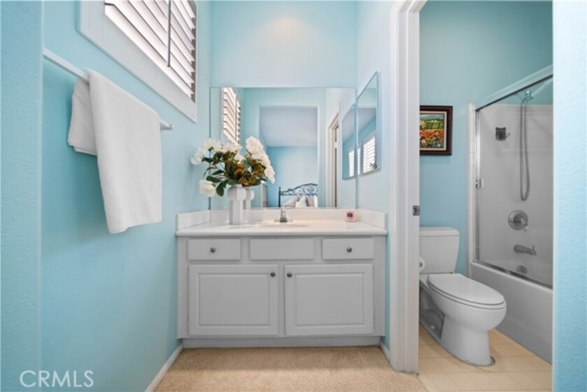 Welcome to Venturanza Resort Community, where stunning Plan C offers a spacious two-master-bedroom layout, an extra half bath, and a versatile bonus room—ideal for hobbies, fitness, or flexible living space. The inviting living area features oversized windows that frame picturesque outdoor views, complemented by a warm fireplace and sleek laminate flooring. Host gatherings with ease in the dedicated dining space, while the bright, cheerful kitchen boasts warm tile countertops, stainless-steel appliances, and a cozy casual eating nook—plus direct access to your own private patio for weekend barbecues. Upstairs, both well-appointed bedrooms serve as master suites, each with a generous walk-in closet. One suite includes a relaxing oval soaking tub and a separate shower. Thoughtful details throughout include plantation shutters, neutral tones, and ceiling fans. Additional highlights include a two-car attached garage with epoxy flooring and access to lush community grounds featuring a pool and spa. Enjoy a prime location near Tustin Sports Complex, Tustin Ranch Golf, shopping, and top-rated schools. Tree-lined streets provide peaceful living, while easy freeway and toll road access—just a mile away—adds everyday convenience. This is resort-style living made practical—don’t let it pass you by!