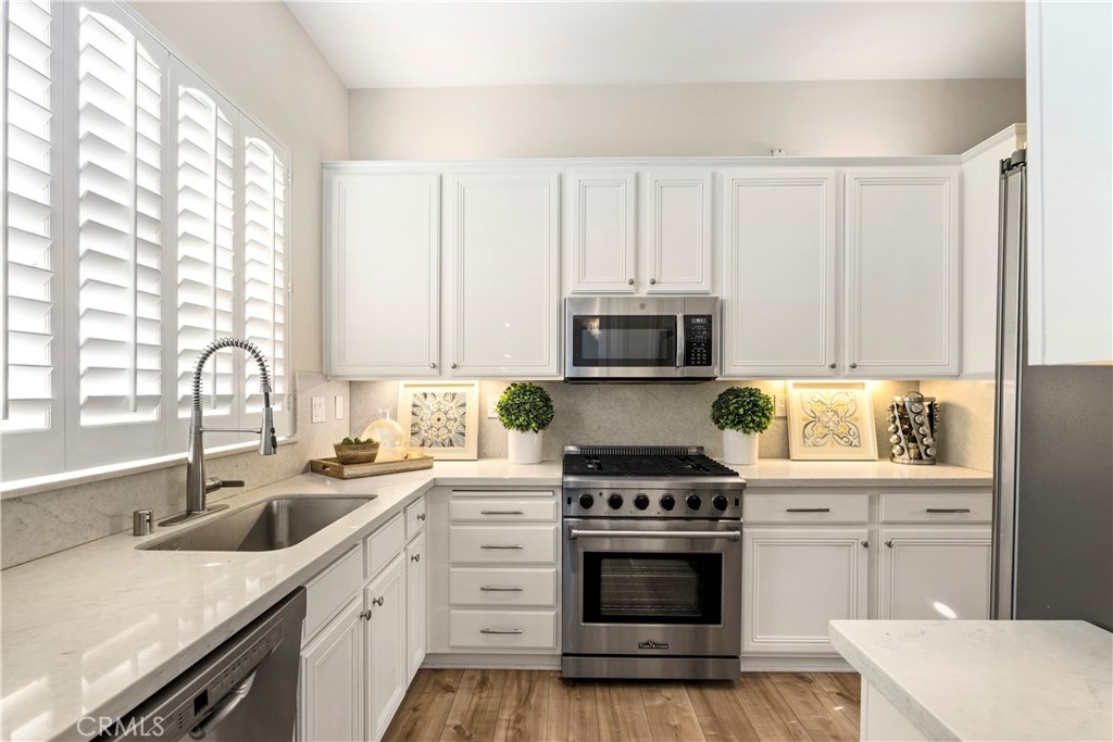 Welcome to this beautifully upgraded condo in the desirable VENTURANZA DEL VERDE community in Tustin Ranch, featuring resort style living. Located on a quiet interior corner close to the community pool. This popular floorplan features 3 BEDROOMS upstairs, main floor living, PLUS A LOWER-LEVEL BONUS ROOM and powder room leading to the ATTACHED 2 CAR GARAGE. As you walk through the front door you enter a spacious living room with custom stacked stone fireplace/rustic mantle & Quartz hearth which is adjacent to a dining room with MODERN LIGHTING and sliding doors opening onto the covered patio. The family room opens to the kitchen and offers a lovely balcony to enjoy your morning coffee. The cheery kitchen boasts popular white cabinetry, QUARTZ counters, Professional THOR STAINLESS STEEL gas range/oven & GE microwave, and dishwasher as well as large single basin sink. Numerous upgrades include wide baseboards, plantation shutters, blinds, vertical shades, custom paint colors and beautiful upgraded vinyl wood look plank flooring can be found thru-out the main floor and lower-level bonus room. The lower-level bonus room could be used as a playroom or office. The laundry is conveniently located in the lower-level bonus room. Upstairs, the large master bedroom suite overlooks the beautiful tree lined walkways. The master bath has modern oversized ceramic tile flooring, dual vanity sinks, walk-in shower, soaking tub, makeup vanity and a huge walk-in closet secondary to the separate master bedroom mirrored closet. The hallway leads to two additional spacious guest bedrooms and hall bath. The 2 CAR GARAGE was upgraded with epoxy floor coating & custom built in cabinetry. The HOA FEE INCLUDES WATER & TRASH and a beautiful resort-like pool, spa and BBQ area. LOCATED DIRECTLY ACROSS FROM TUSTIN RANCH SPORTS PARK which offers lighted tennis courts, soccer fields, basketball courts, ball fields, a running track, tot lot and concessions. Close to award winning schools!! ~ Tustin Ranch Elementary, Pioneer Middle & Beckman High School. Just a few blocks to Tustin Marketplace shopping, dining & theaters. Enjoy a round of golf at the Tustin Ranch Golf Club or take a hike in Peters Canyon. Just minutes to major freeways.
