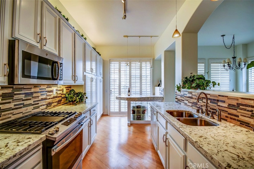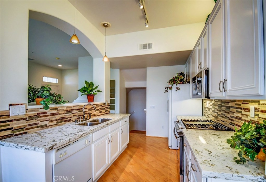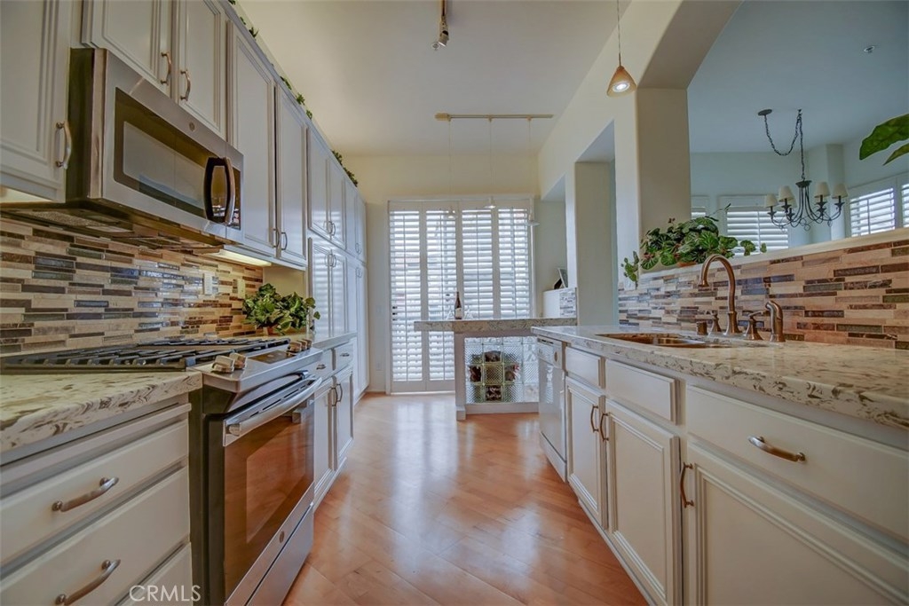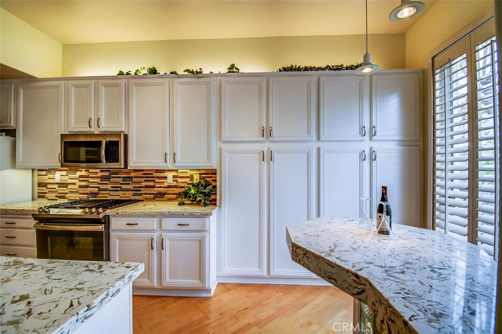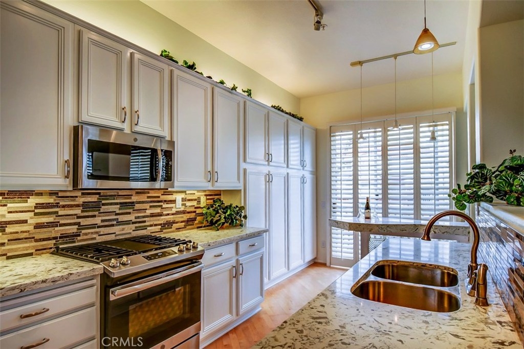 Welcome to the Community of Venturanza...Resort Like is just the right tone for This Corner Home, featuring one of the Largest Driveways in the complex; being just steps from Tustin Ranch Golf Club. A Newly Remodeled Kitchen greets you with a Wall of ample Cabinets,tons of Counter Space on thick quartz, a Stainless Steel 5 Burner,"Center Griddle" stove..Wood Flooring,encompasses the Kitchen, with a Designer Lit Breakfast Bar/Entertainers Wine Nook, pouring onto a private Patio, completed with Water & Gas supplied for the prefect BBQ, adorned with your own grown Herbs & Spices. The Large, Open space Living /Dining Area features a Corner Fireplace,Surround Sound System, Enclaved Entertainment area, with vast natural Lighting from Custom Shutters on Every Window( in the Entire Home).. For warm Summer Days this Home Features a Brand New Air conditioning System; or Take a relaxing Bath in the oversized Soaking tub Hidden in the Master Retreat!... Each Bedroom suite Features a Full Bathroom, tall Ceilings and Lots of Closet Space, the Master has A Large Walk-In Closet with Custom Shelving, Drawers/cabinets, and Yes, a vast shoe organizer for those designer "kicks".. Drive or Take a Bike ride out of your Oversized 2 car Garage with LOTS OF STORAGE; allowing you to engage in year round activities. Enjoying one of the Best Central Locations, along with Award Winning Schools, Sports Parks, Bike /Hiking Trails, Shopping and Dining; This is a Home that demands to be viewed.