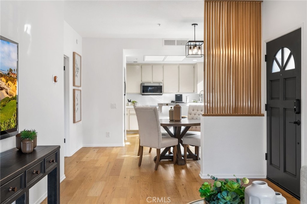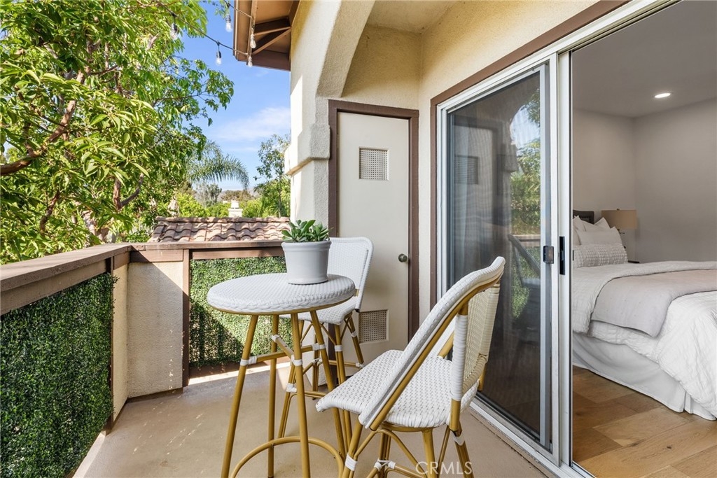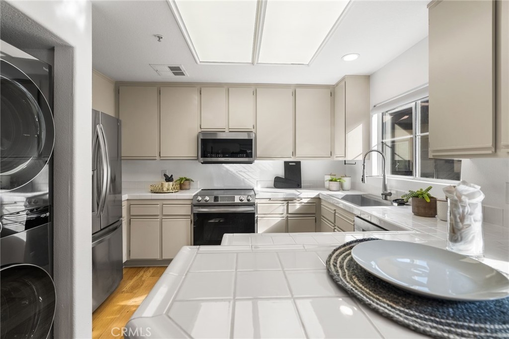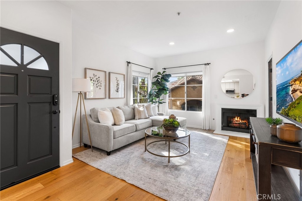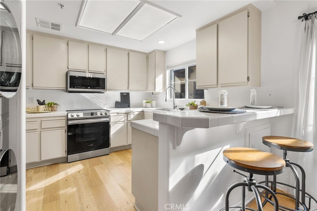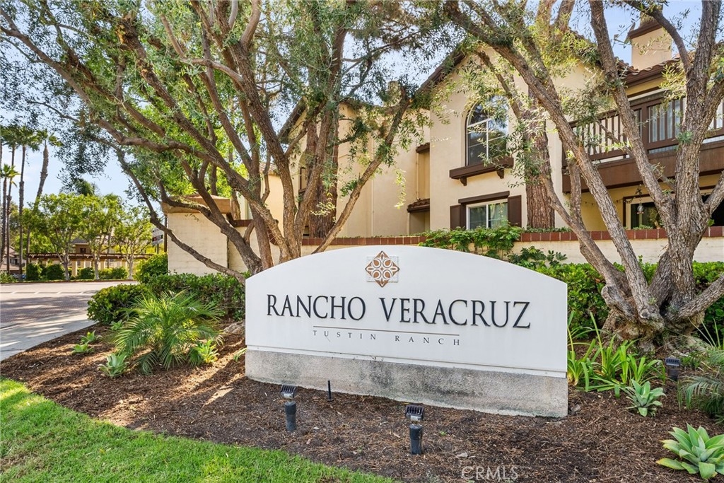 Welcome to Rancho Veracruz, the coveted golf course community! This third-level, one-bedroom residence boasts a serene location with abundant natural light and steps away from the community pool and gym. The spacious living room features a cozy fireplace, while the dining area extends seamlessly into the kitchen with a convenient breakfast bar. Upgraded throughout with engineered hardwood, updated kitchen and bathroom. The bedroom offers a walk-in closet and built-in cabinets near the bathroom provide ample storage for linens. An in unit laundry makes this property ideal. Entertaining is effortless with the open layout connecting the kitchen, living, and dining areas. Enjoy outdoor grilling on your private balcony, or take advantage of community amenities such as two sparkling pools with spas, an exercise center, and a clubhouse. Association dues cover water and trash. Unit is entitled to 2 vehicles, one is designated to the coveted one car garage and the other one can park anywhere in an uncovered space. The perfect blend of comfort and lifestyle at Rancho Veracruz. Don't miss out on this great opportunity!